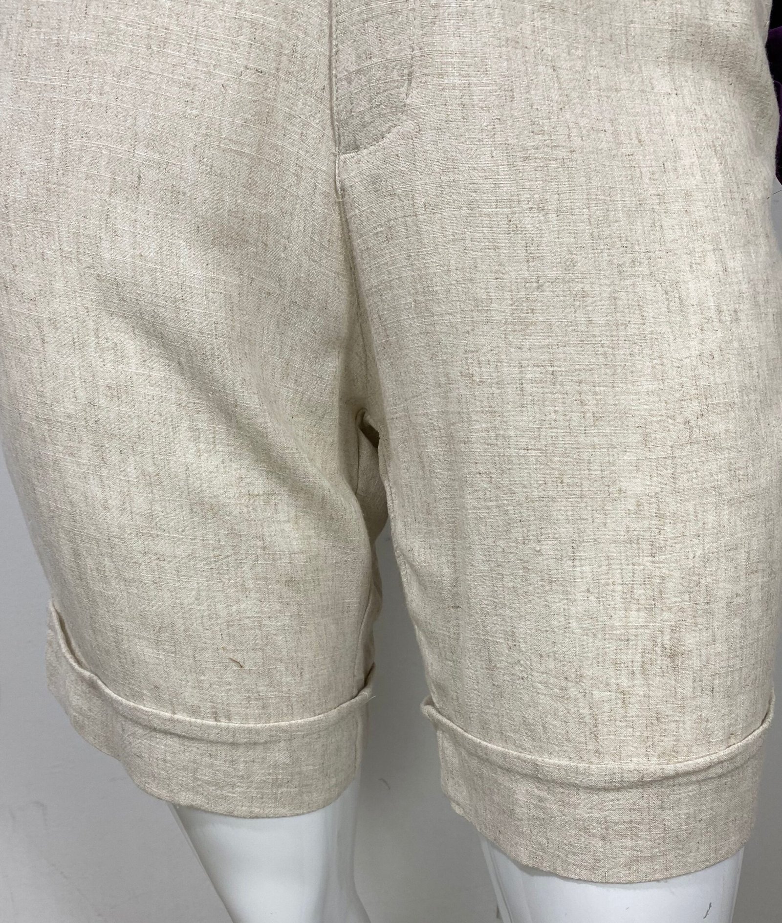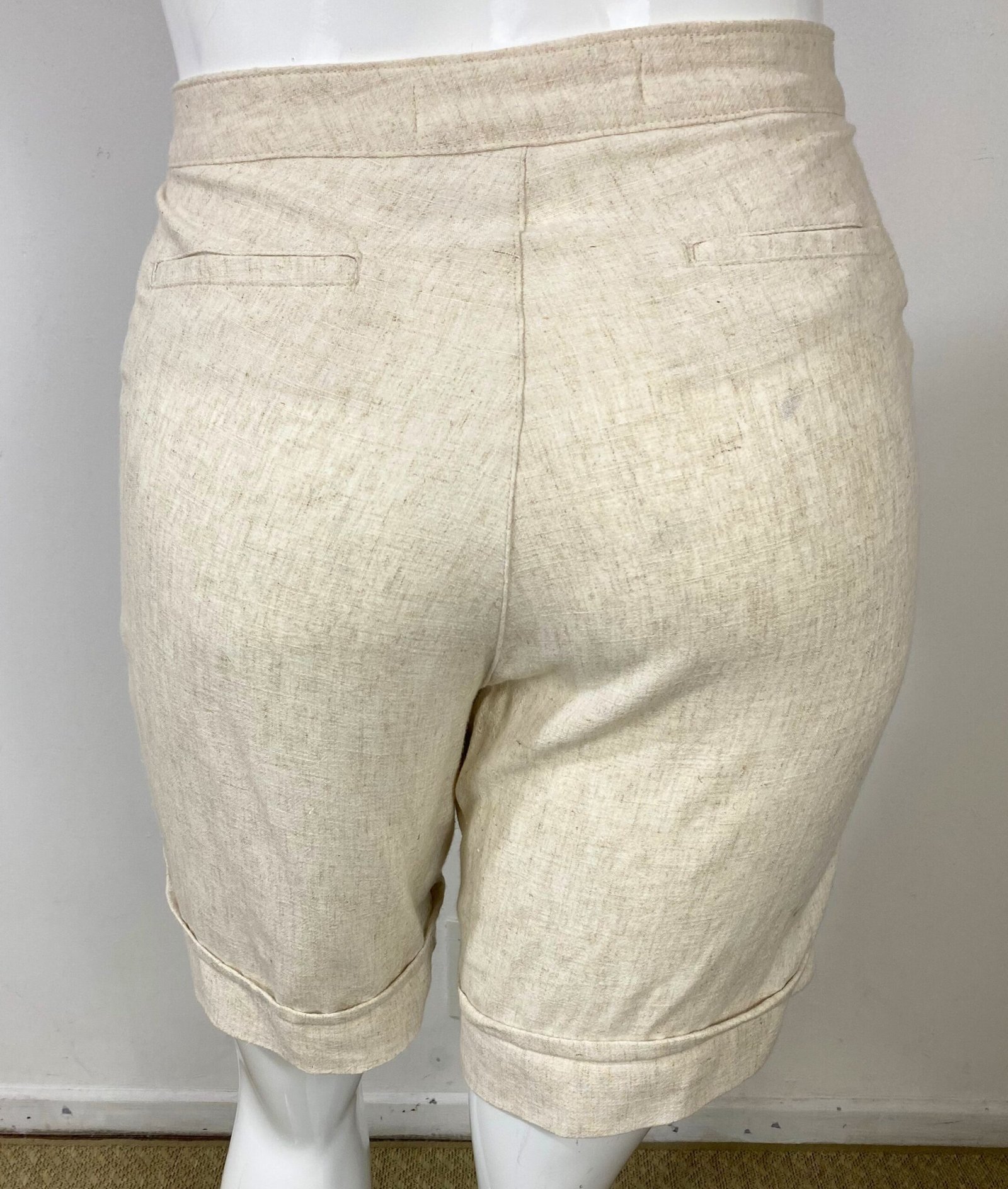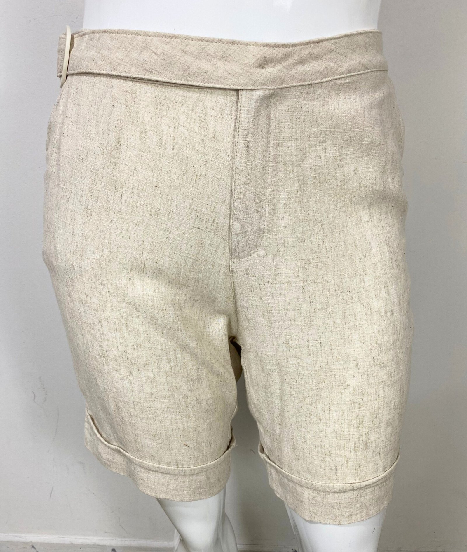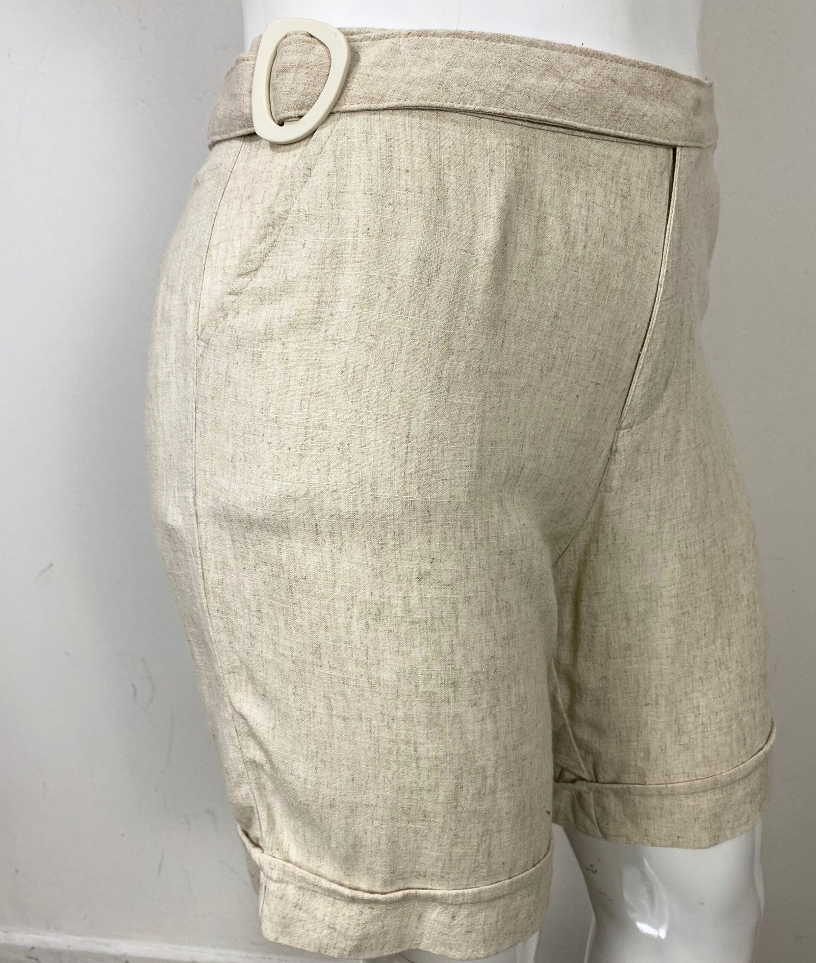 Bermuda em viscolinho na cor bege claro, com cintura alta e fechamento frontal por zíper e botão. Possui bolsos frontais e faixa fixa na frente com fivela de acetato. Barra italiana.