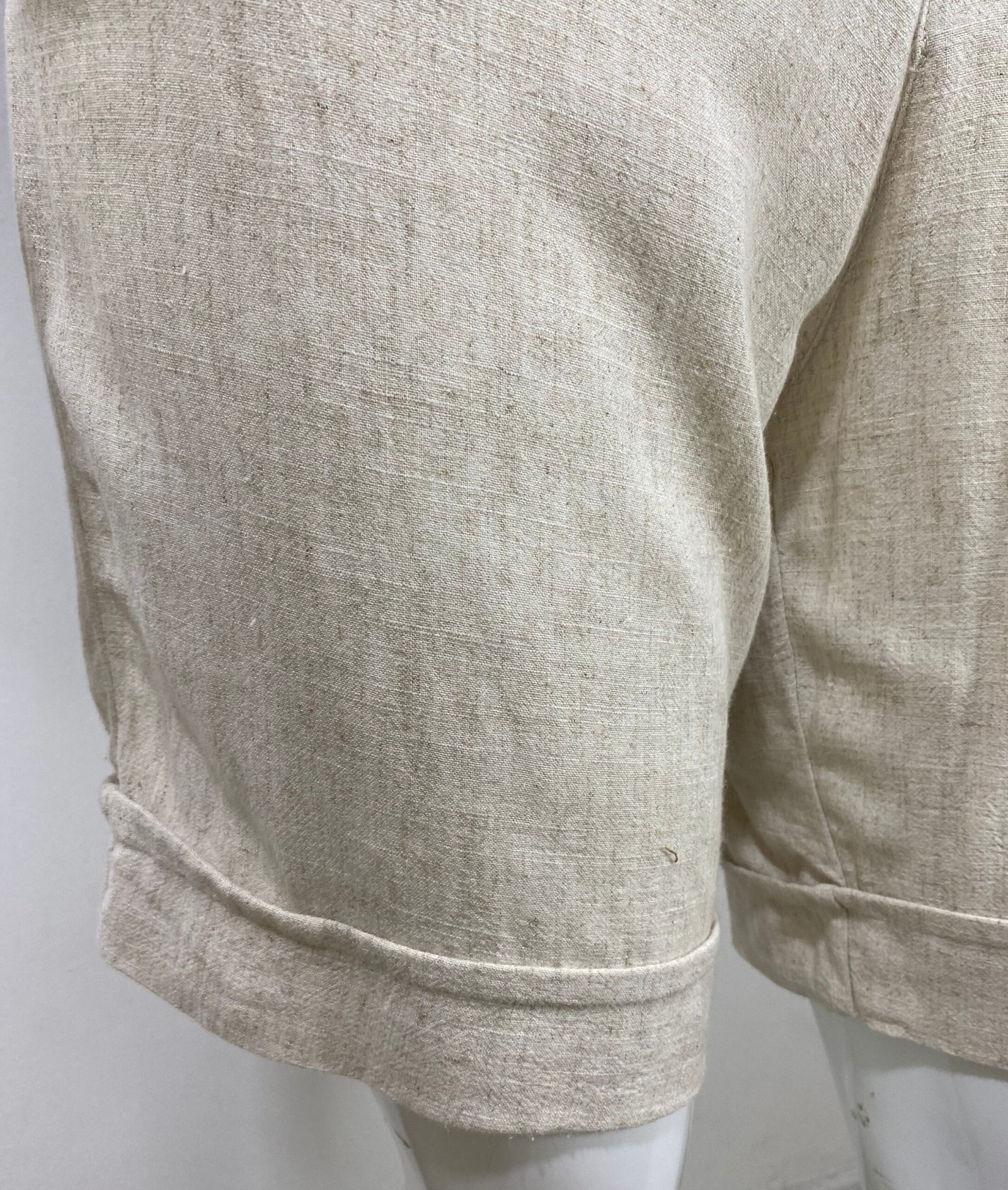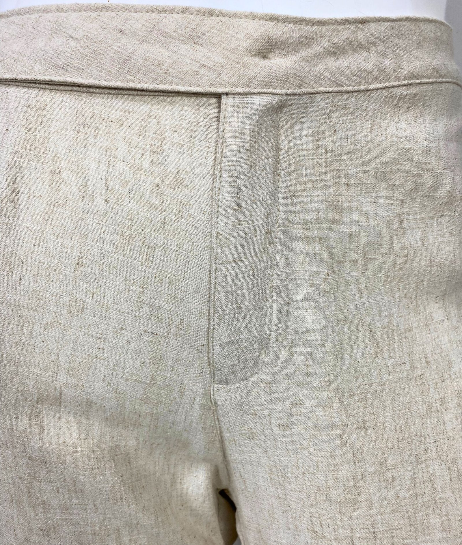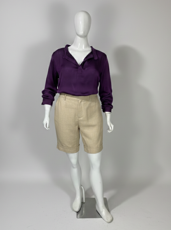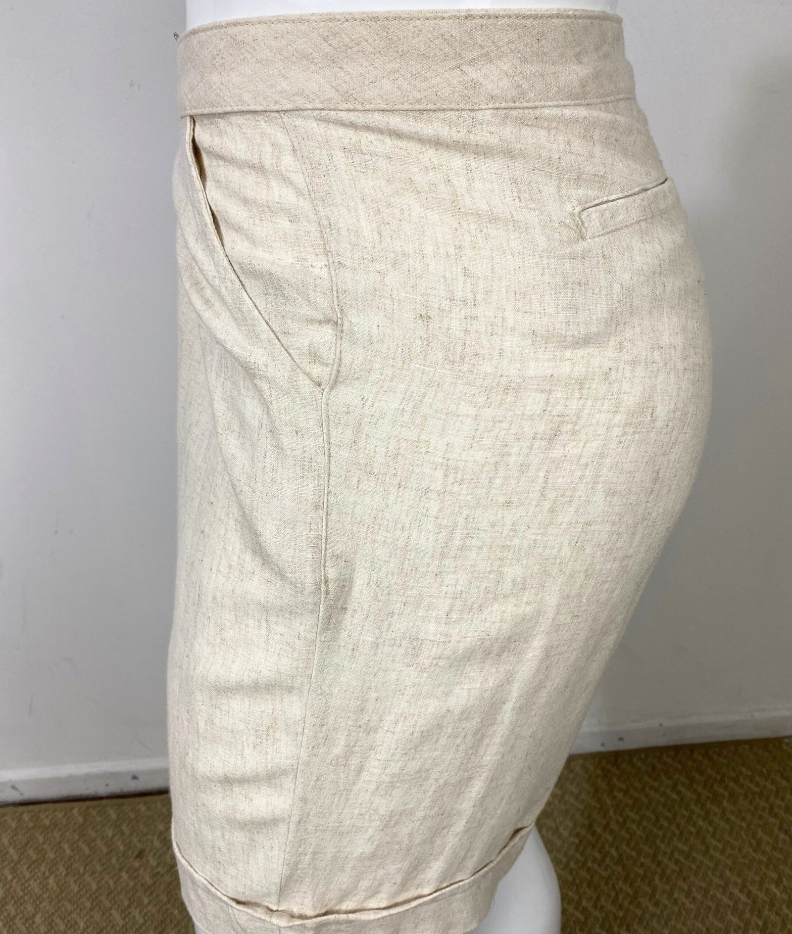 Bermuda em viscolinho na cor bege claro, com cintura alta e fechamento frontal por zíper e botão. Possui bolsos frontais e faixa fixa na frente com fivela de acetato. Barra italiana.