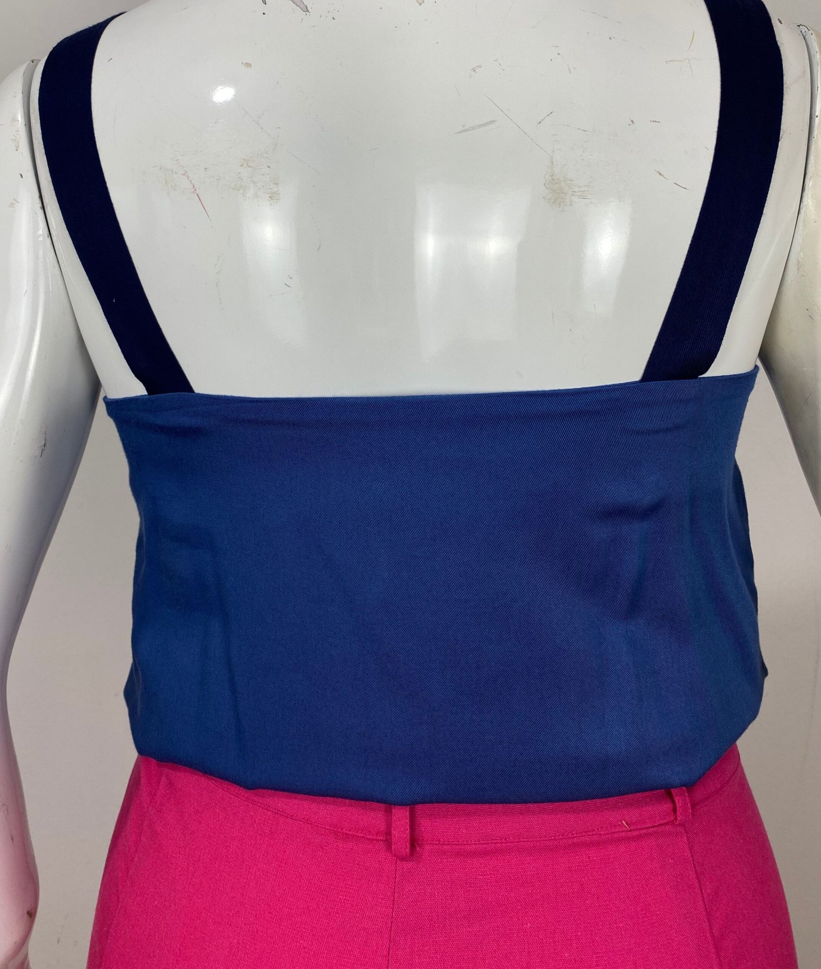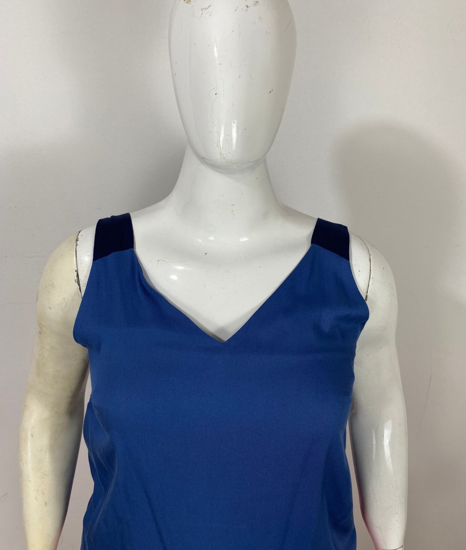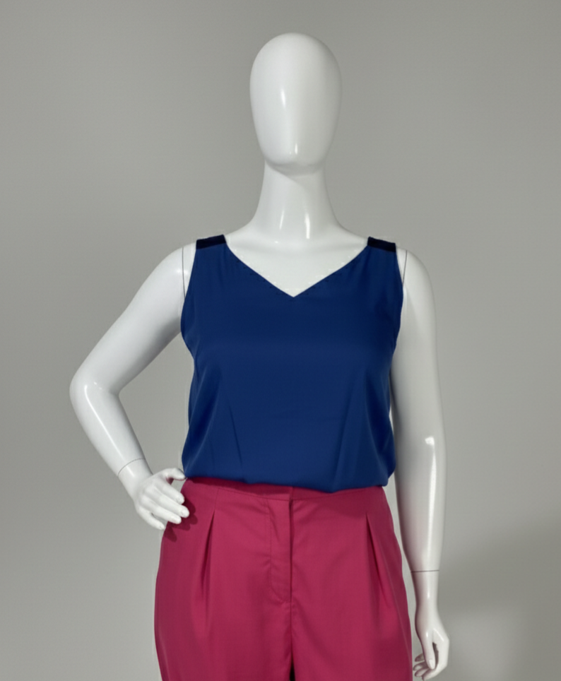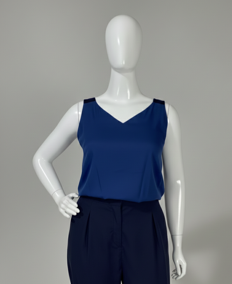 Blusa regata confeccionada em tecido leve, em dois tons de azul. Possui decote em V na parte frontal e decote reto nas costas, com alças largas. Apresenta forro no busto, garantindo melhor acabamento e conforto. O tecido é altamente fresco, macio e respirável.