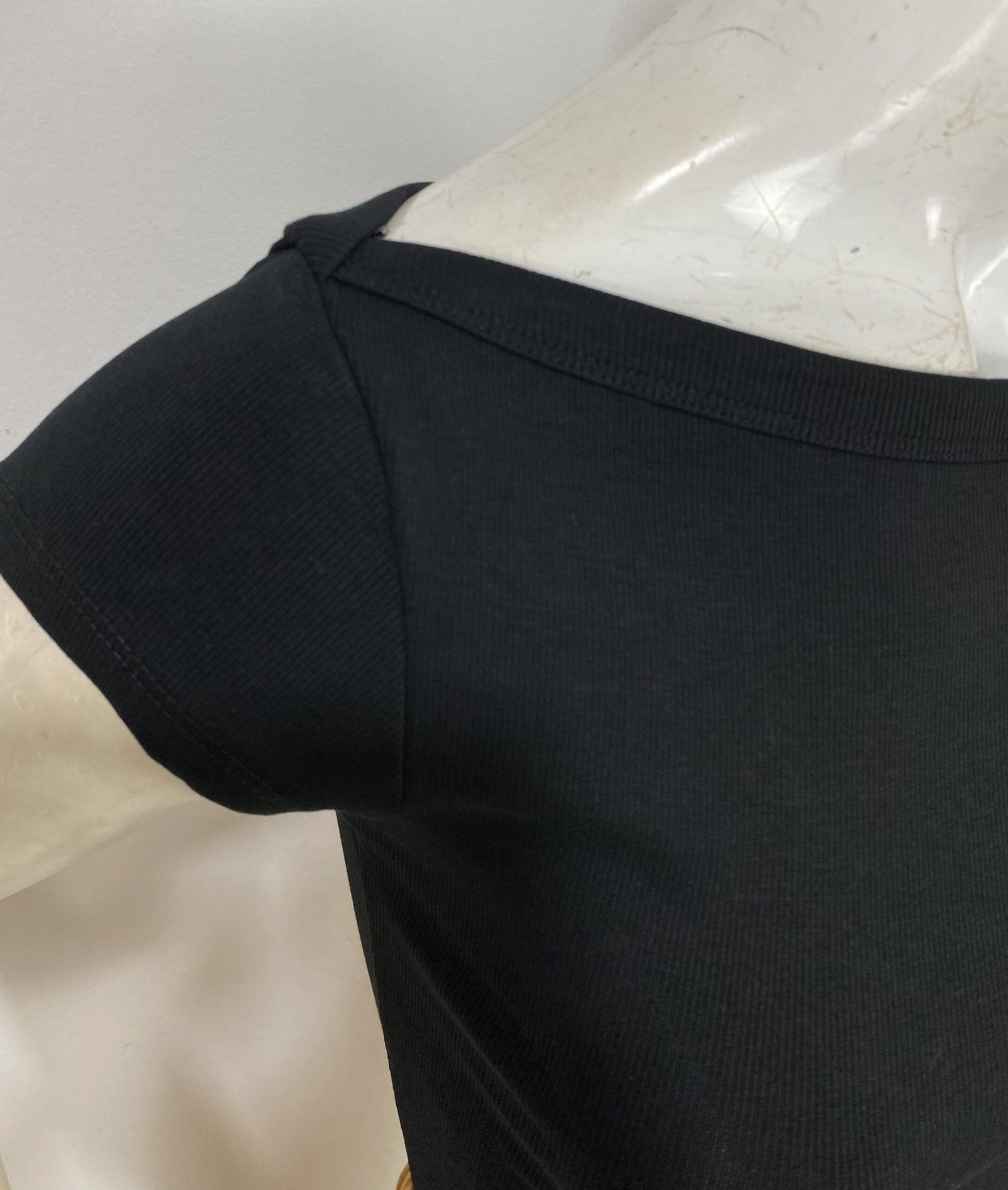 Camiseta confeccionada em malha canelada, com decote canoa e mangas curtas. Gola em ribana para acabamento firme. Todas as medidas foram aferidas sem esticar a peça.