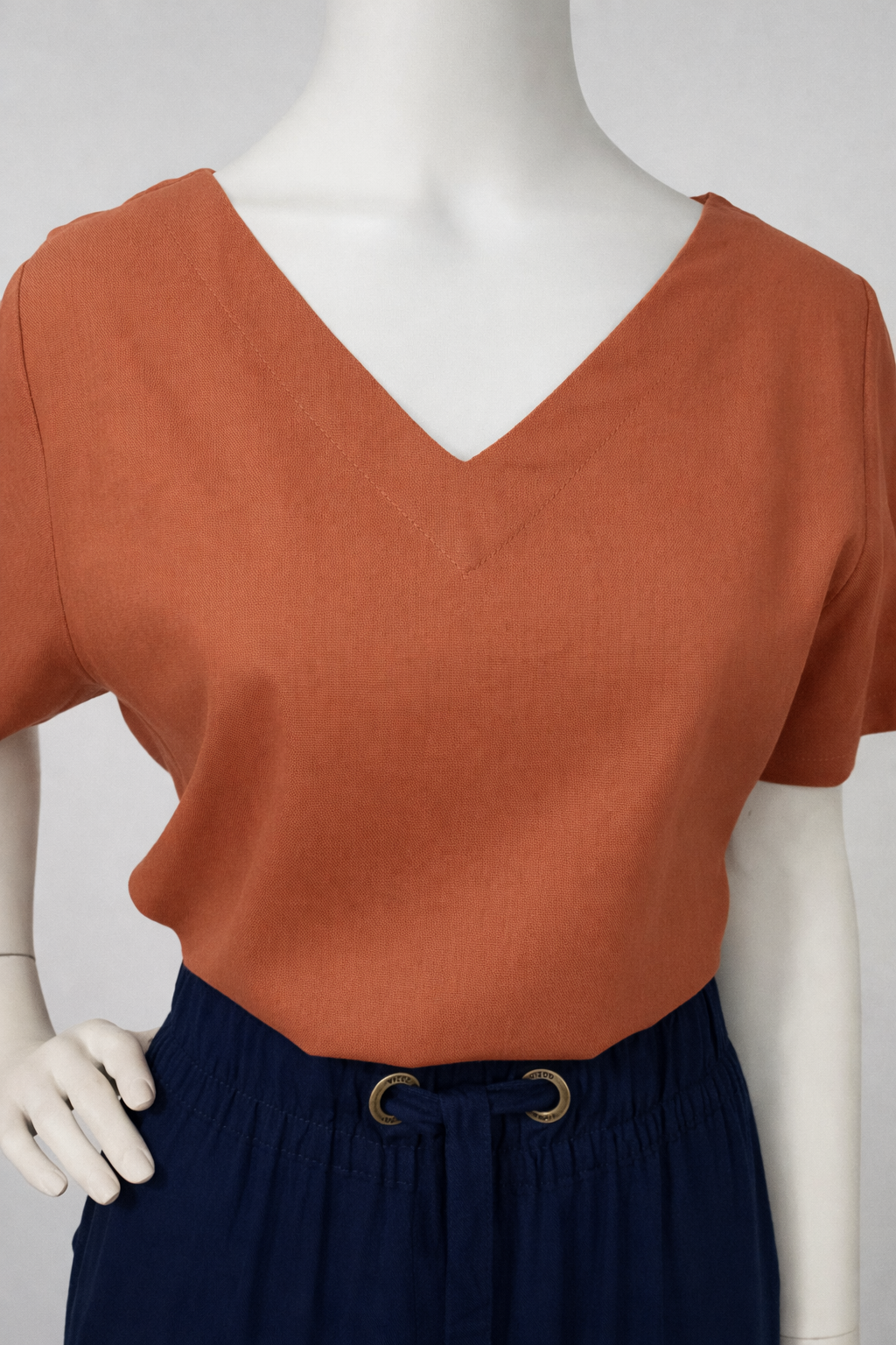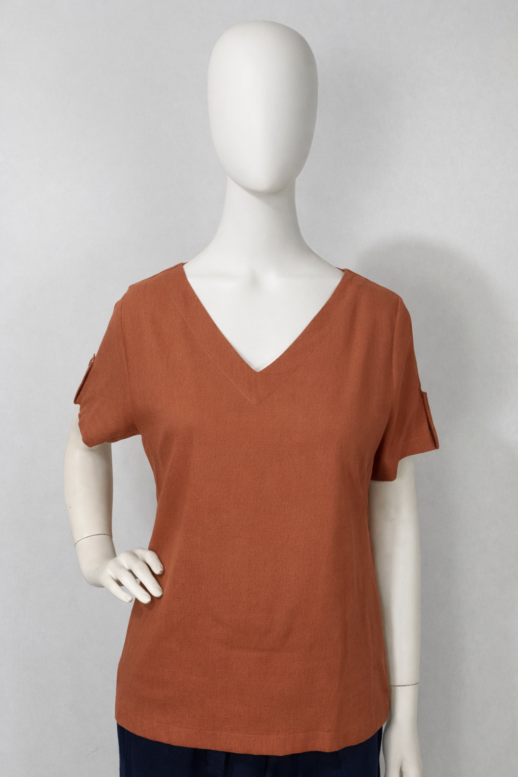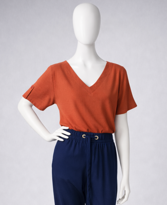 Blusa em tom terracota, manga curta, comprimento regular e decote em V.
