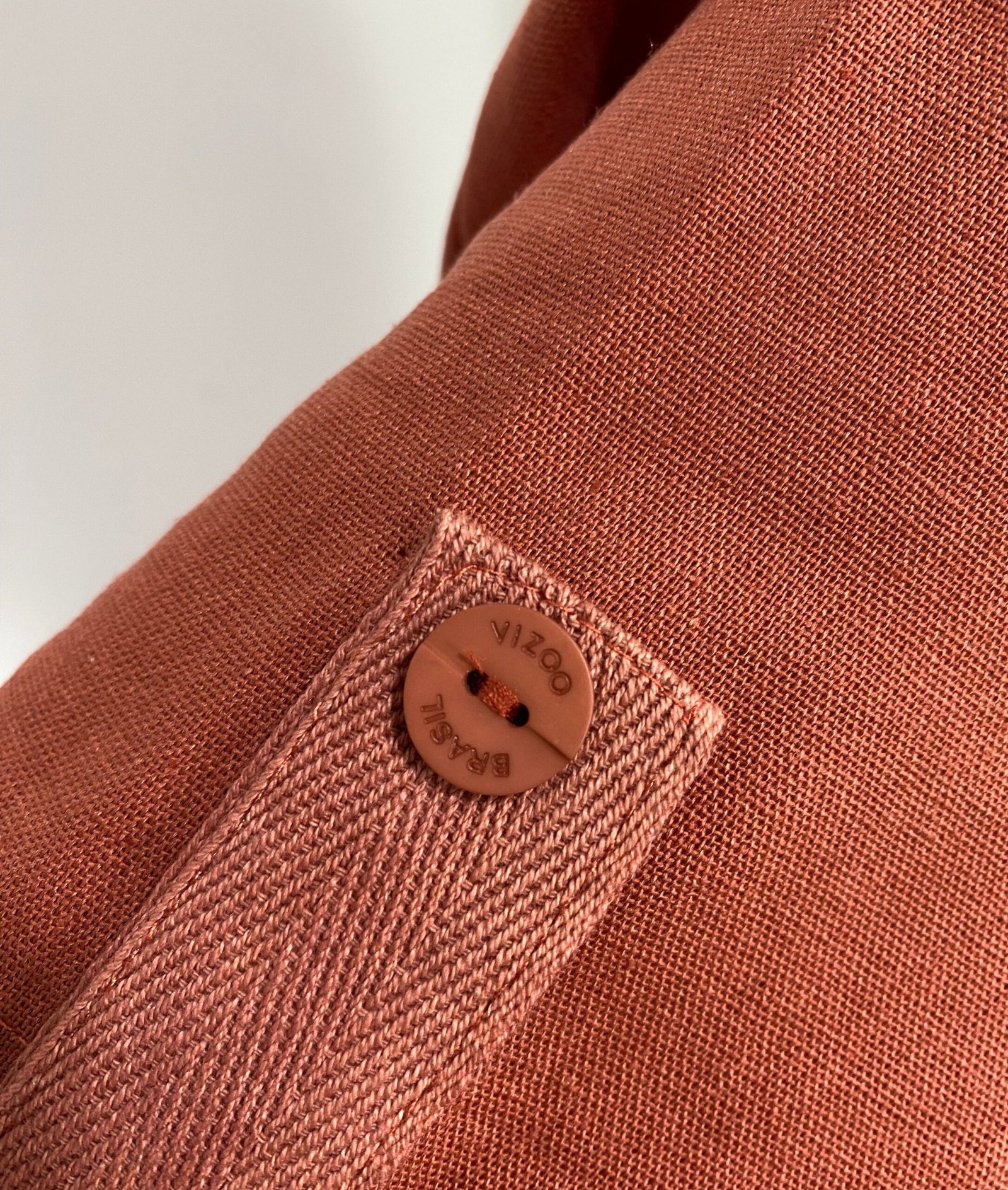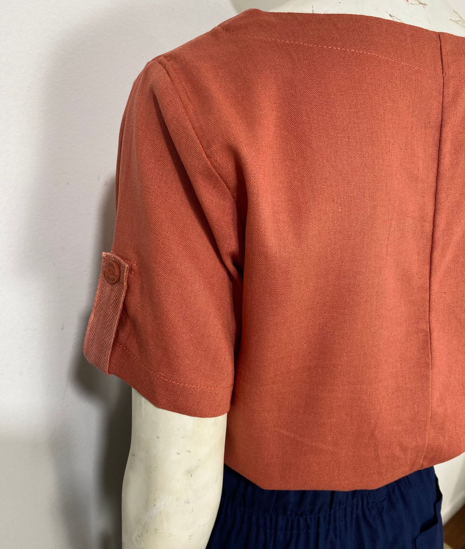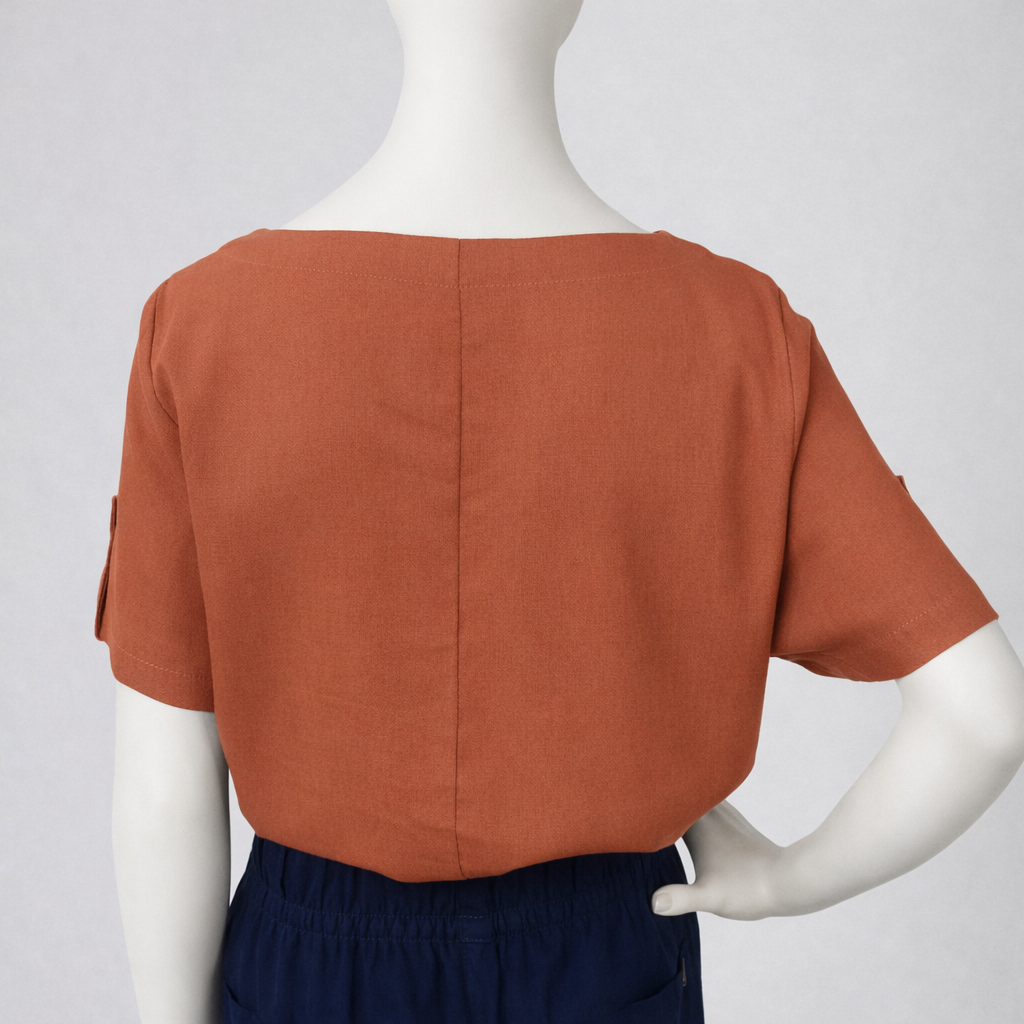 Blusa em tom terracota, manga curta, comprimento regular e decote em V.
