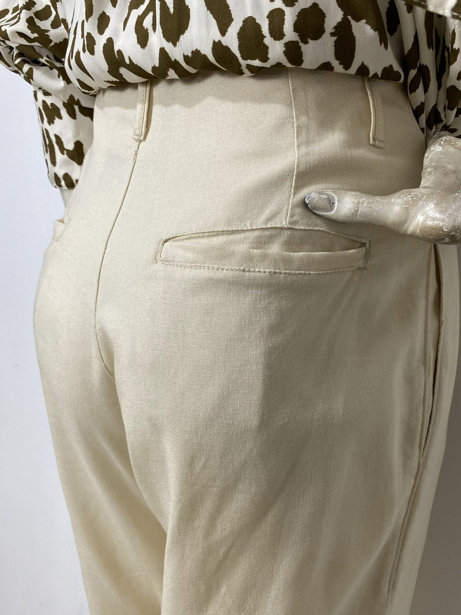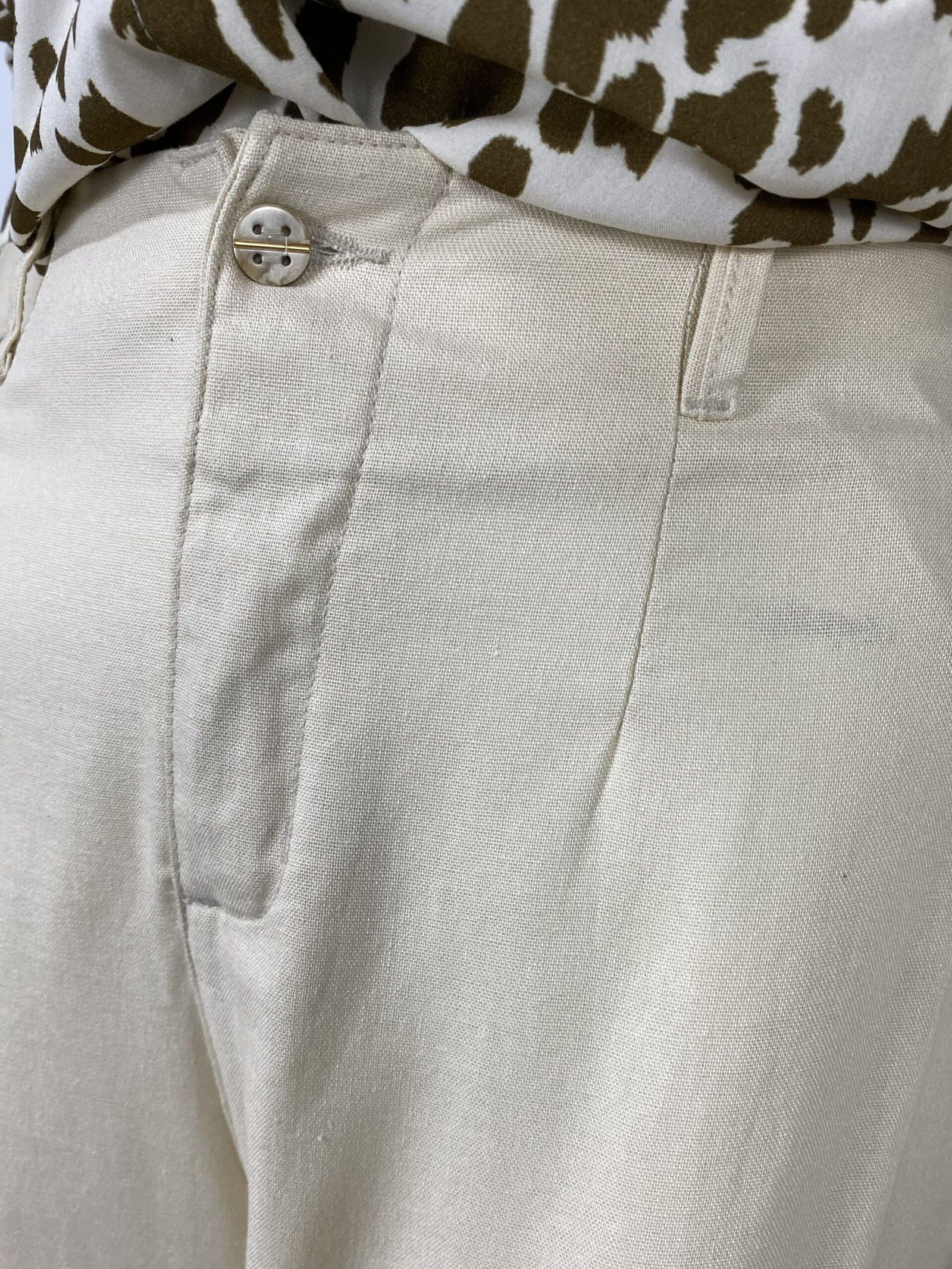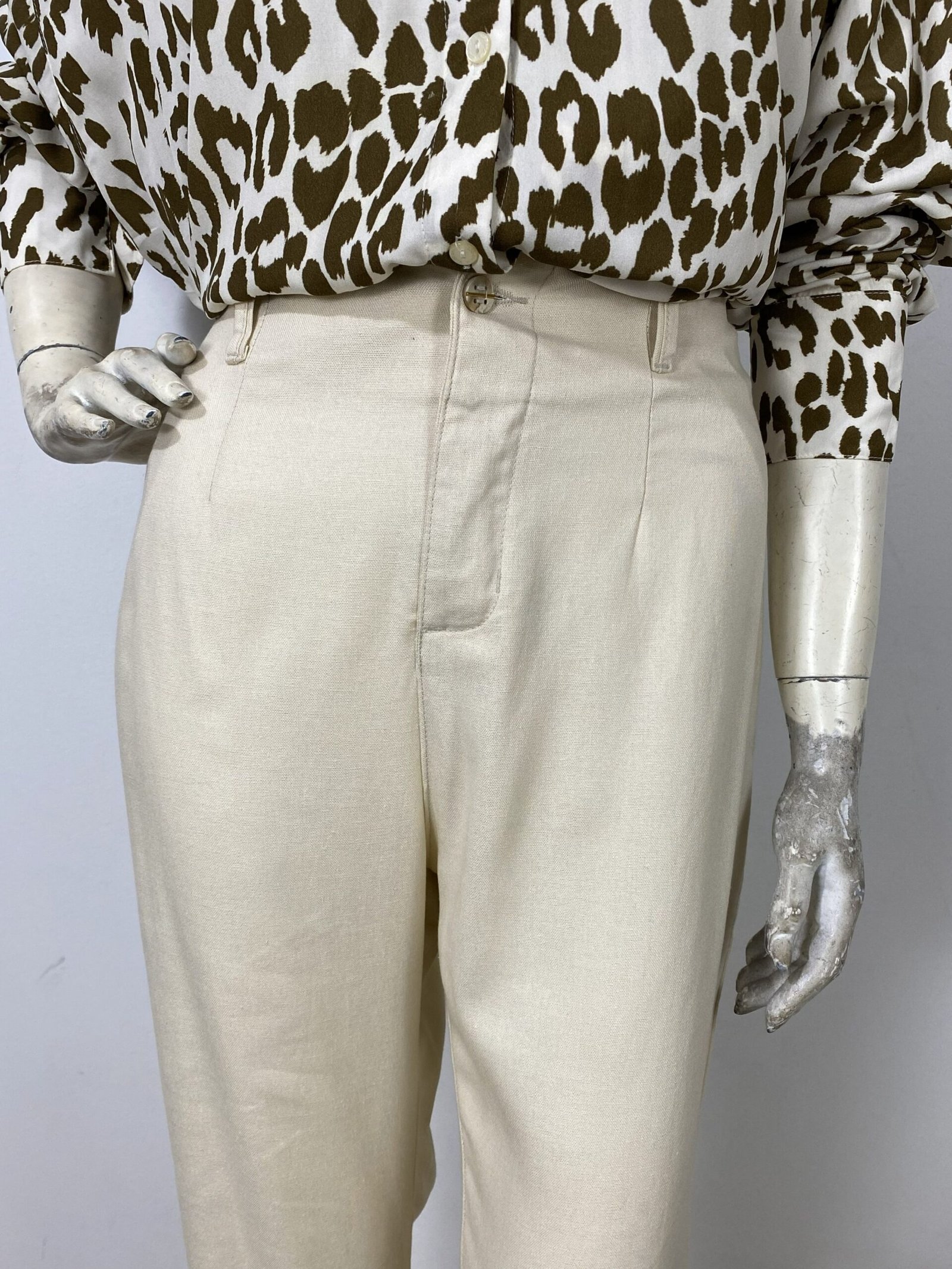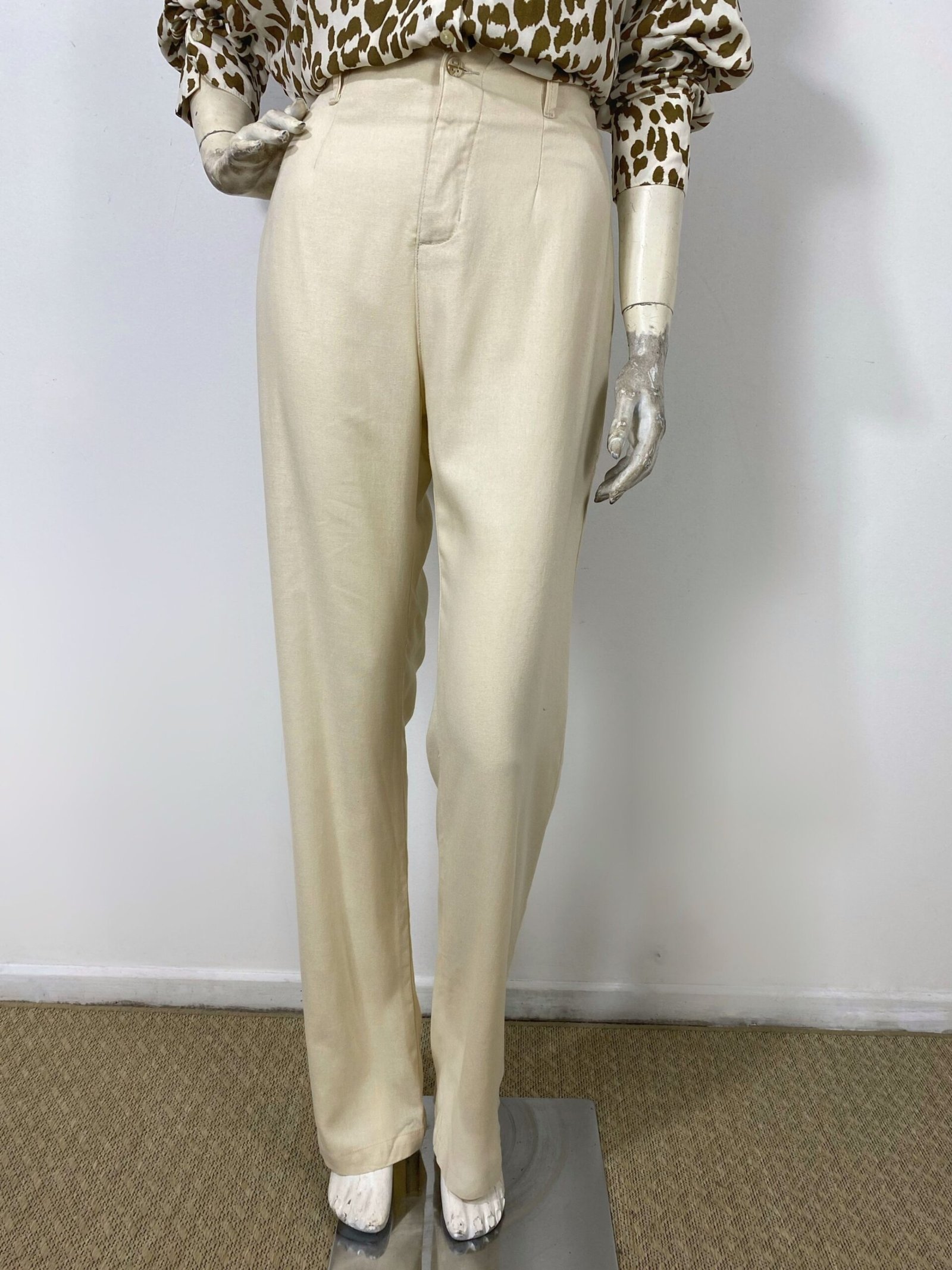 Calça bege claro confeccionada em viscolinho, com modelagem reta. Possui cintura alta, bolsos faca frontais, bolsos traseiros embutidos e passantes para cinto e faixas. O fechamento é frontal, em botão e zíper.