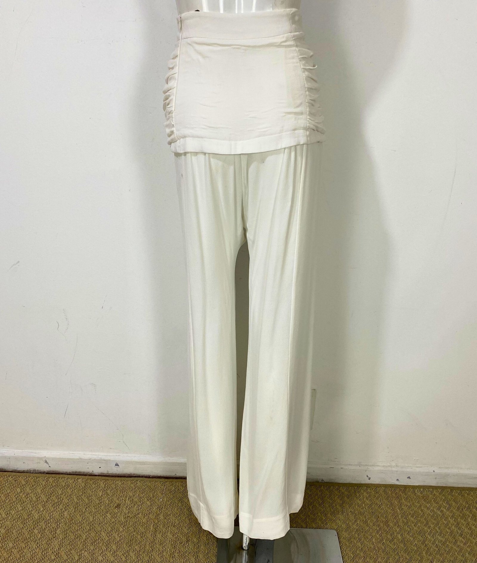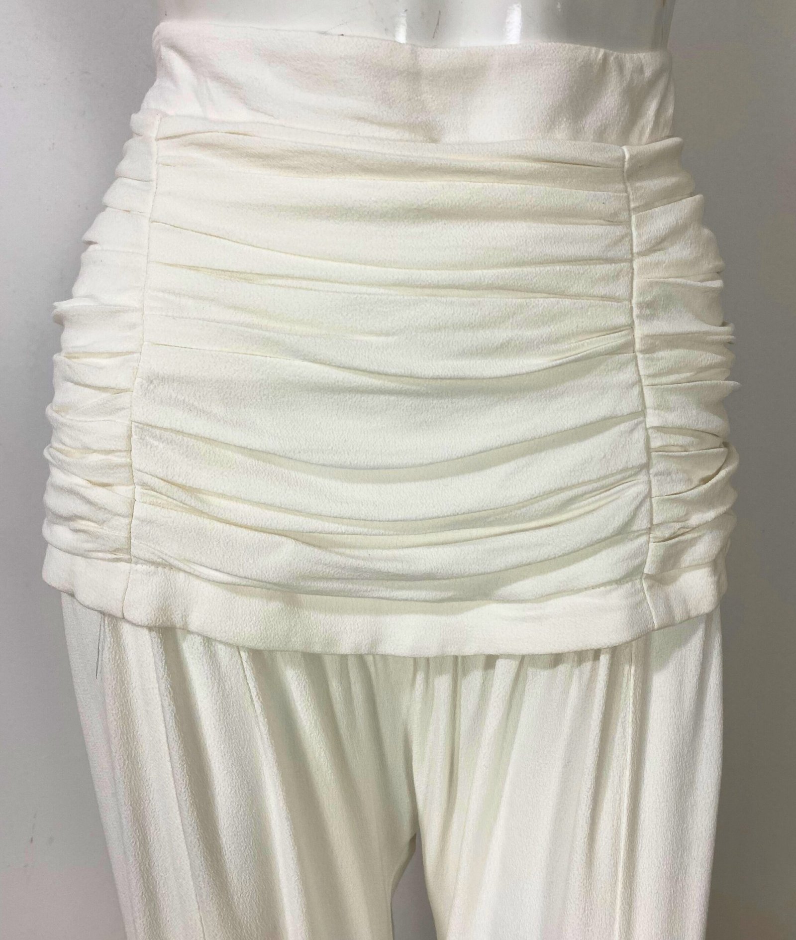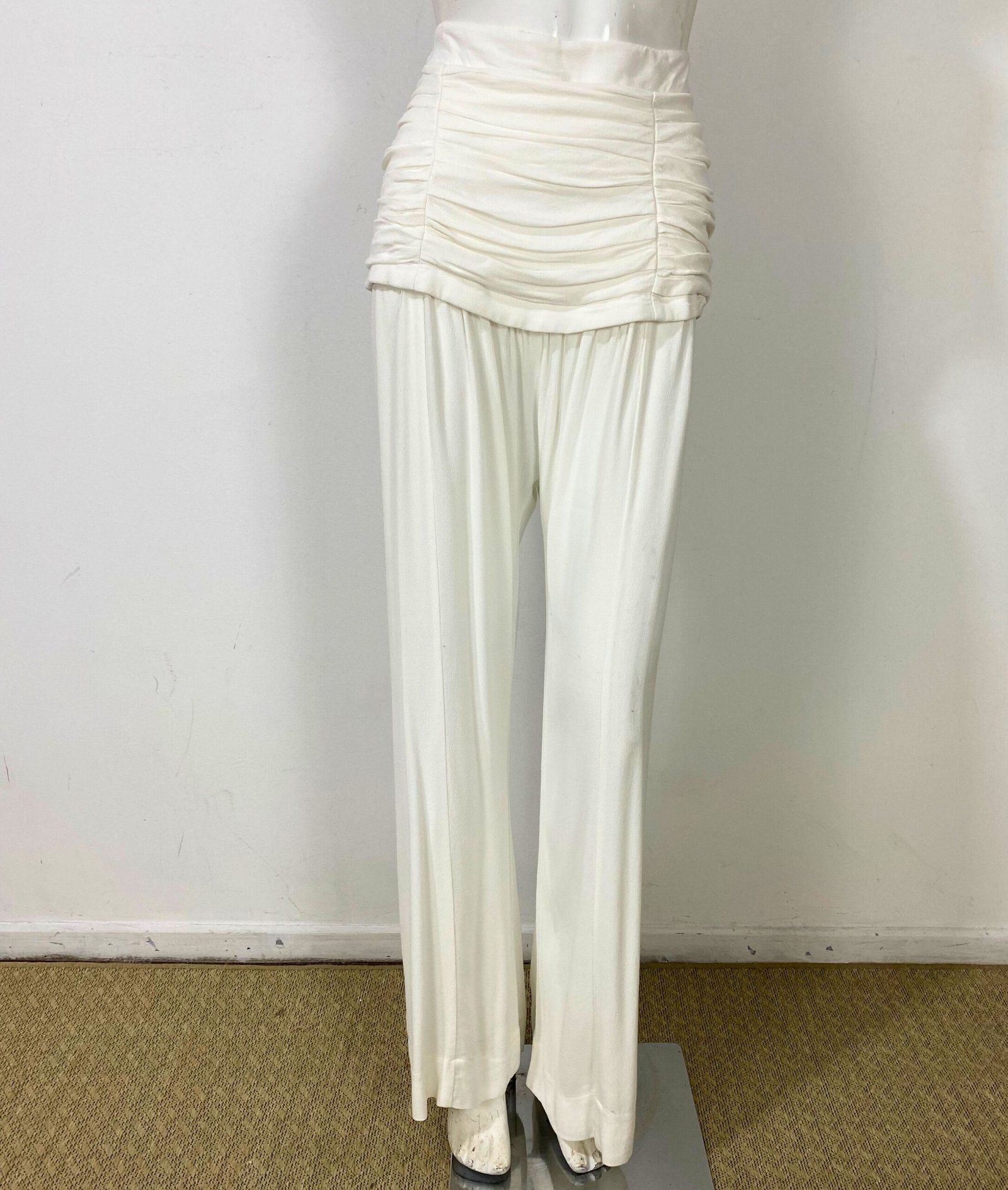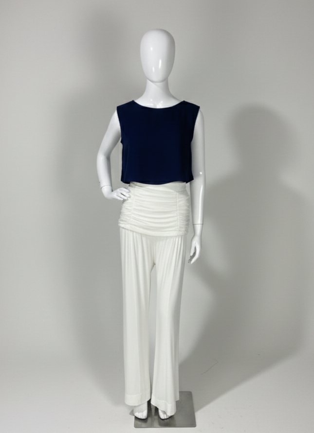 Calça pantalona em crepe de viscose na cor off-white, com modelagem de cintura alta e caimento fluido e elegante. Apresenta drapeado estruturado no cós, valorizando a silhueta, com fechamento por zíper lateral invisível. Possui forro interno localizado na região do drapeado, garantindo conforto e melhor acabamento. Modelo clean, sem bolsos.