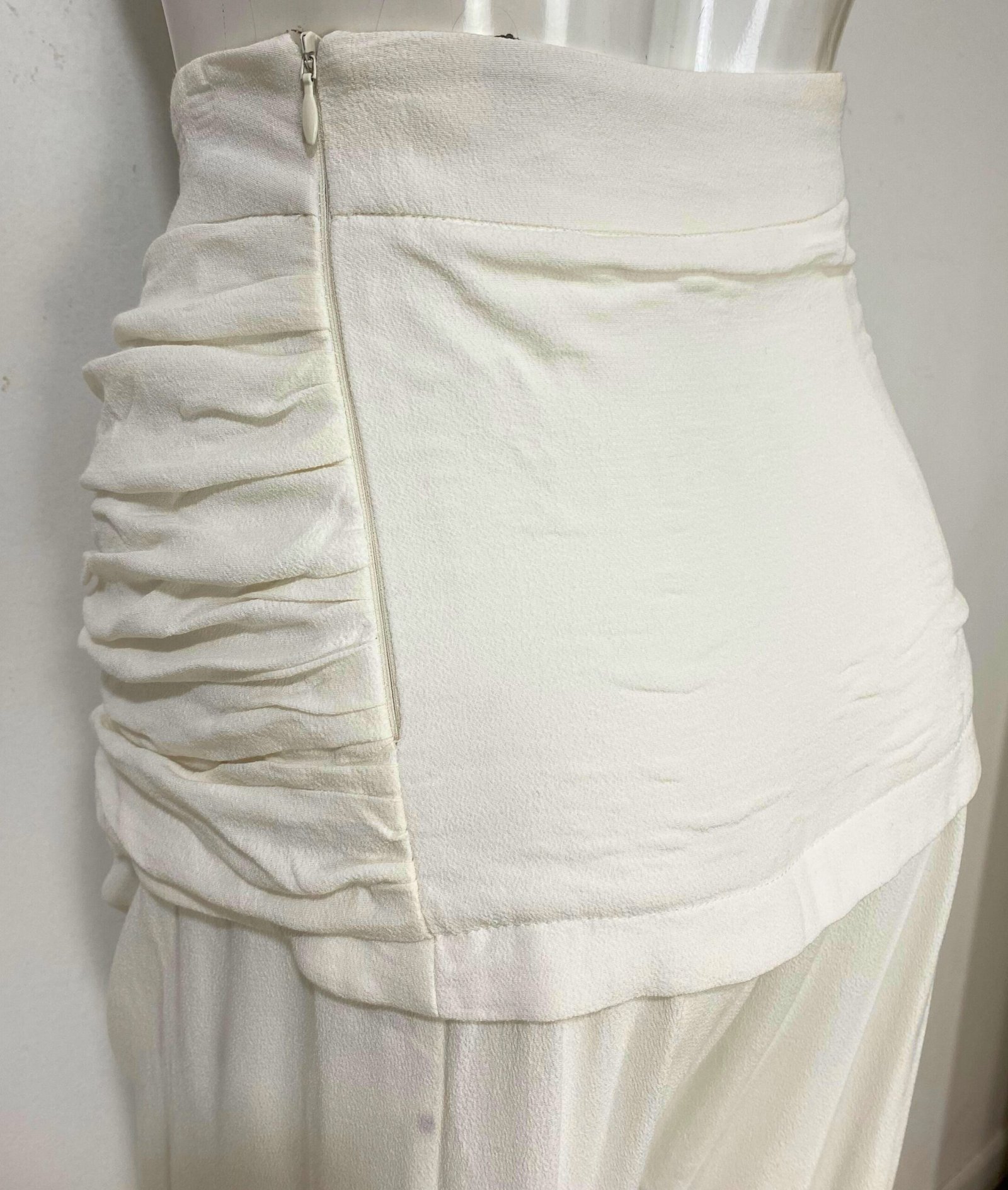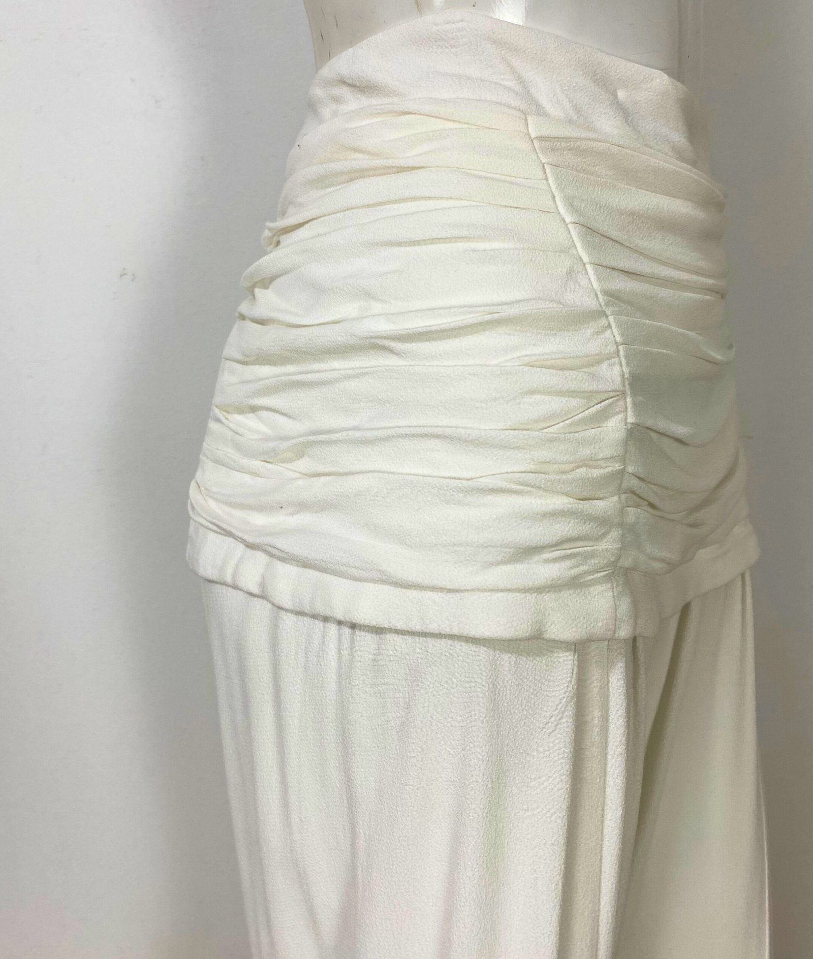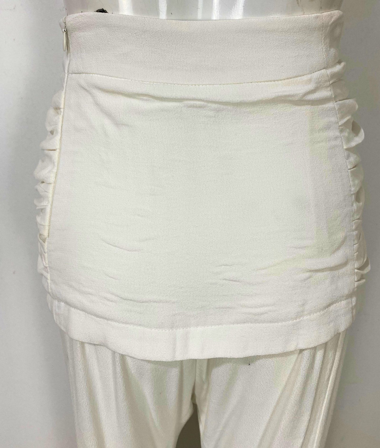 Calça pantalona em crepe de viscose na cor off-white, com modelagem de cintura alta e caimento fluido e elegante. Apresenta drapeado estruturado no cós, valorizando a silhueta, com fechamento por zíper lateral invisível. Possui forro interno localizado na região do drapeado, garantindo conforto e melhor acabamento. Modelo clean, sem bolsos.
