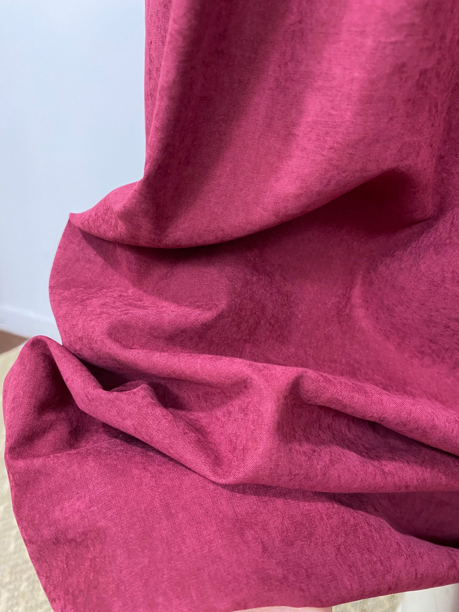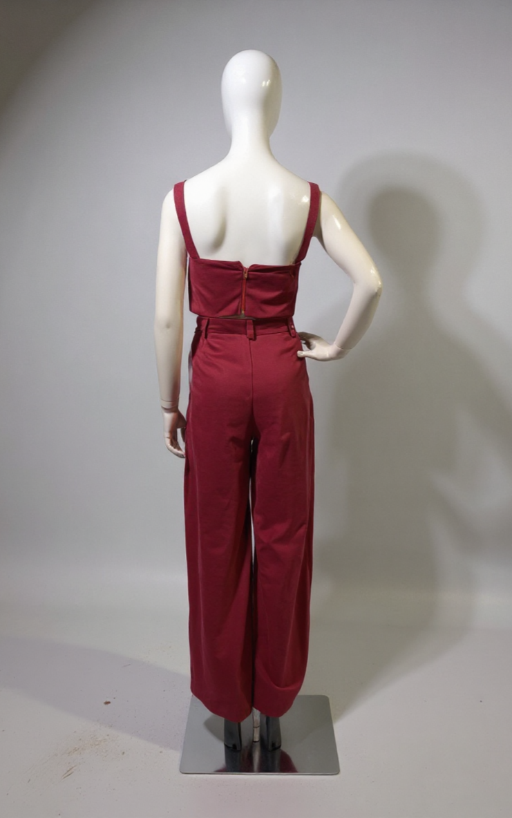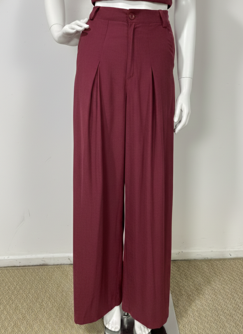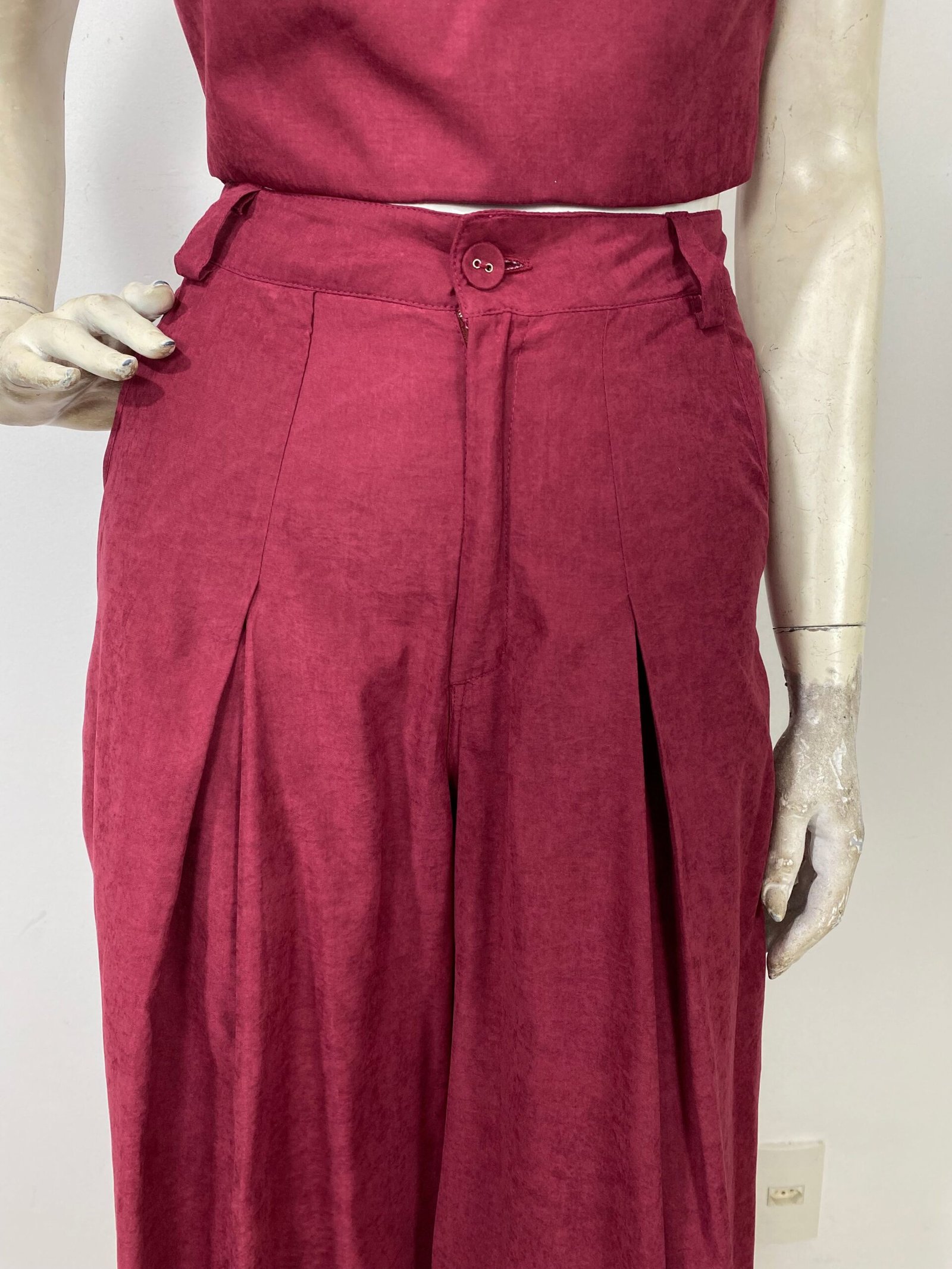 Calça pantalona bordô de cintura alta. Possui bolsos tipo faca, fechamento frontal por zíper e botão, além de duas pregas fêmeas na parte frontal. O botão é encapado com o mesmo tecido, garantindo um acabamento uniforme.