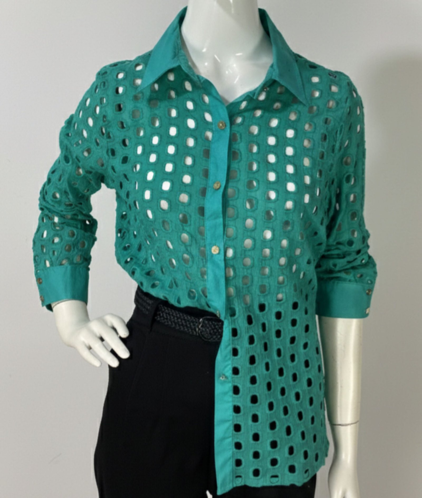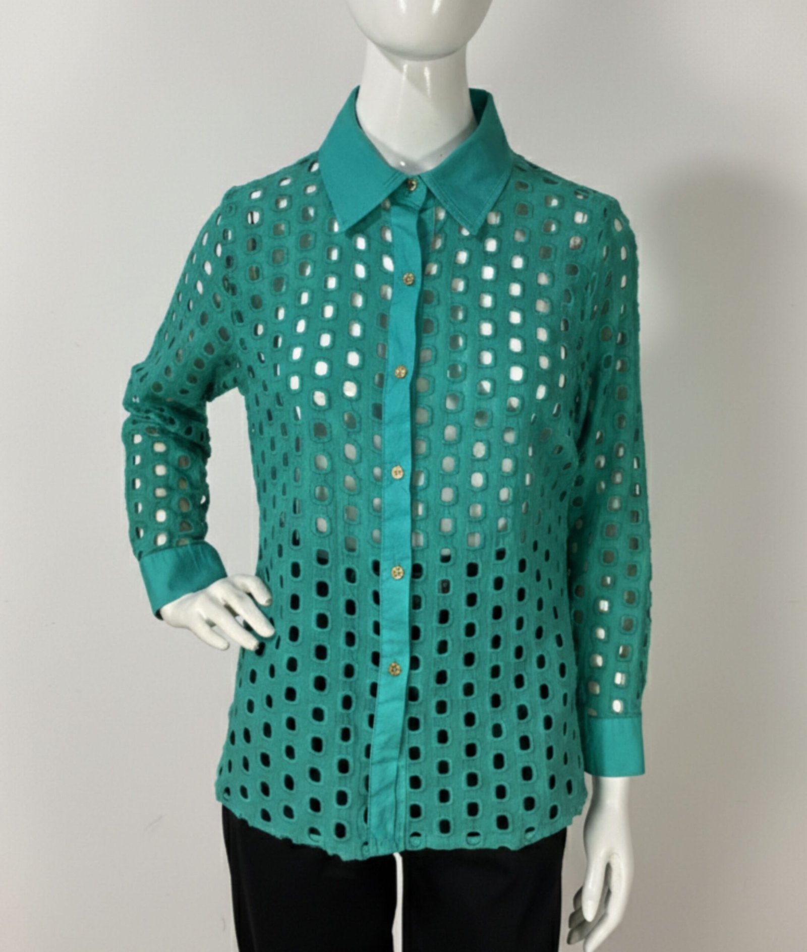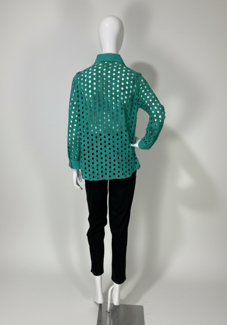 Camisa verde de manga longa, confeccionada em laise com padrões geométricos quadrados vazados. Possui fechamento frontal por botões e botões nos punhos.