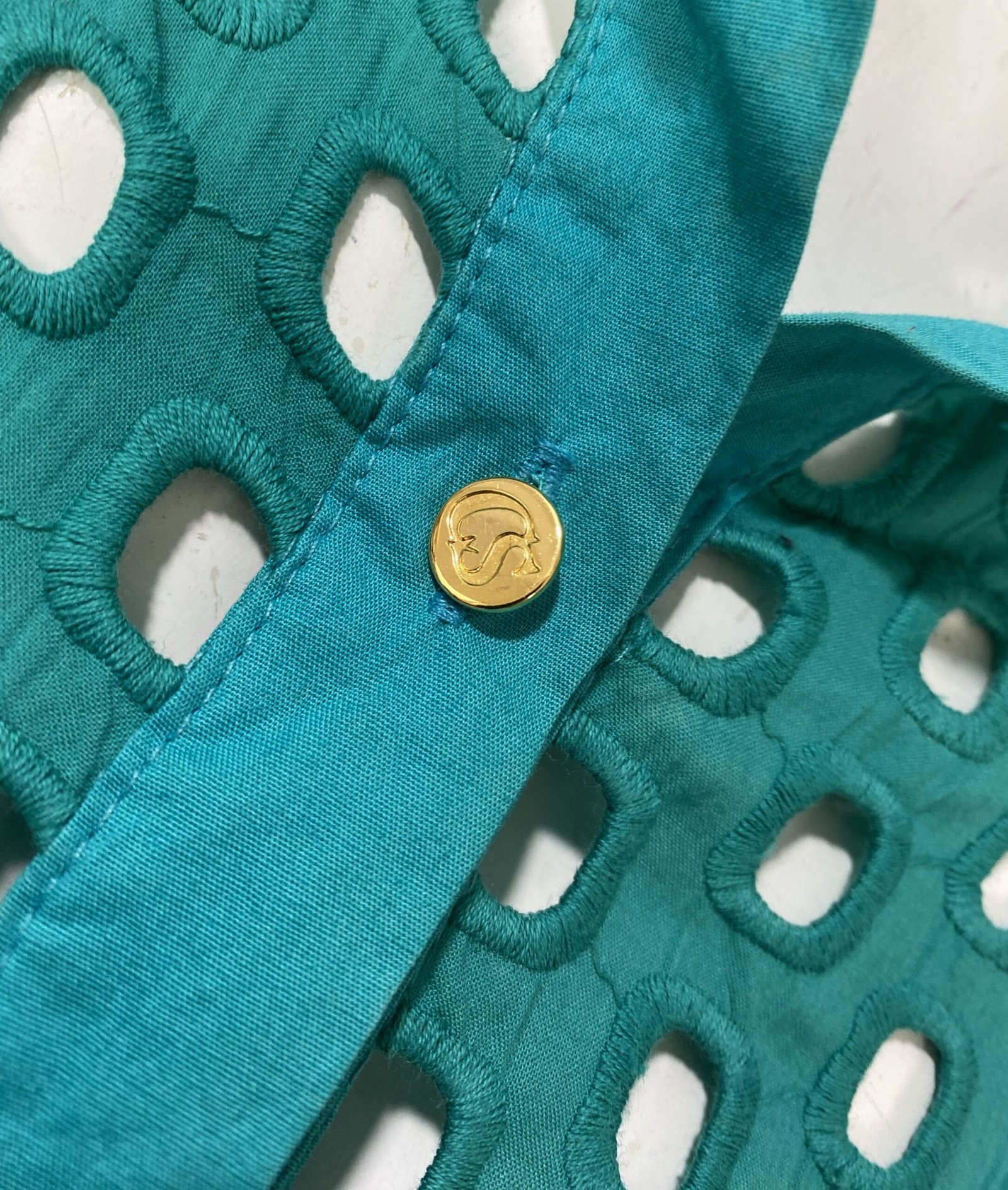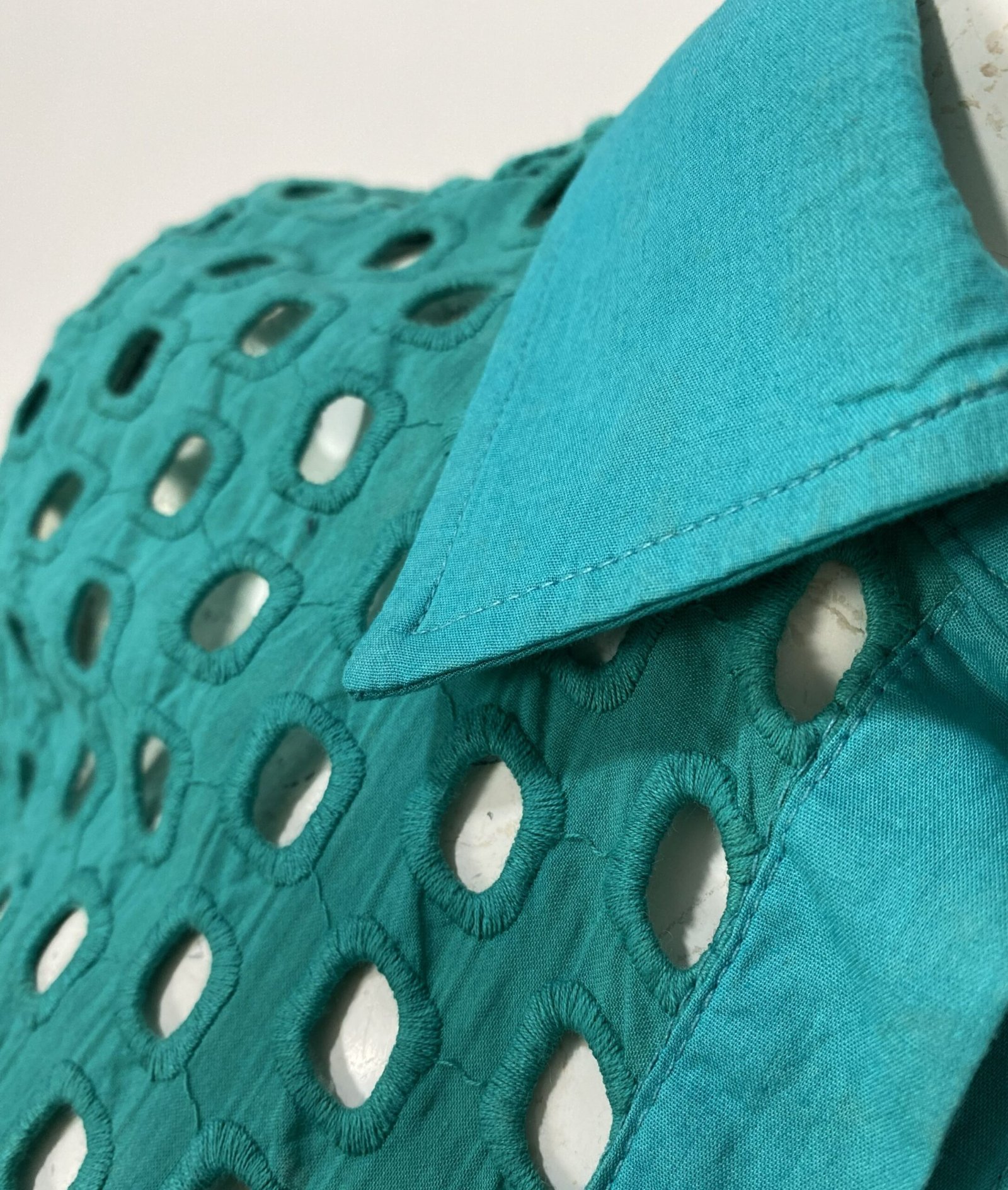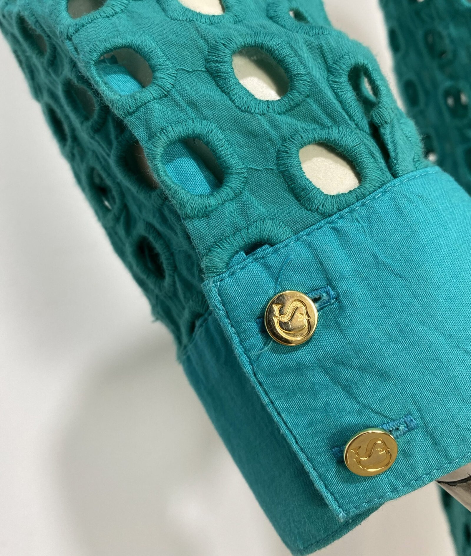 Camisa verde de manga longa, confeccionada em laise com padrões geométricos quadrados vazados. Possui fechamento frontal por botões e botões nos punhos.