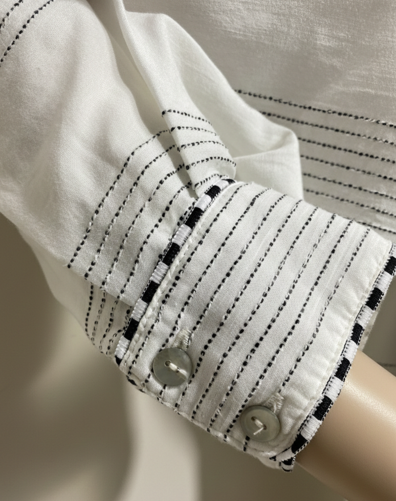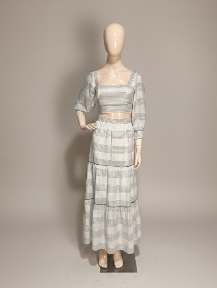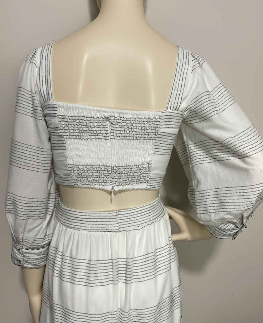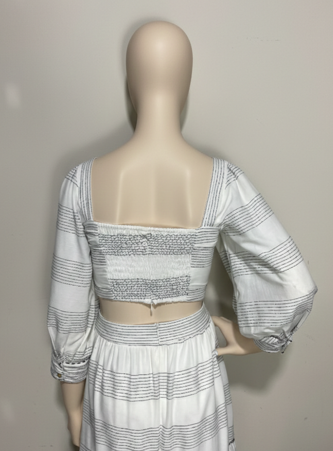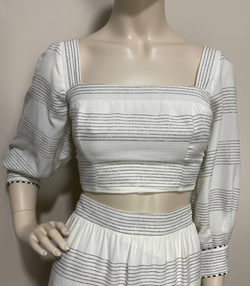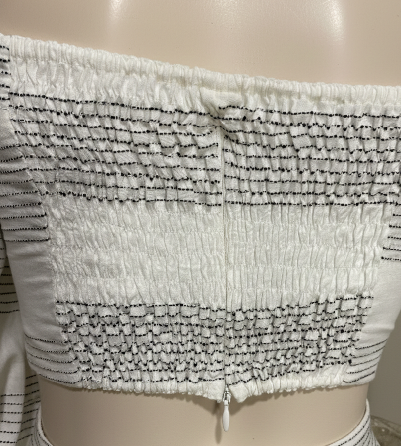 Cropped manga 3/4, off-white com listras pretas pespontadas. Possui forro na frente. Decote quadrado. Possui lastex nas costas. Fechamento em zíper ns costas.