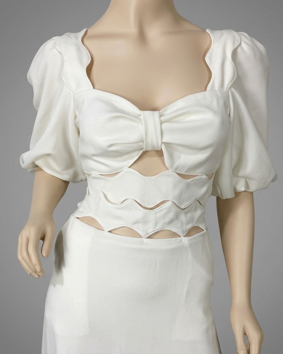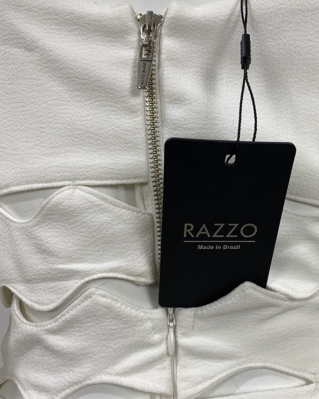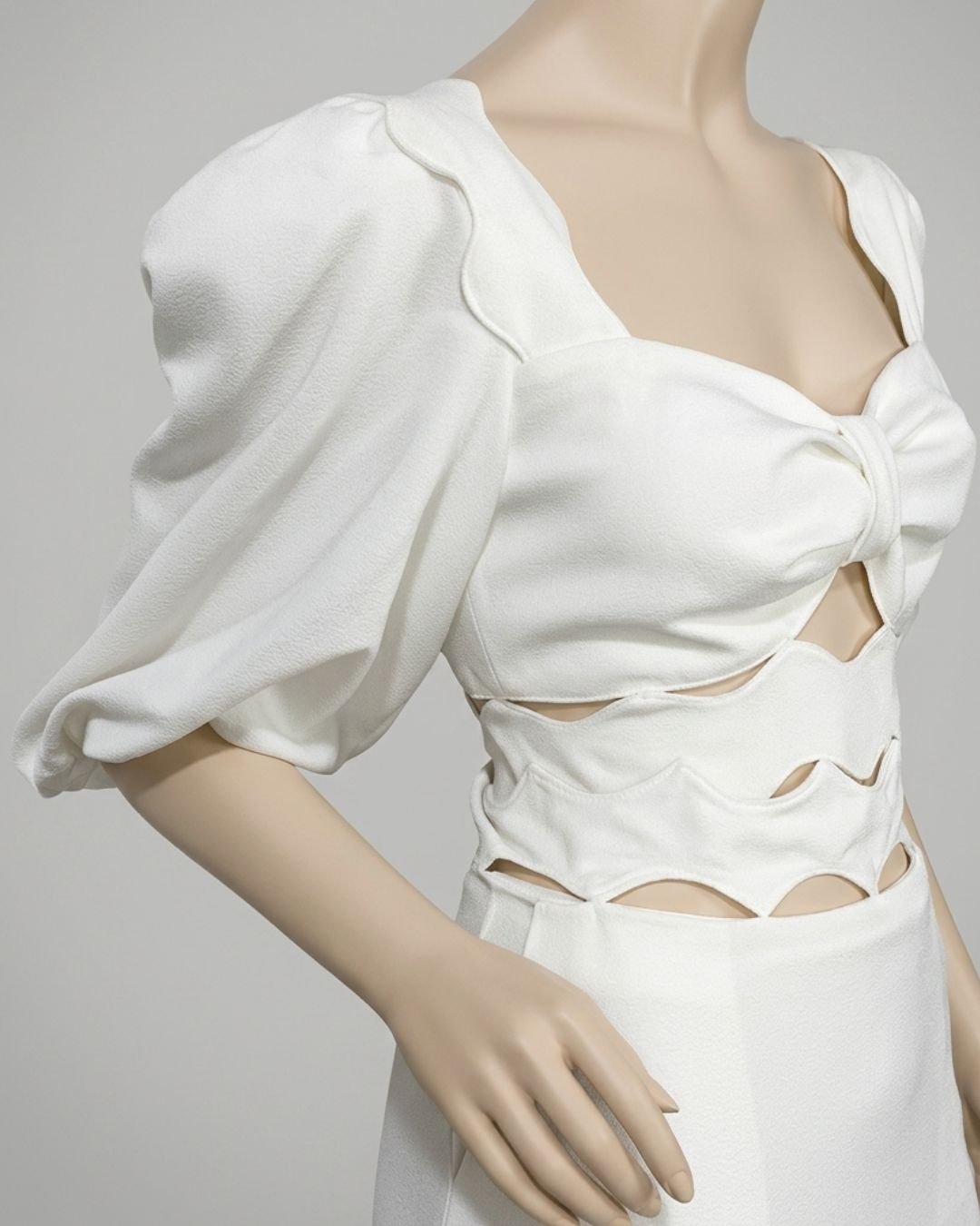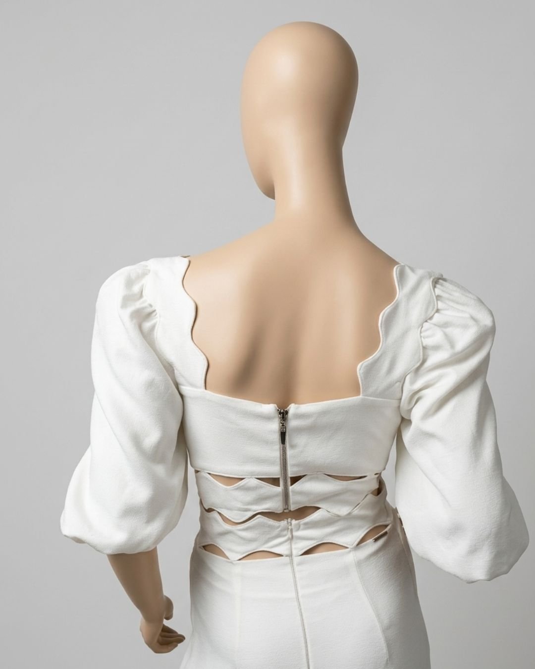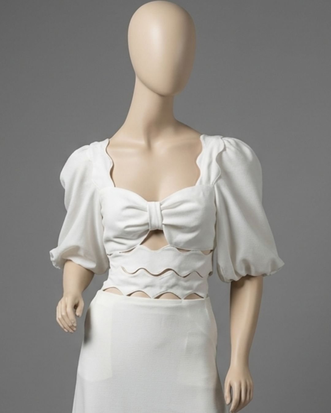 Cropped off-white em crepe estruturaddo, com manga bufante e decote princesa. Possui zíper nas costas. Possui acabamento estruturado no ombro para dar efeito de ombreira. Essa peça custa R$490,00 na loja da marca.