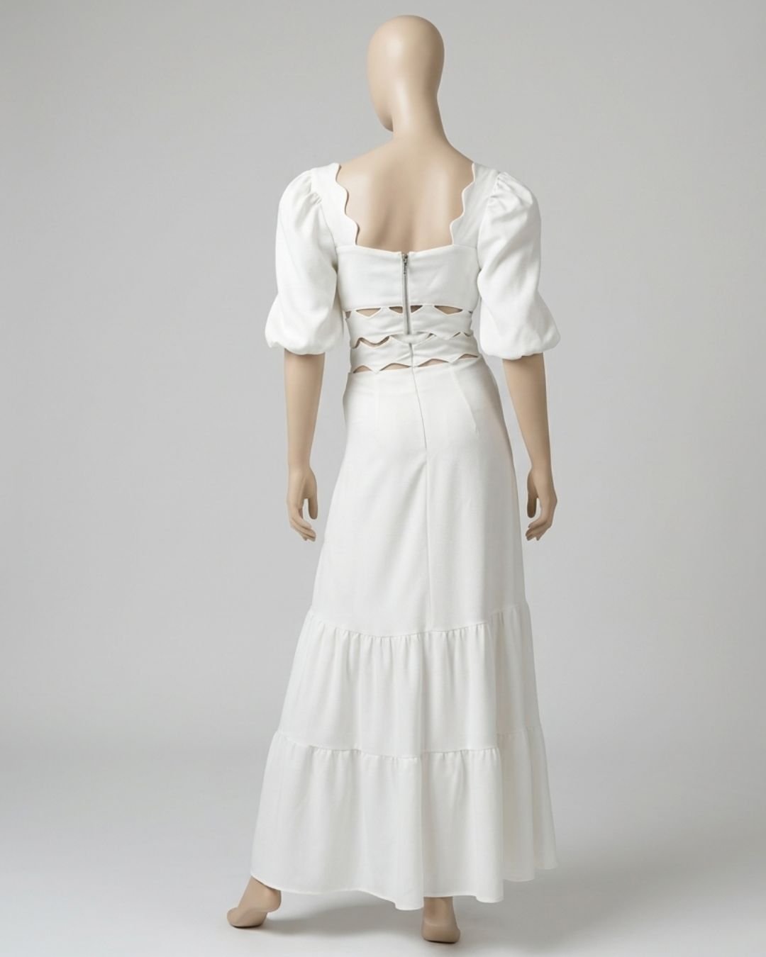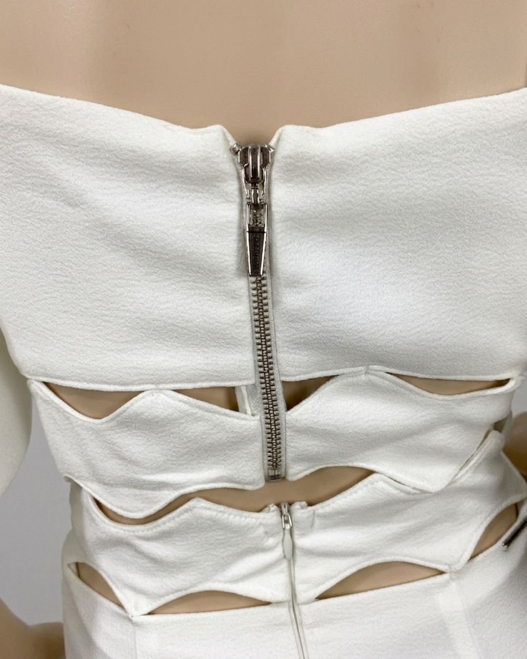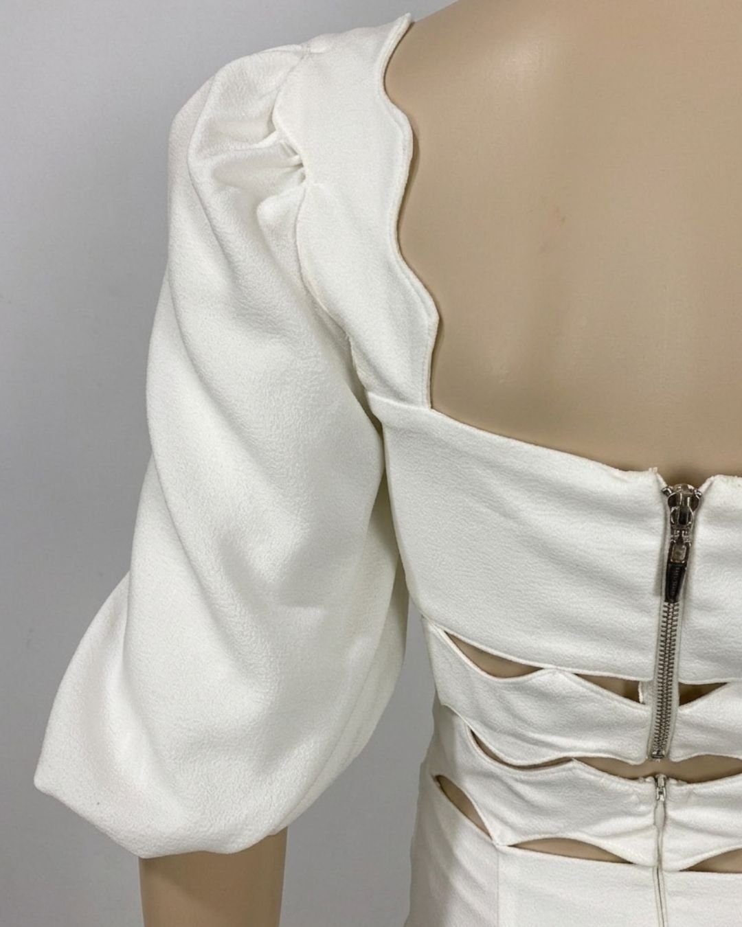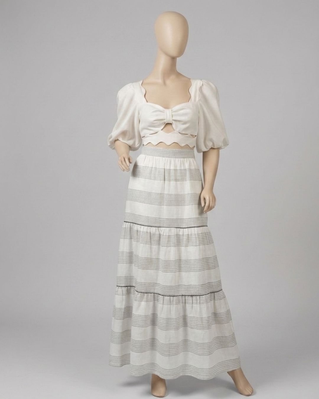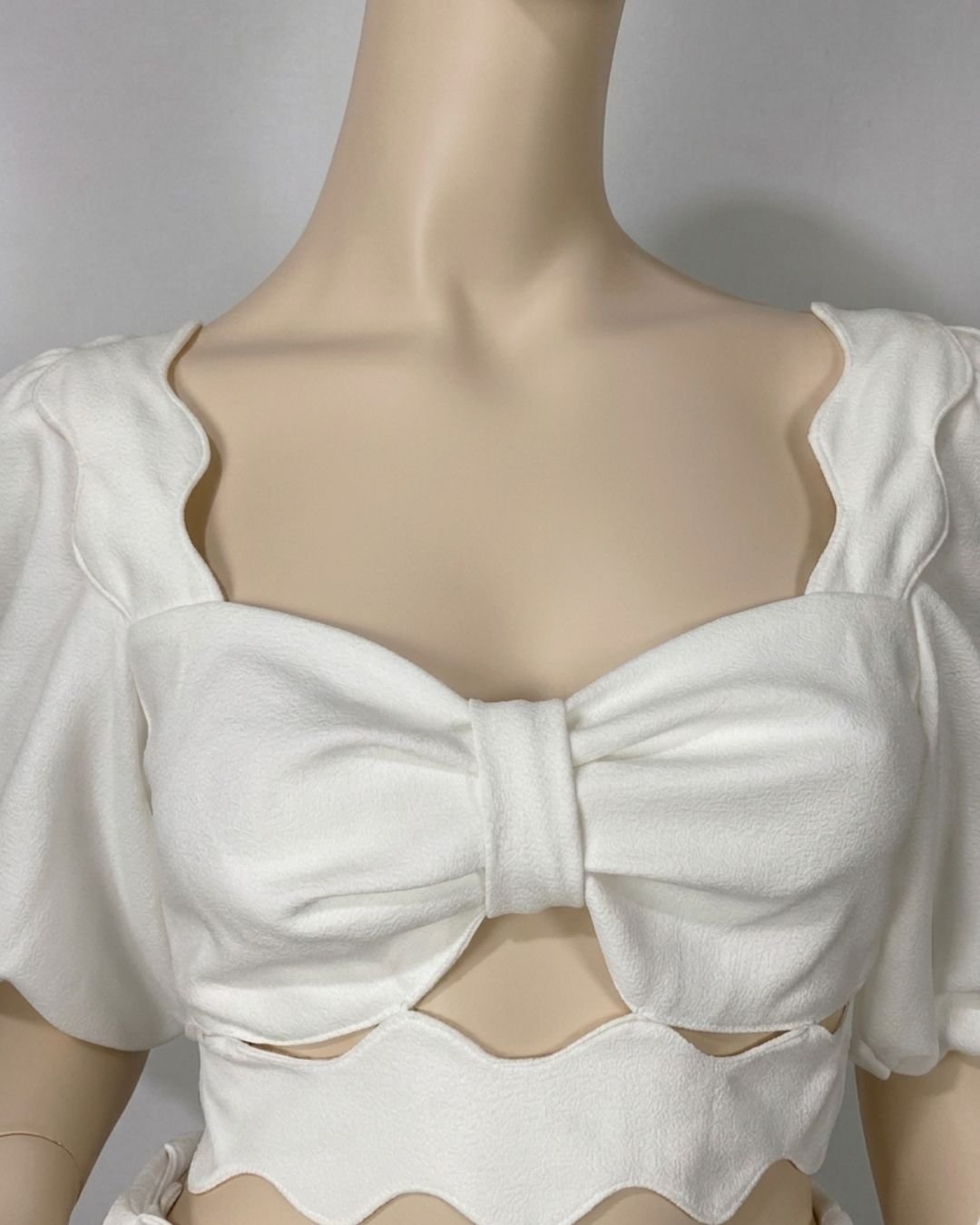 Cropped off-white em crepe estruturaddo, com manga bufante e decote princesa. Possui zíper nas costas. Possui acabamento estruturado no ombro para dar efeito de ombreira. Essa peça custa R$490,00 na loja da marca.