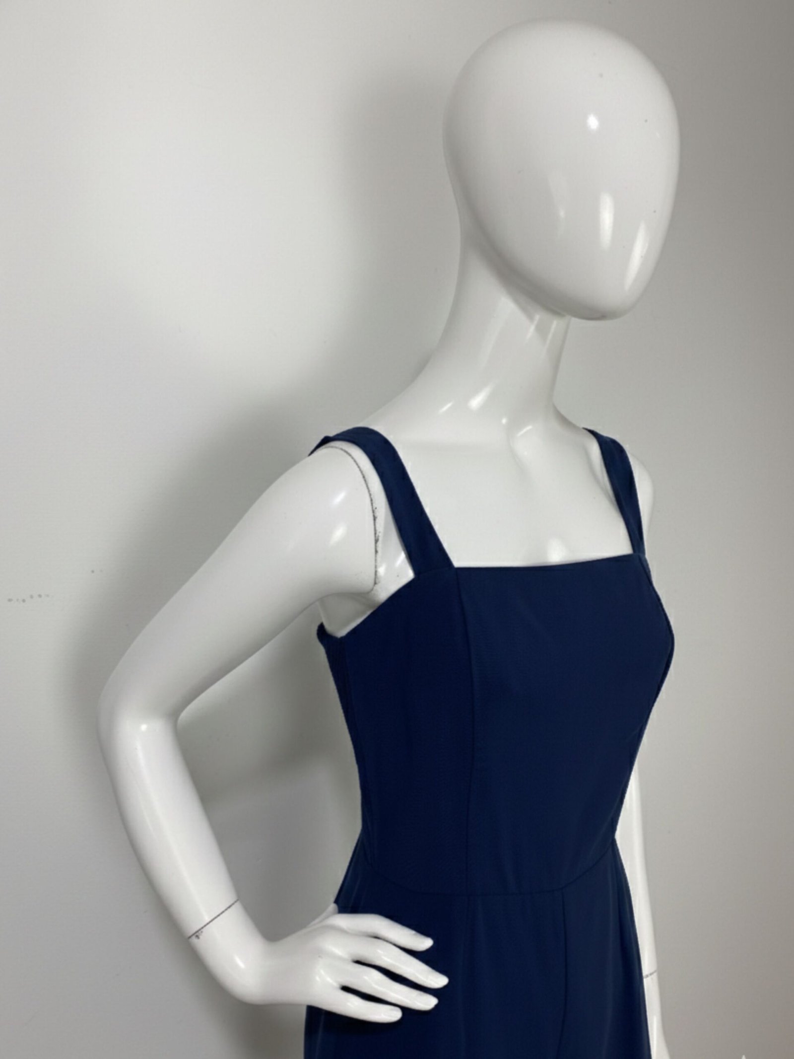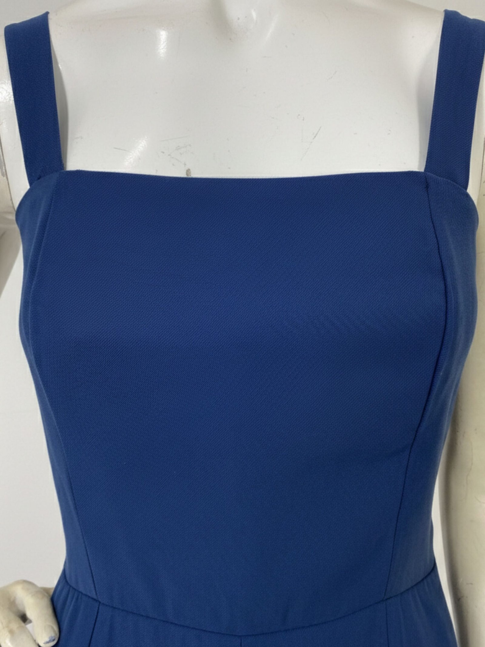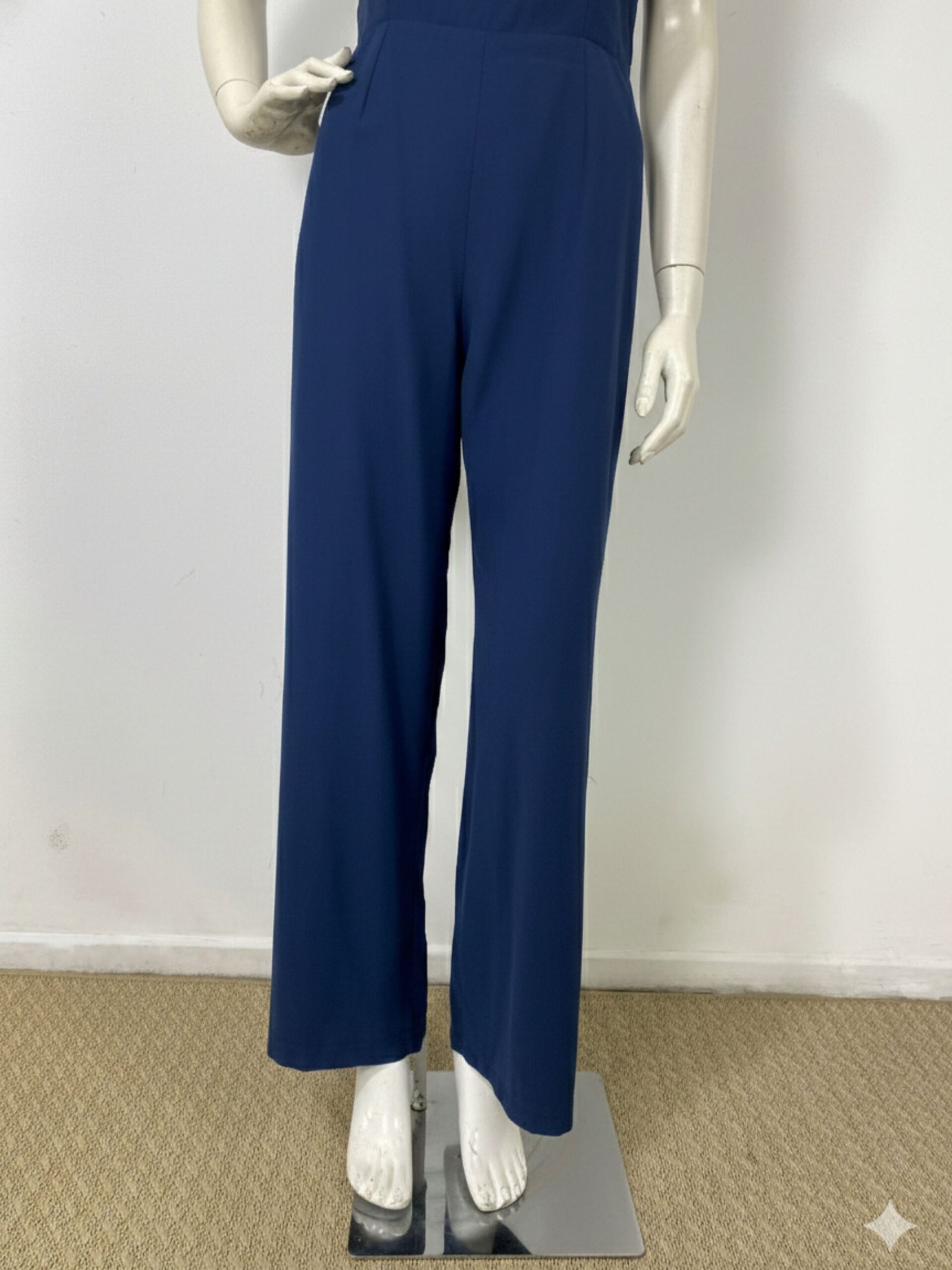 Macacão azul-marinho confeccionado em crepe de viscose. Possui alças largas, permitindo o uso com sutiã. O fechamento é em zíper nas costas, com detalhe em lastex para melhor ajuste ao corpo. Não possui bolsos.