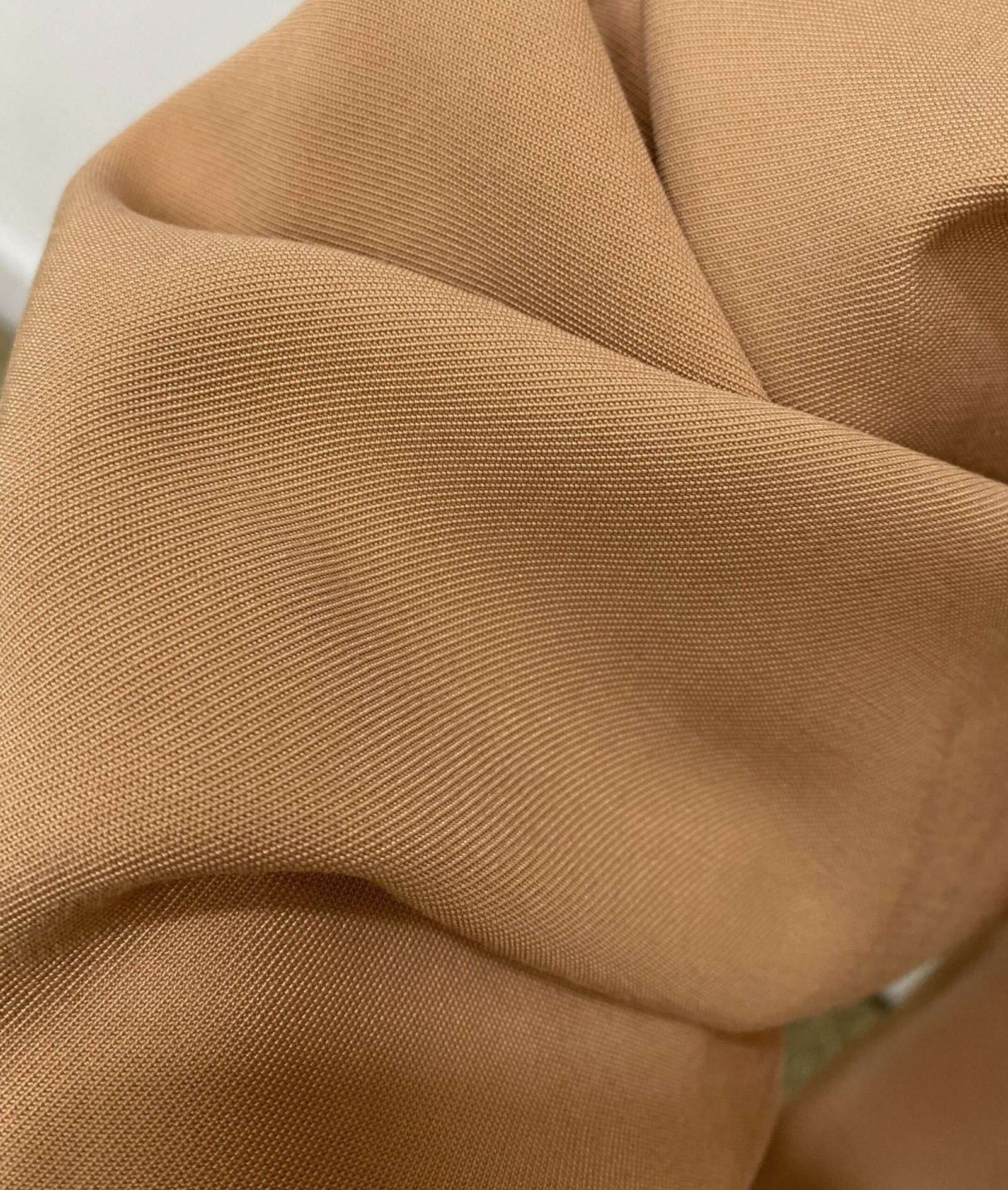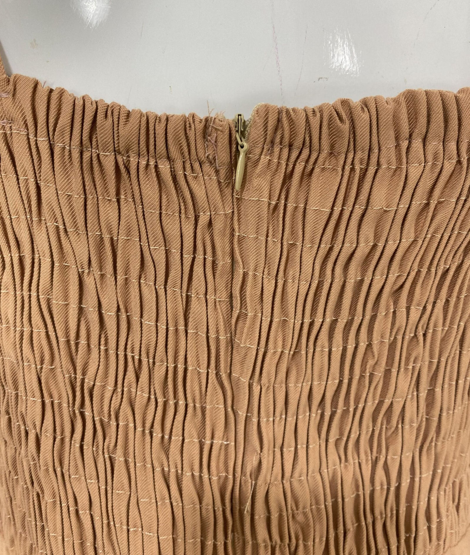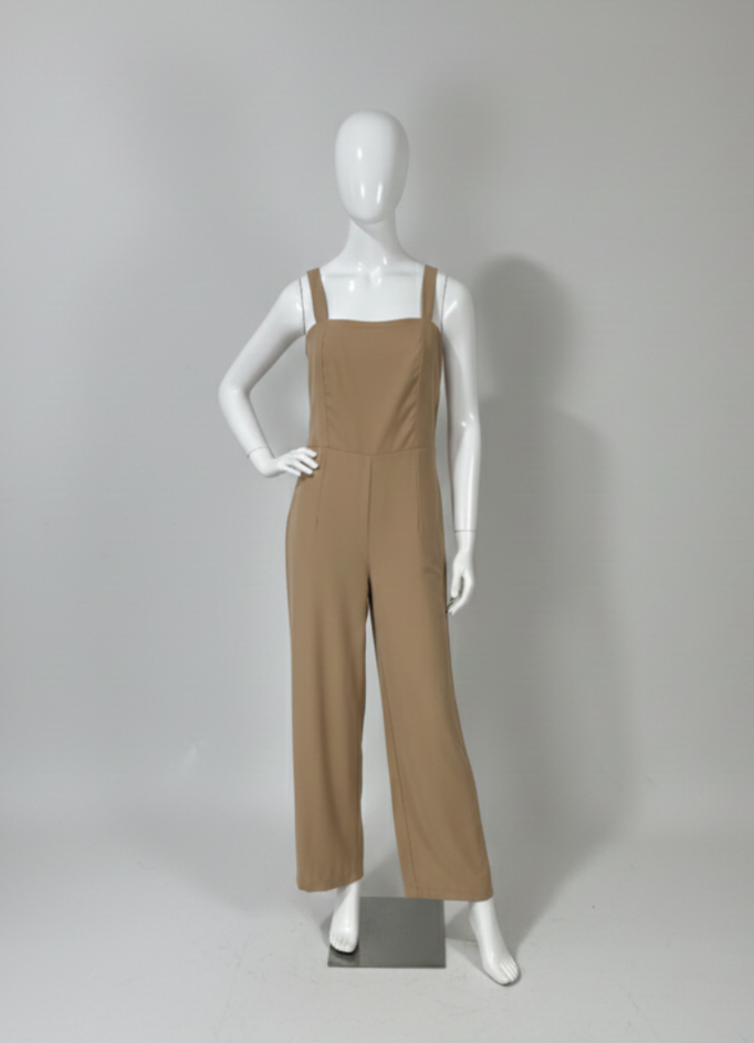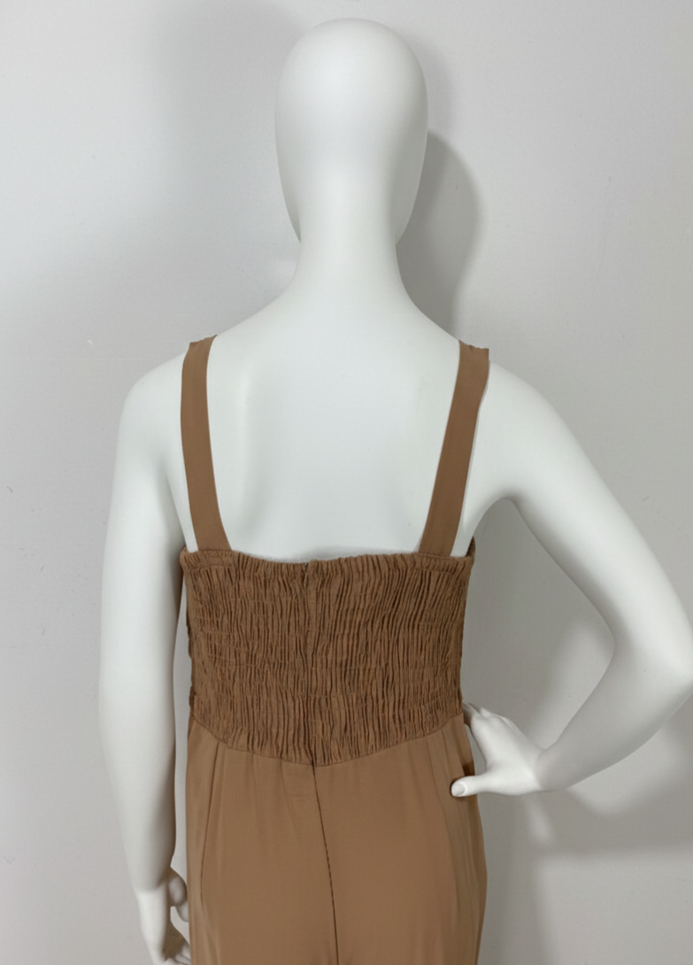 Macacão bege confeccionado em crepe de viscose. Possui alças largas, permitindo o uso com sutiã. O fechamento é em zíper nas costas, com detalhe em lastex para melhor ajuste ao corpo. Não possui bolsos.