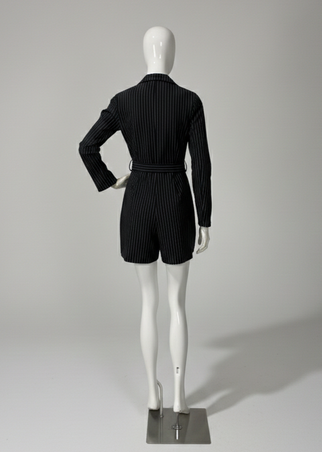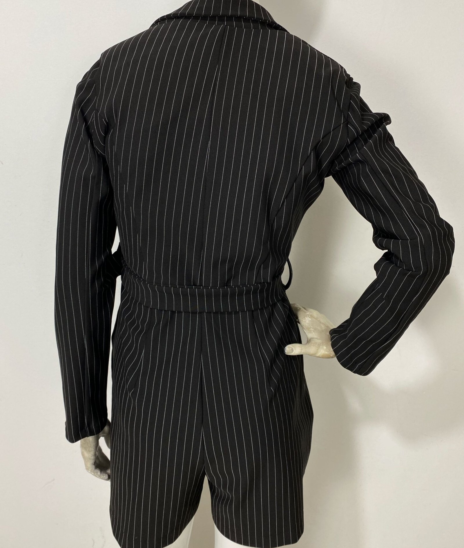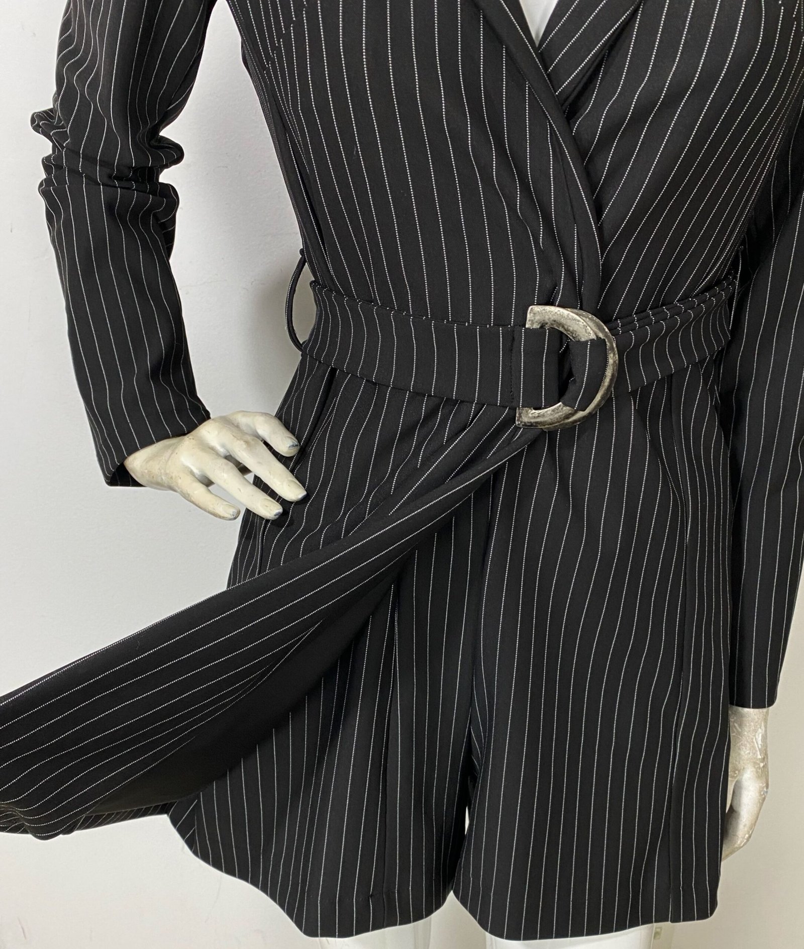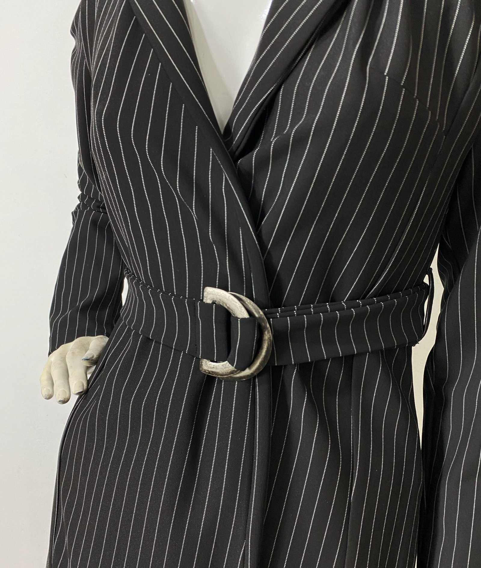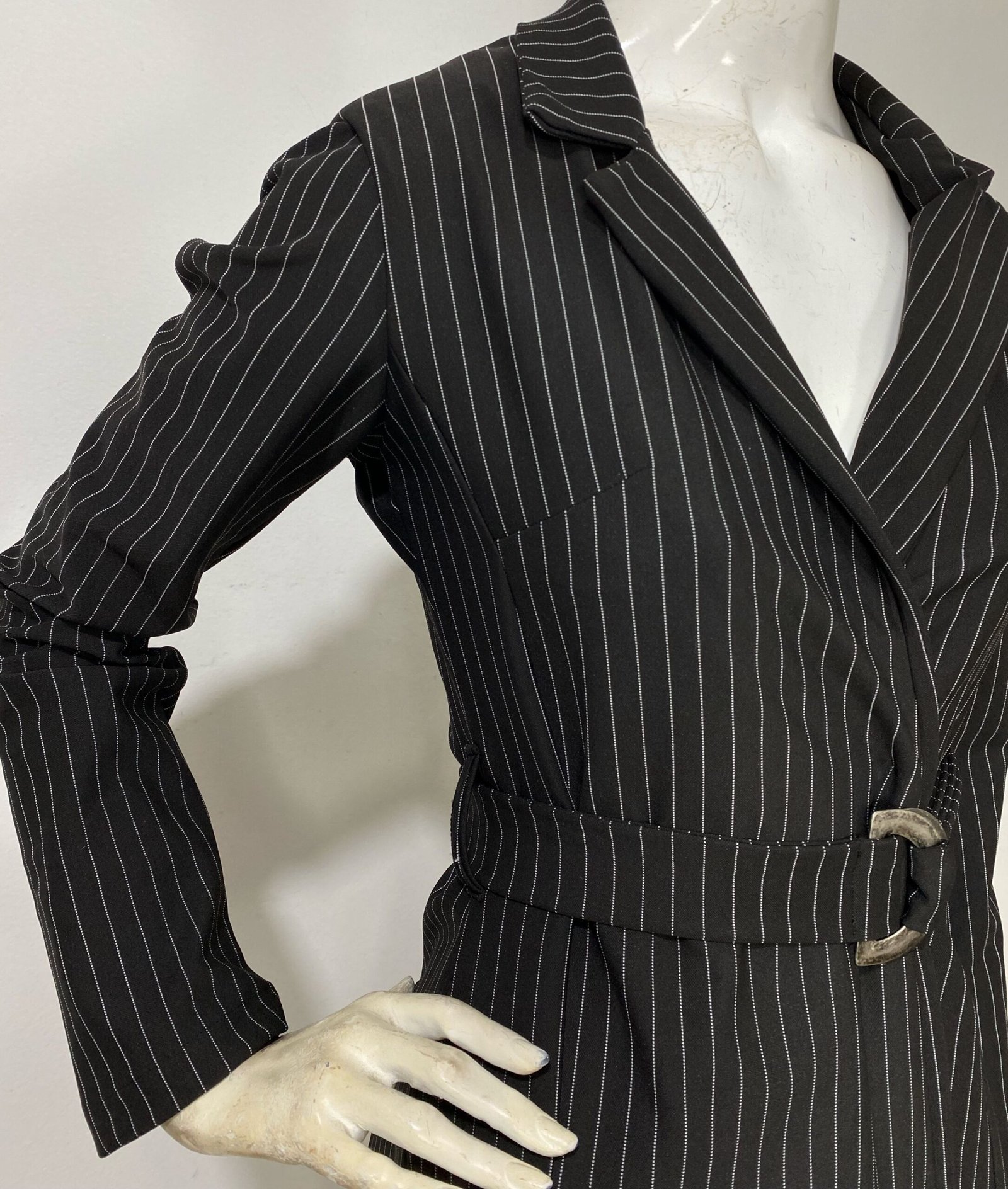 Macaquinho preto risca de giz, com modelagem que lembra um maxi blazer. Confeccionado em crepe com elastano, oferecendo leve elasticidade e conforto. Fechamento frontal com zíper invisível e botões de pressão. Possui cinto faixa removível e ombreiras para estrutura adicional. Forrado da cintura para cima; tecido não transparente.