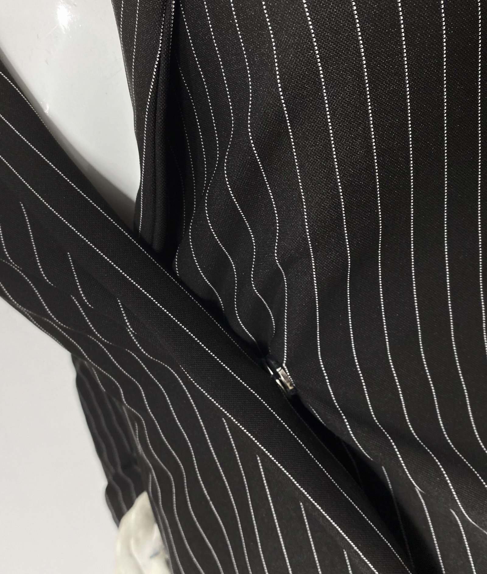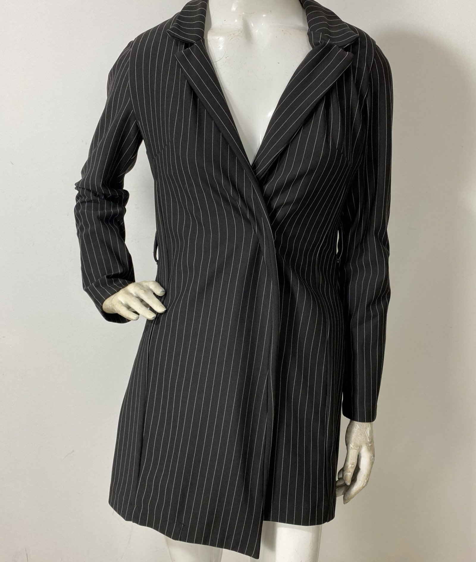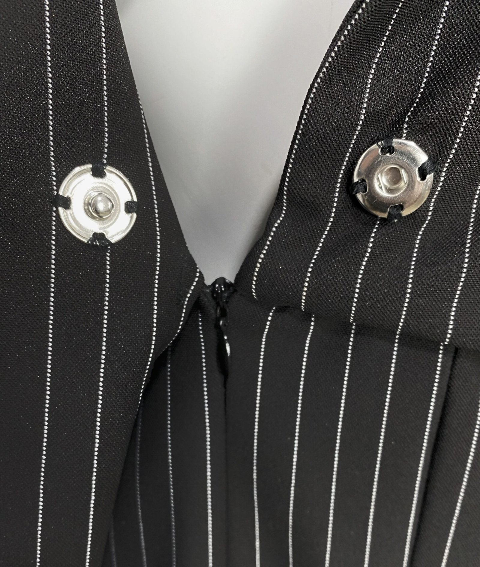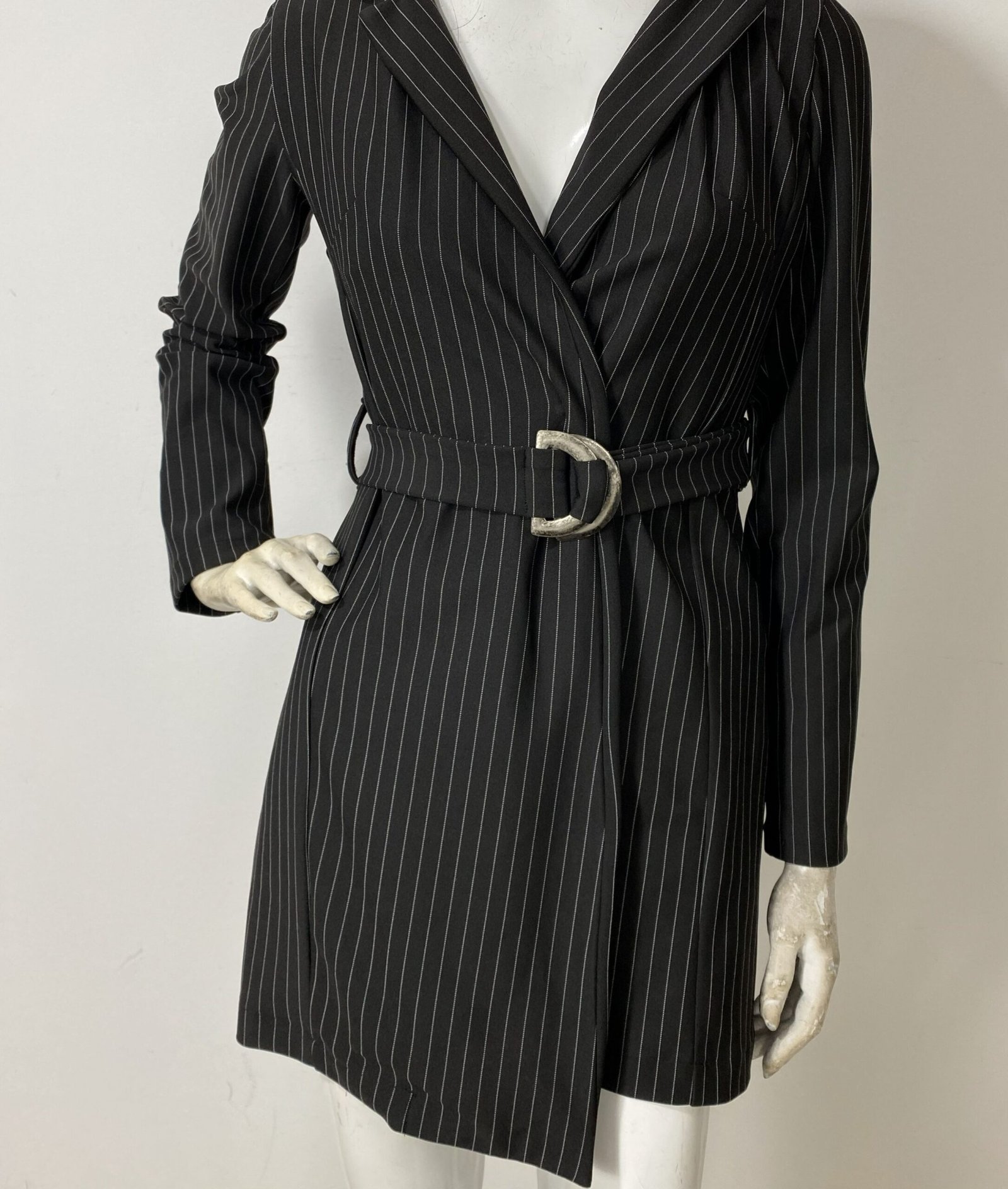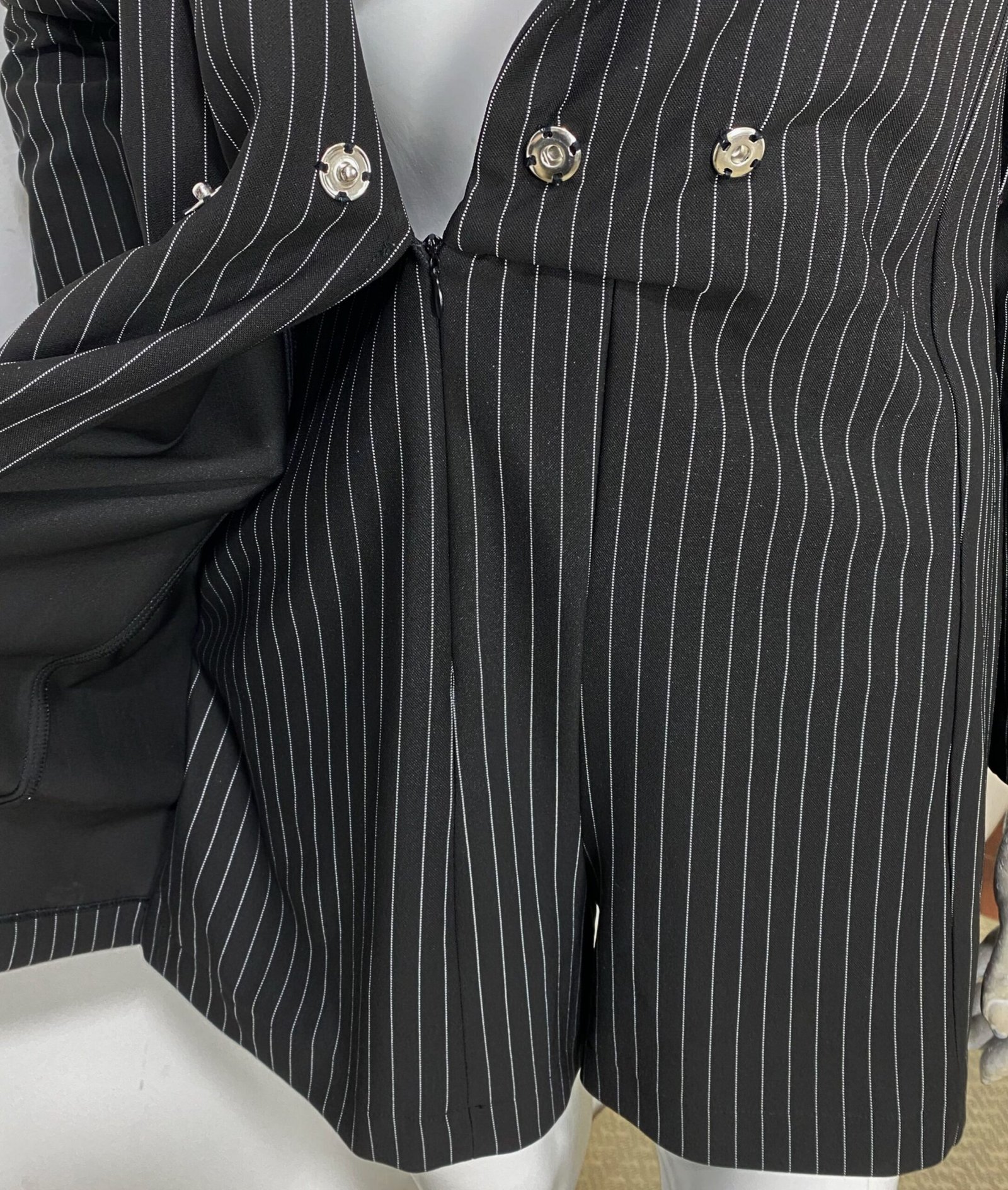 Macaquinho preto risca de giz, com modelagem que lembra um maxi blazer. Confeccionado em crepe com elastano, oferecendo leve elasticidade e conforto. Fechamento frontal com zíper invisível e botões de pressão. Possui cinto faixa removível e ombreiras para estrutura adicional. Forrado da cintura para cima; tecido não transparente.