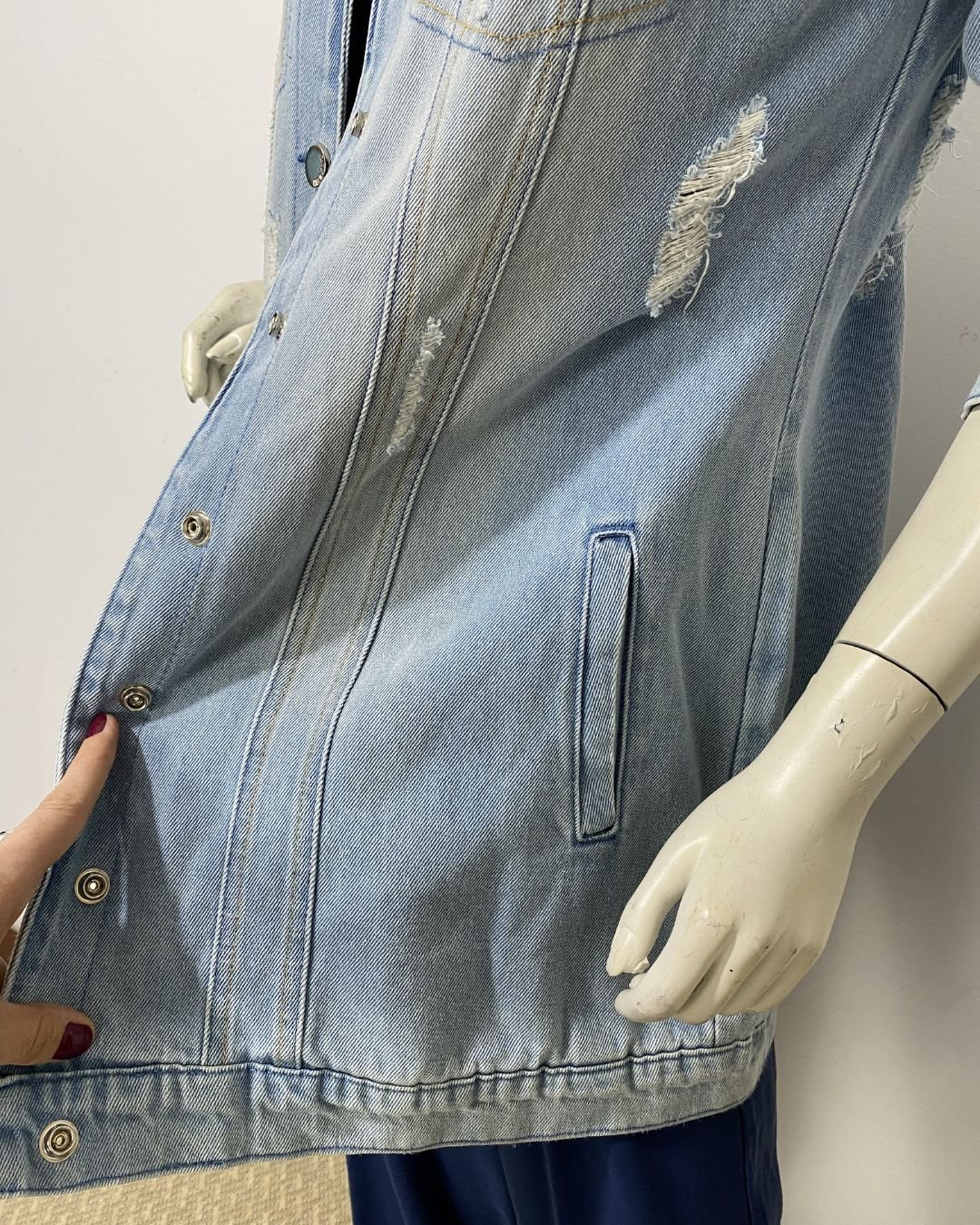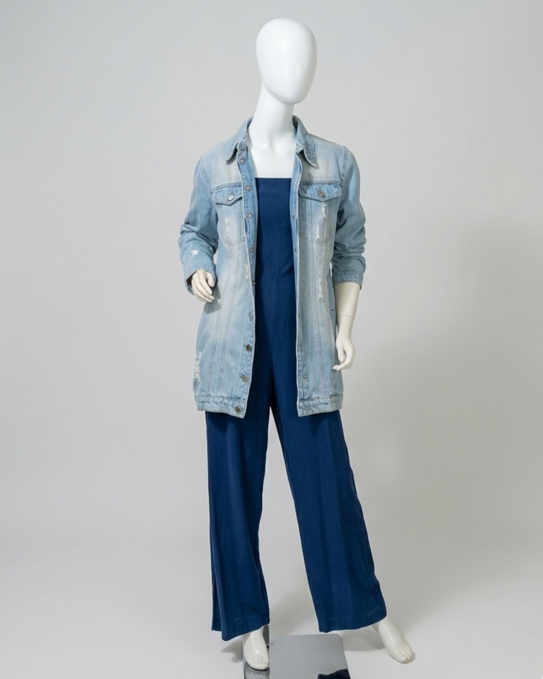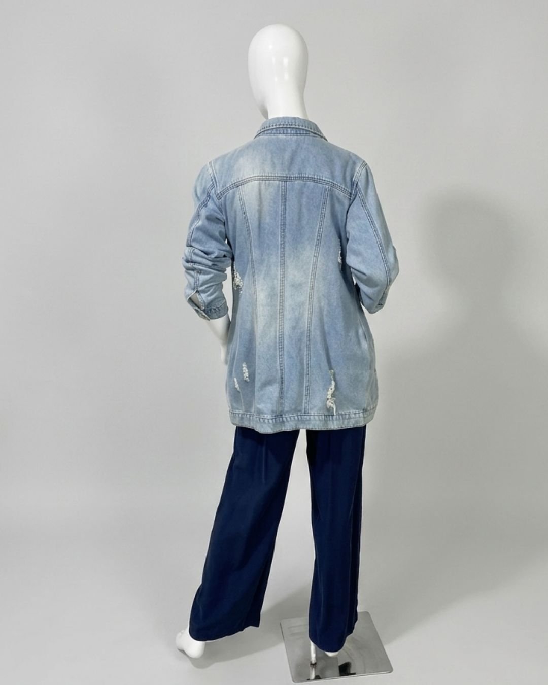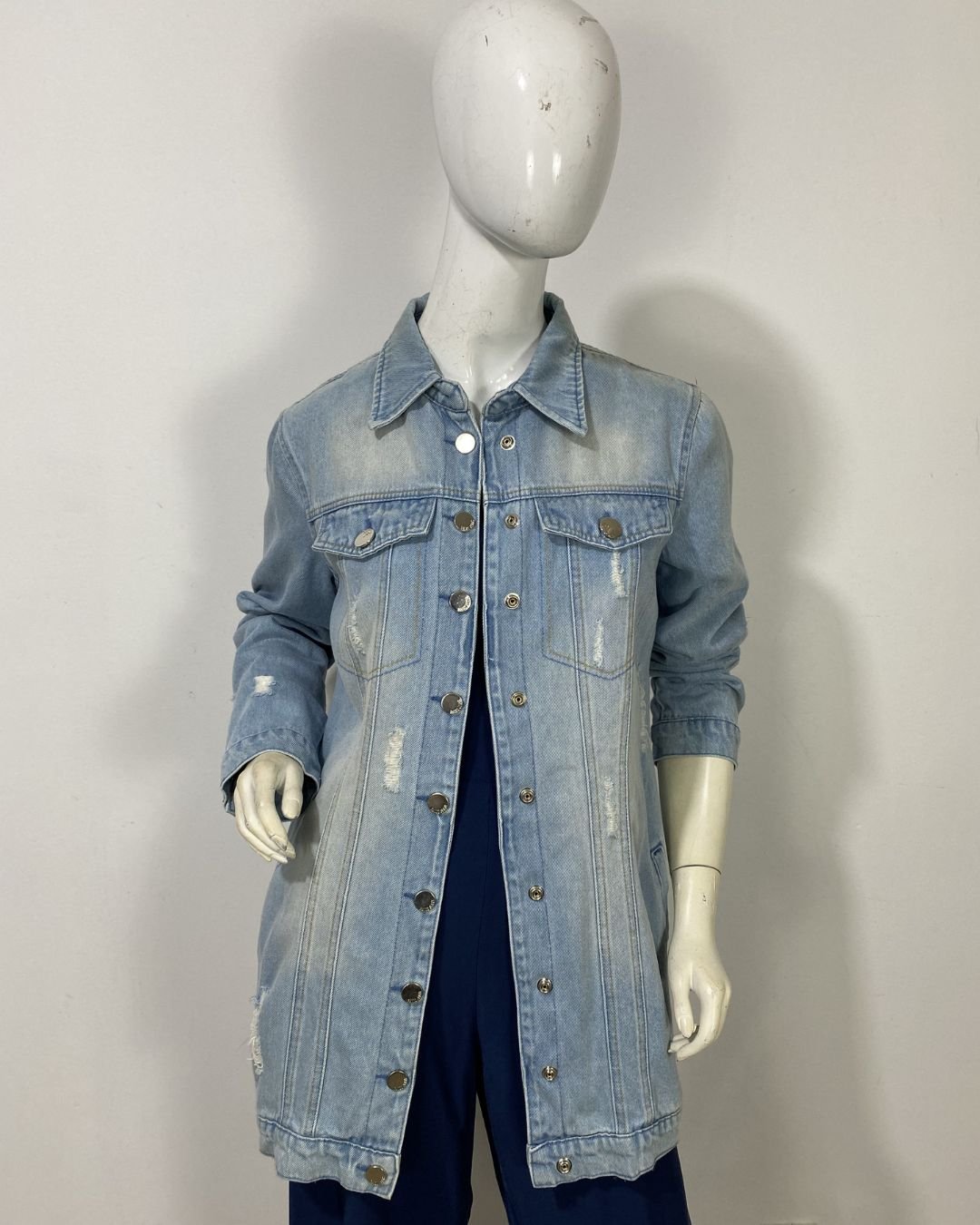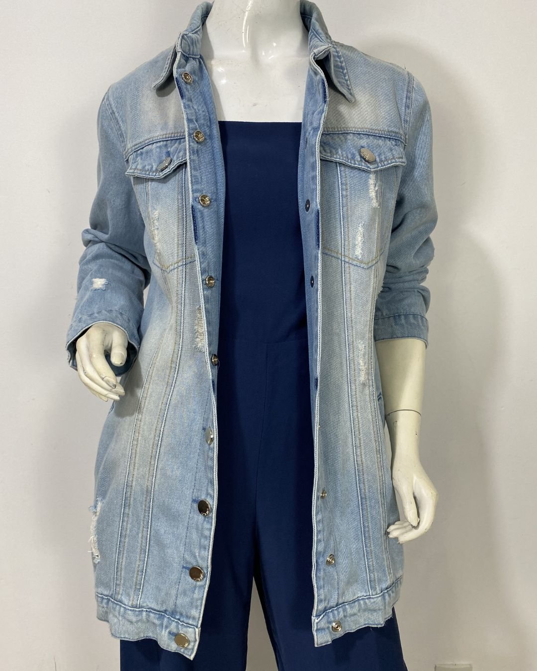 Maxi jaqueta jeans, destroyed, em lavagem clara. Sua modelagem longa é perfeita para alongar a silhueta e criar produções modernas e despojadas. Os botões são de pressão, o que garante que a peça permaneça abotoada com perfeição durante todo o uso. Essa peça custa R$520,00 na loja da marca (valor indicado na etiqueta).