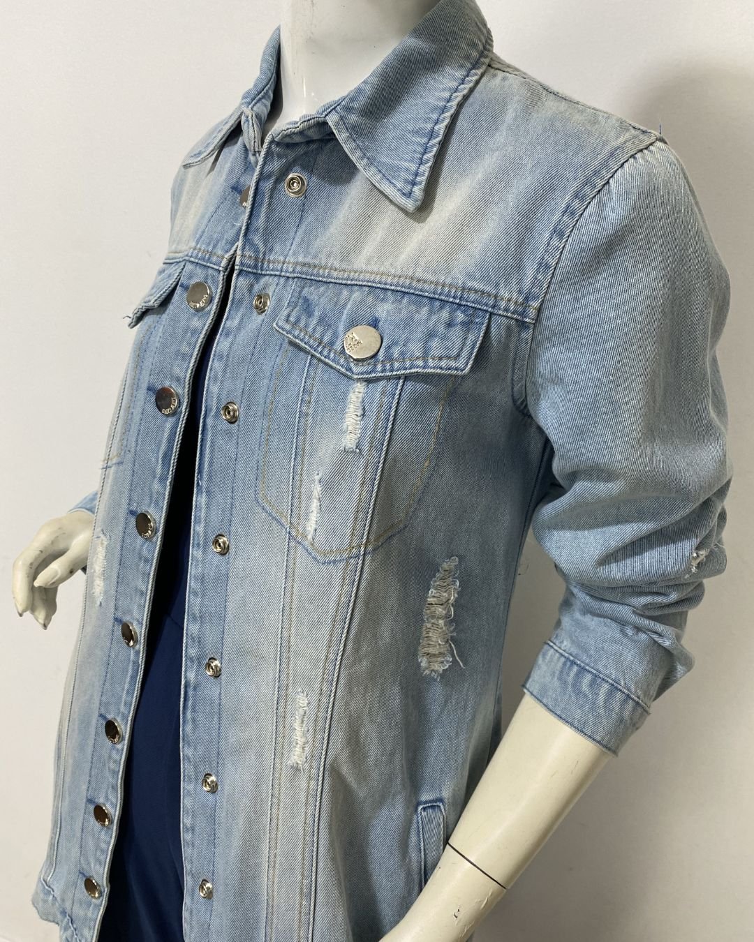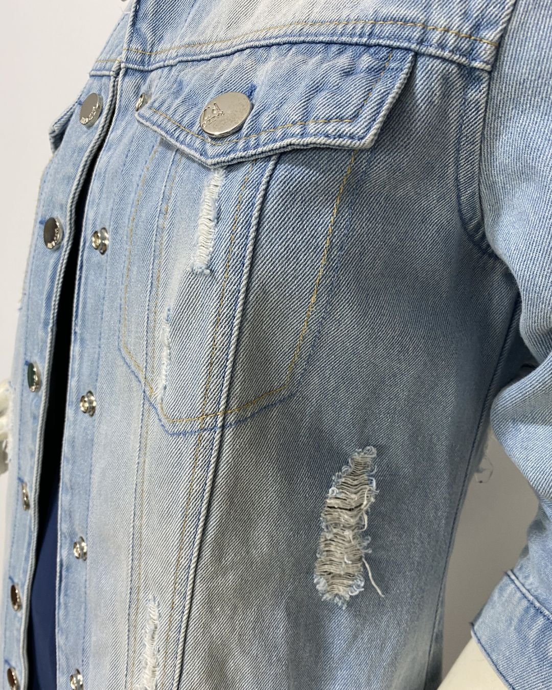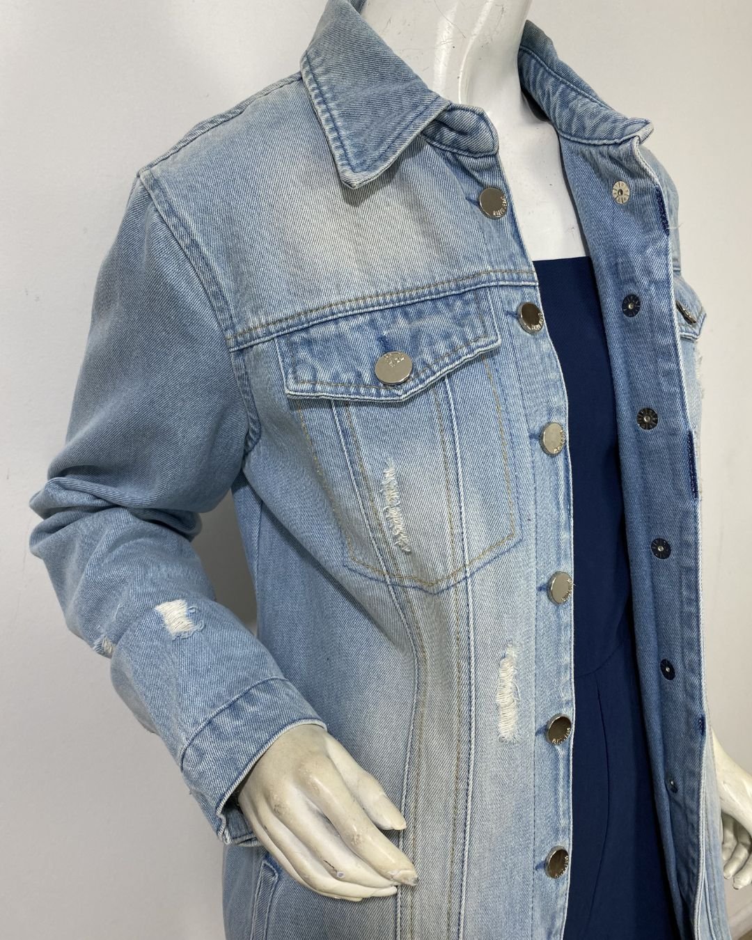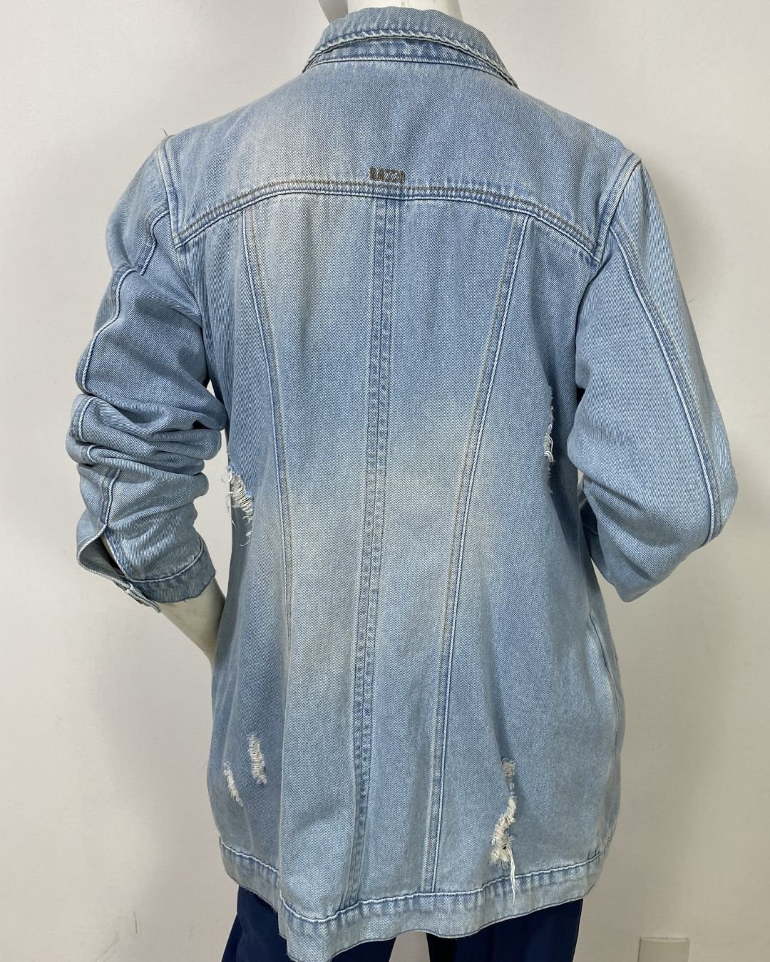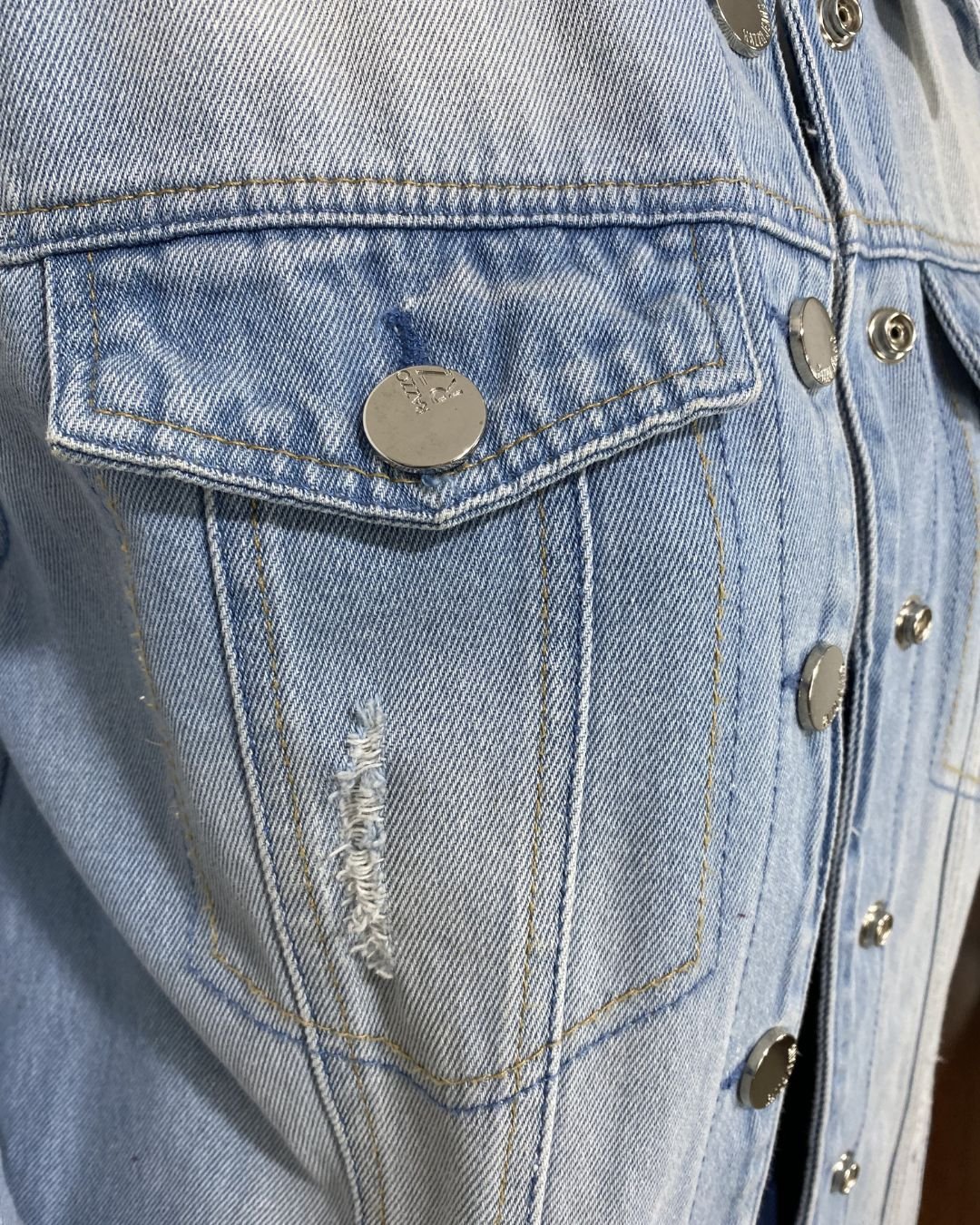 Maxi jaqueta jeans, destroyed, em lavagem clara. Sua modelagem longa é perfeita para alongar a silhueta e criar produções modernas e despojadas. Os botões são de pressão, o que garante que a peça permaneça abotoada com perfeição durante todo o uso. Essa peça custa R$520,00 na loja da marca (valor indicado na etiqueta).