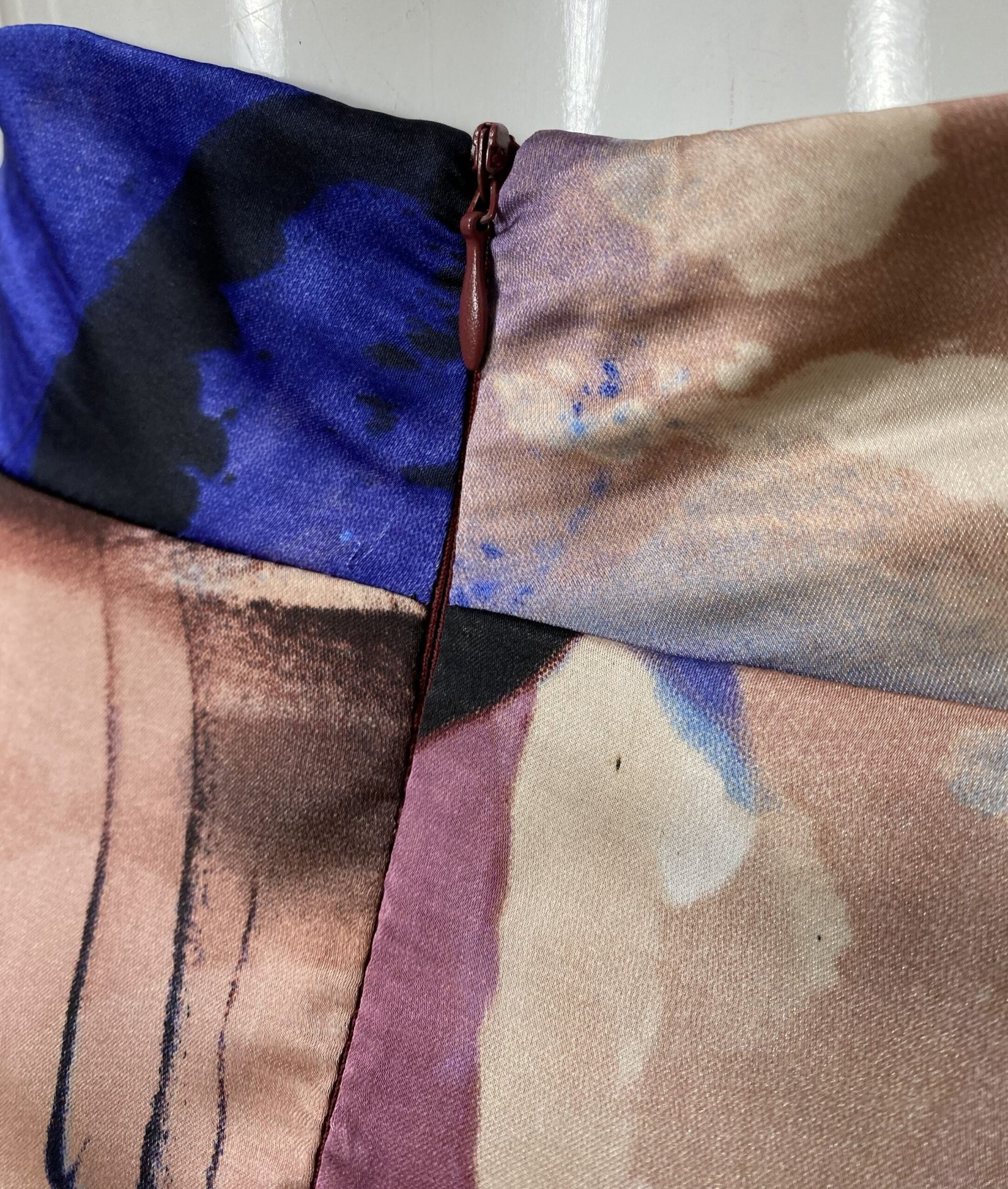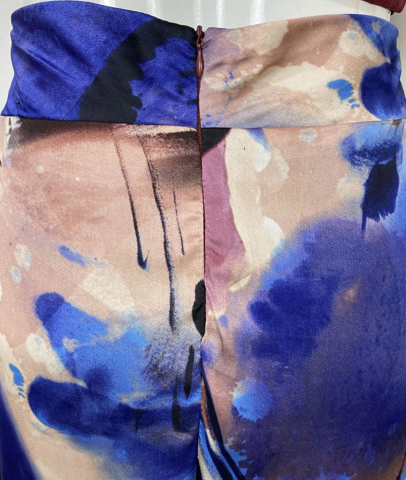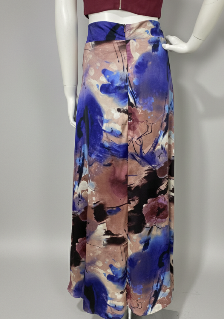 Saia longa confeccionada em cetim com estampa floral moderna e mix de cores. Possui forro e fechamento em zíper na parte posterior.