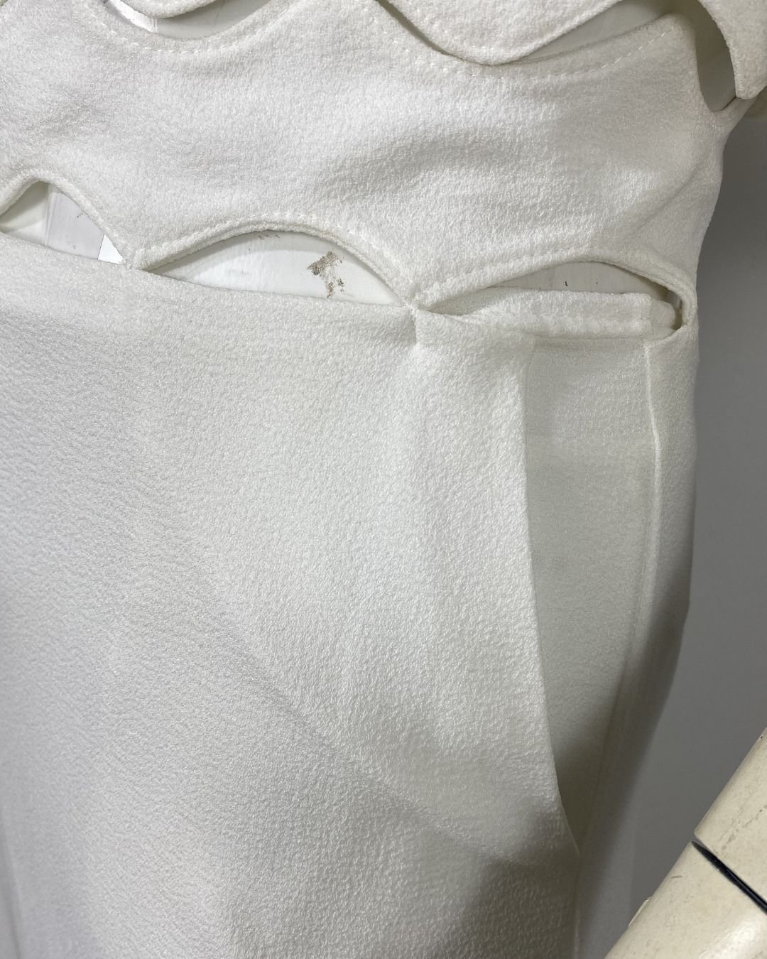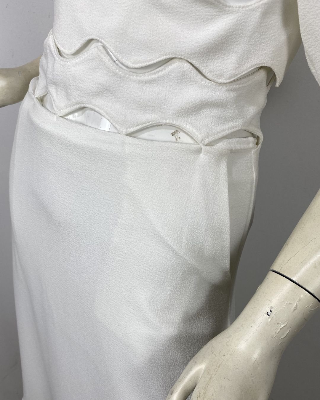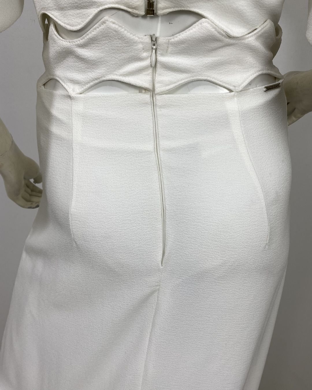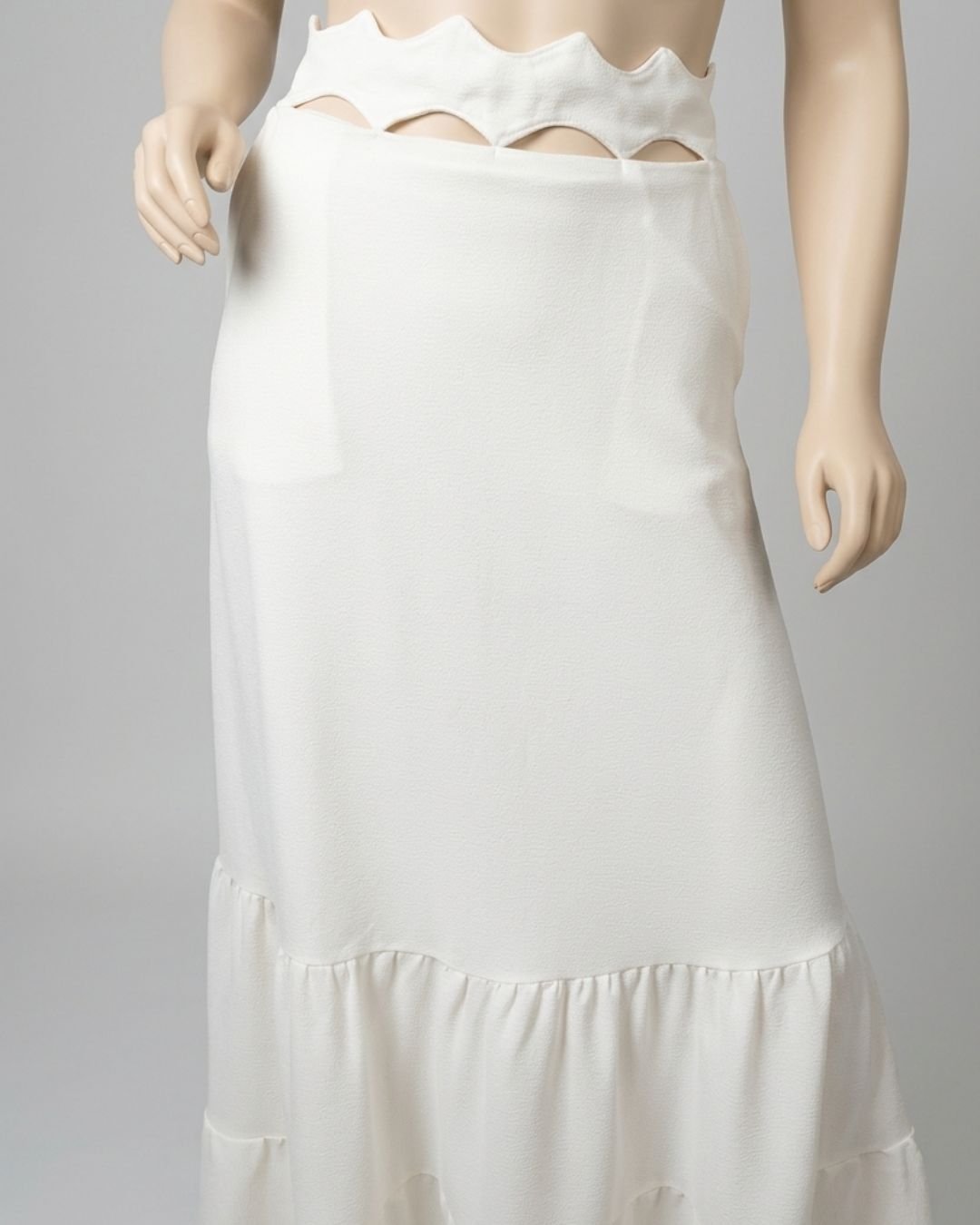 Saia off-white, em crepe estruturado, forrada. Possui zíper atrás. O cós é vazado e foi contruir para se asemelhar as ondas do mar. Possui bolsos faca na frente. Essa peça custa R$550,00 na loja da marca.