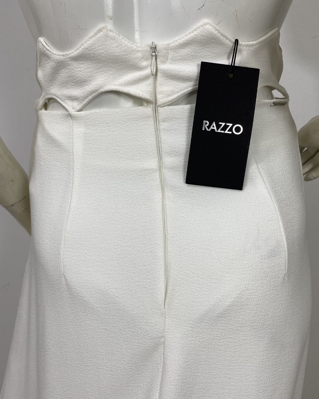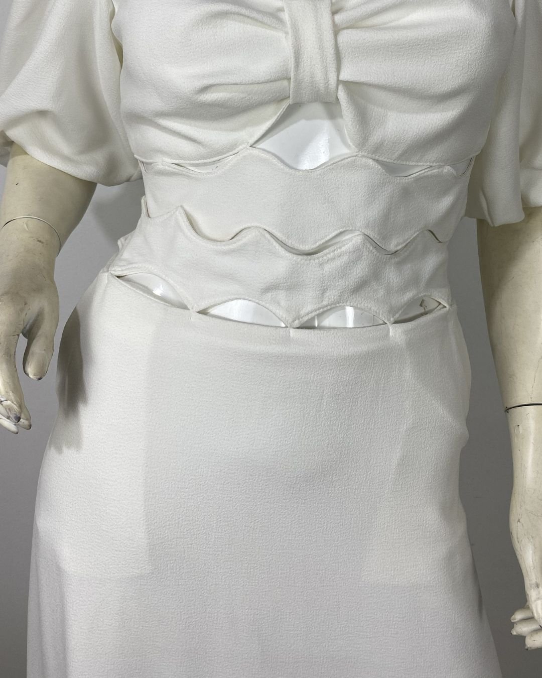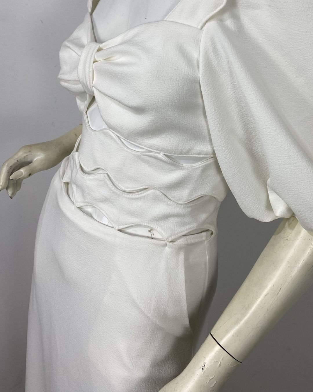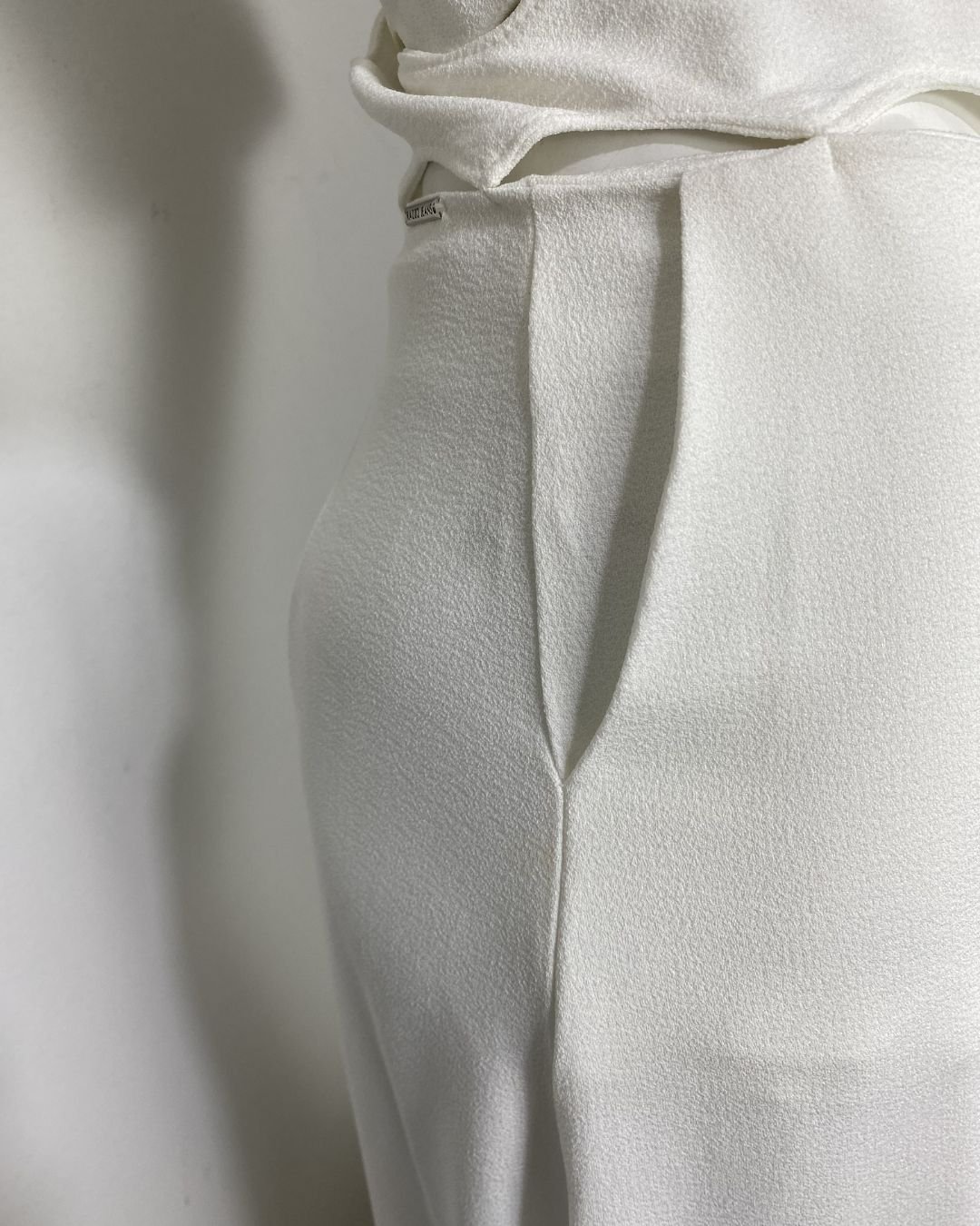 Saia off-white, em crepe estruturado, forrada. Possui zíper atrás. O cós é vazado e foi contruir para se asemelhar as ondas do mar. Possui bolsos faca na frente. Essa peça custa R$550,00 na loja da marca.