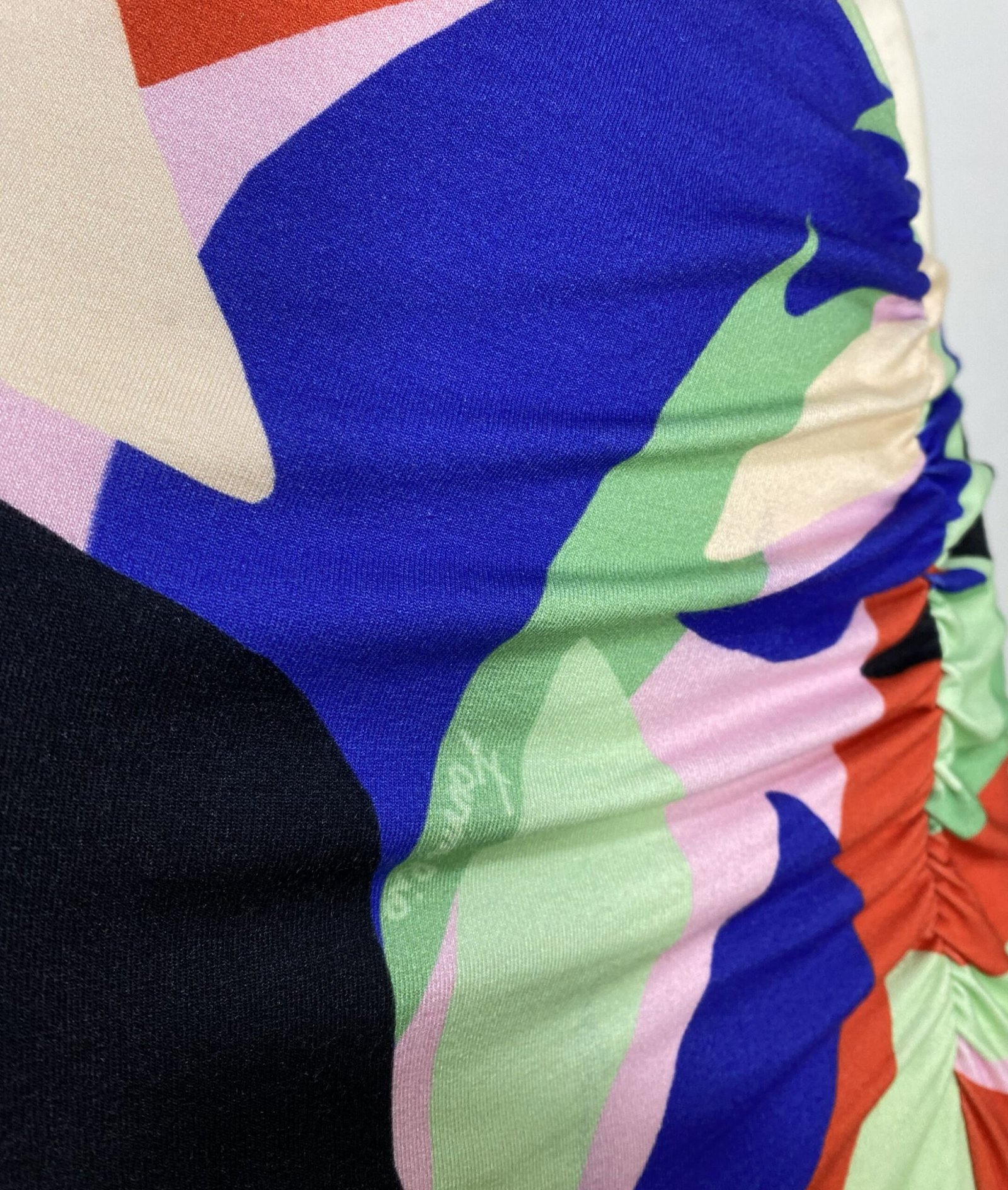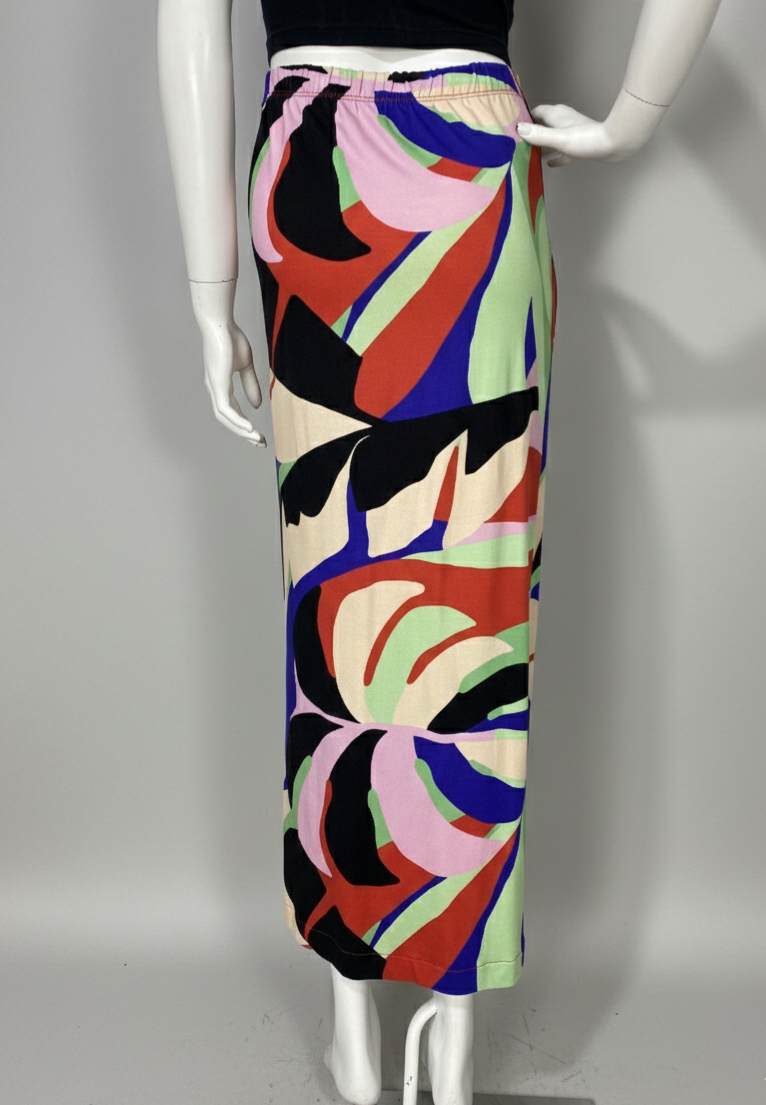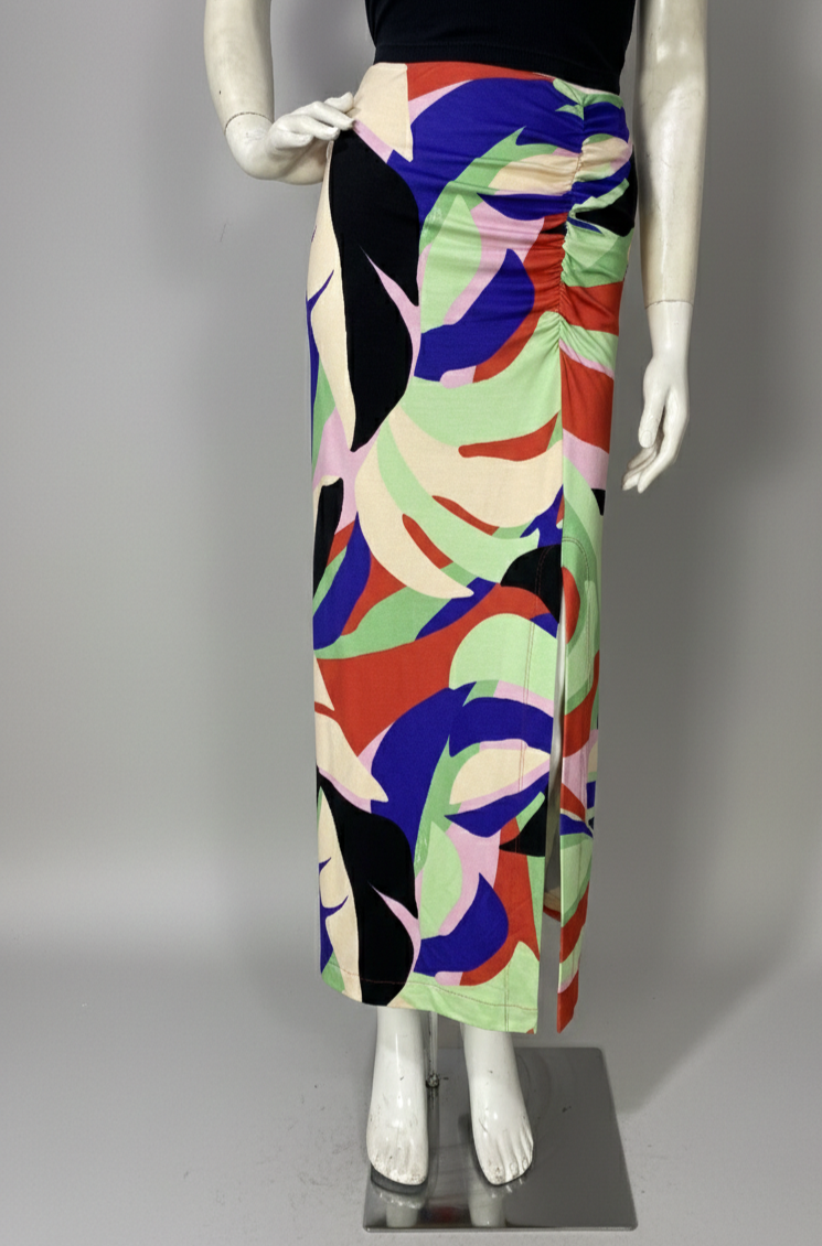 Saia midi confeccionada em malha com estampa colorida. Possui elástico na cintura, detalhe franzido e fenda frontal. Não possui forro.