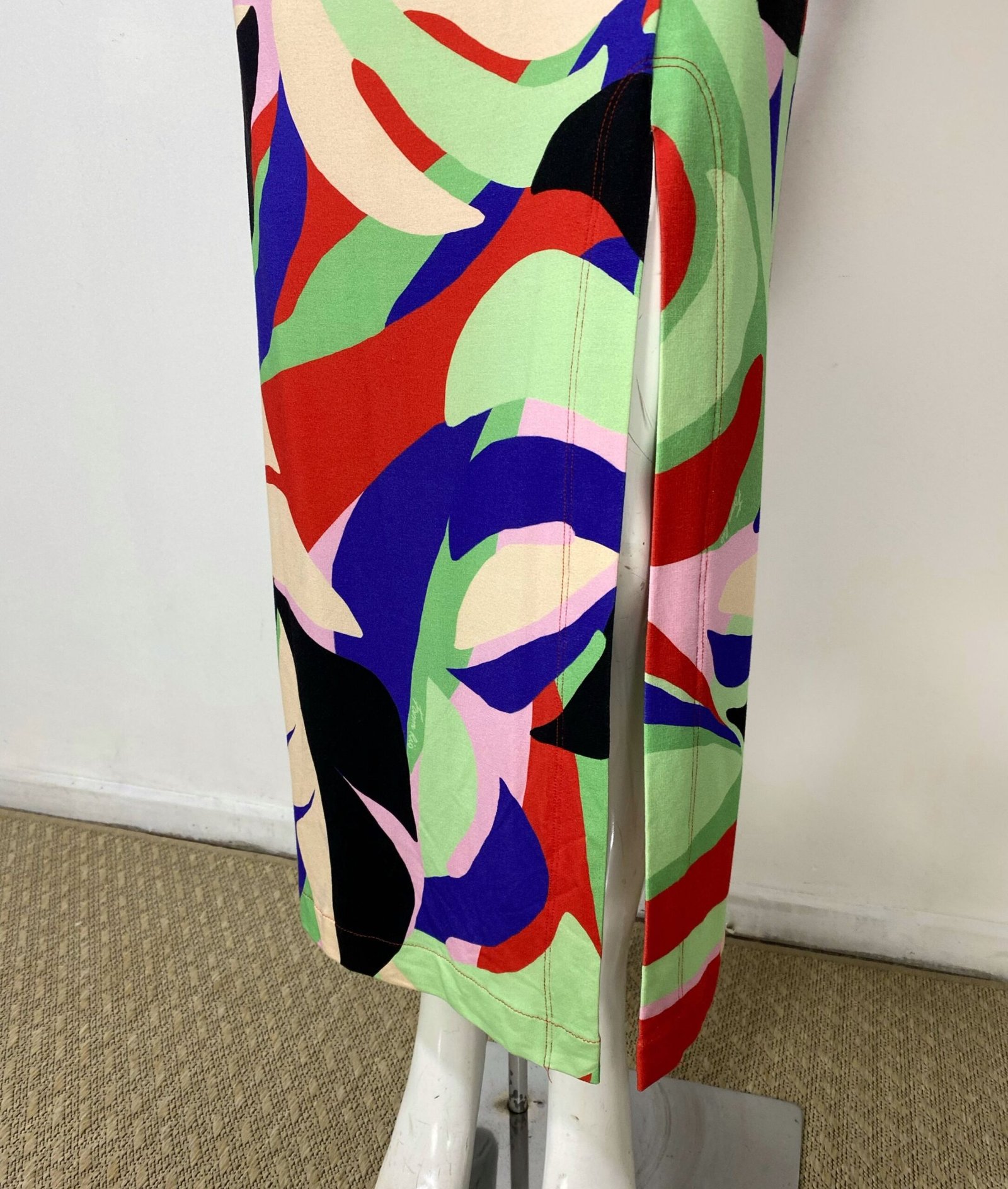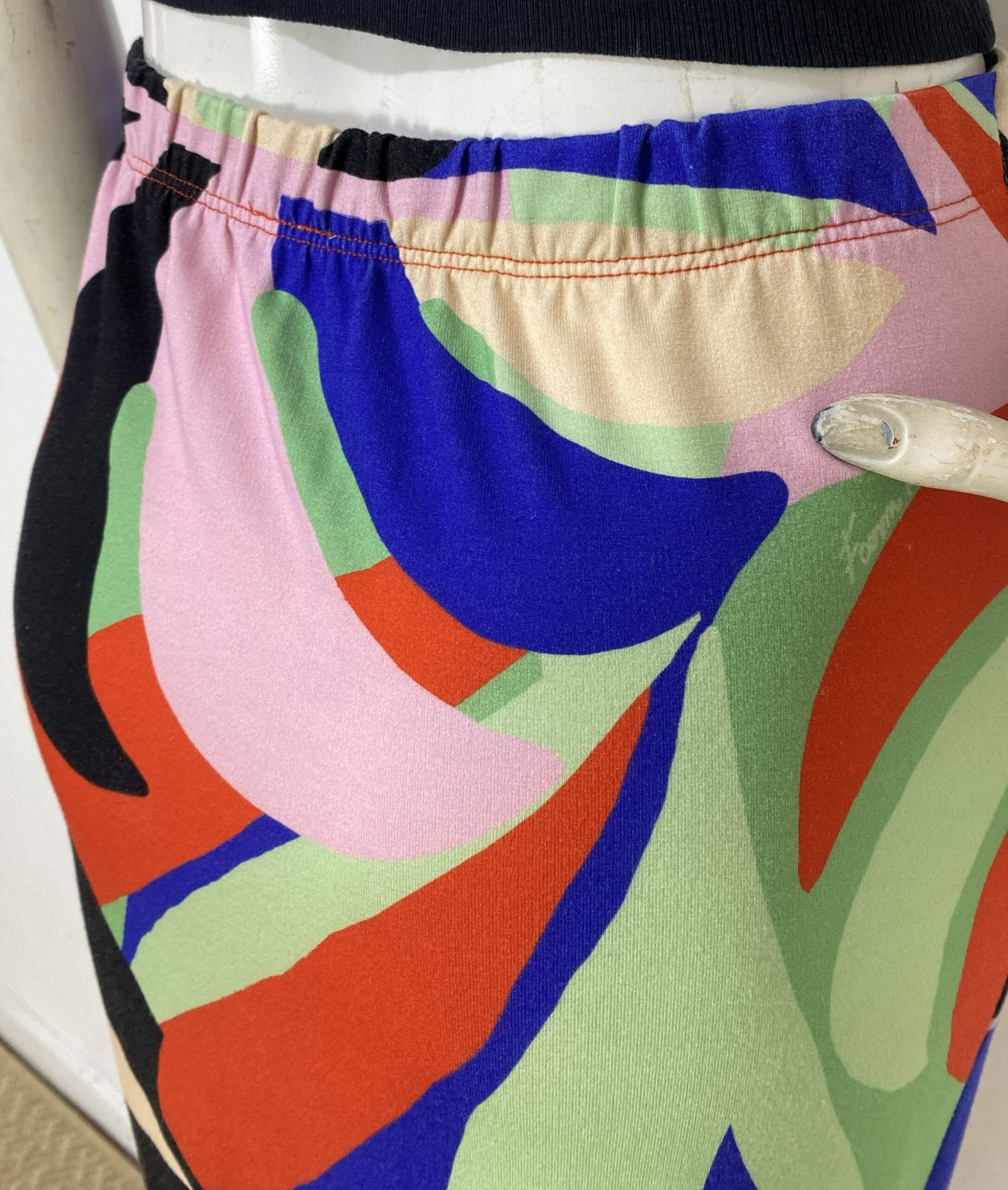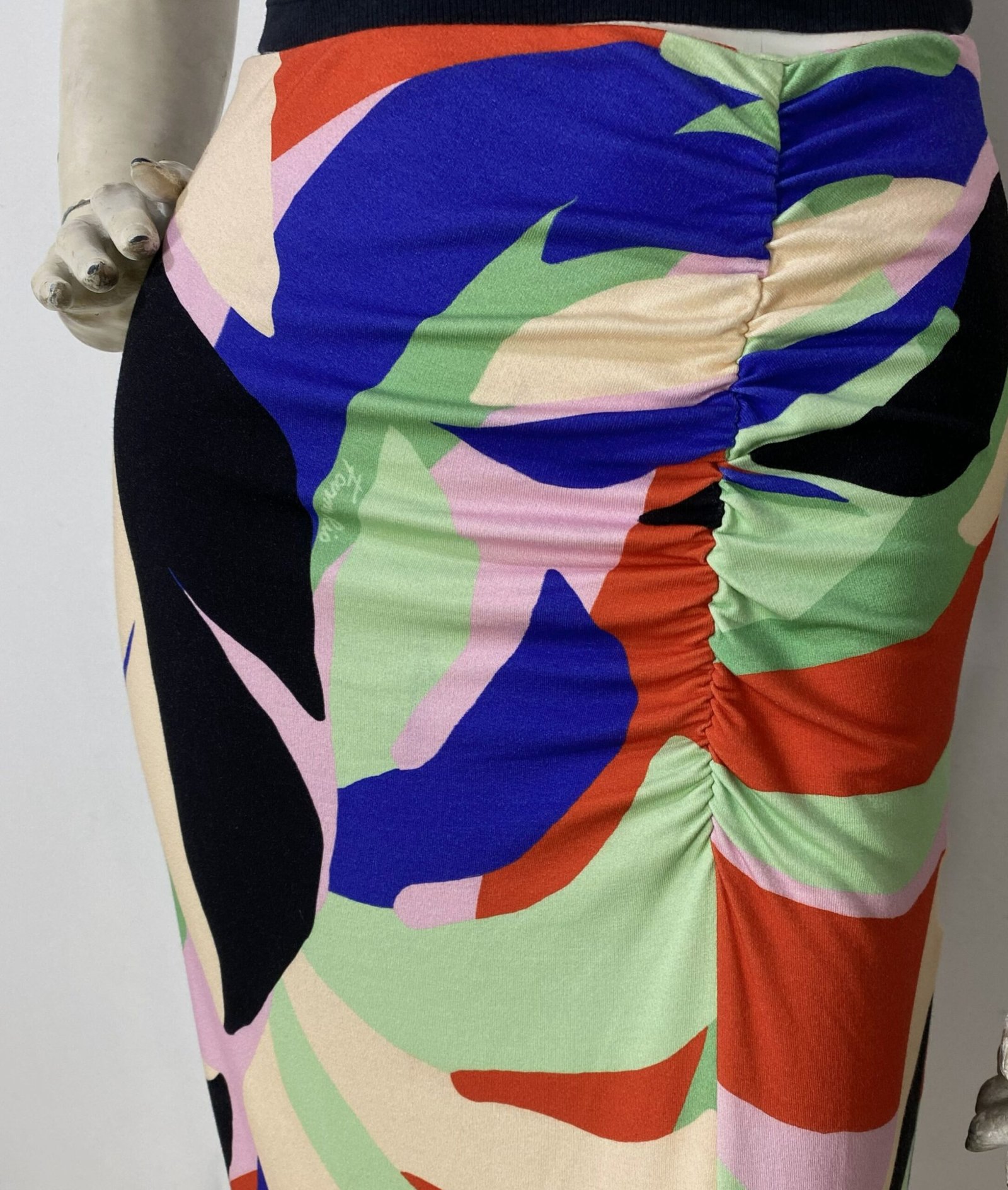 Saia midi confeccionada em malha com estampa colorida. Possui elástico na cintura, detalhe franzido e fenda frontal. Não possui forro.