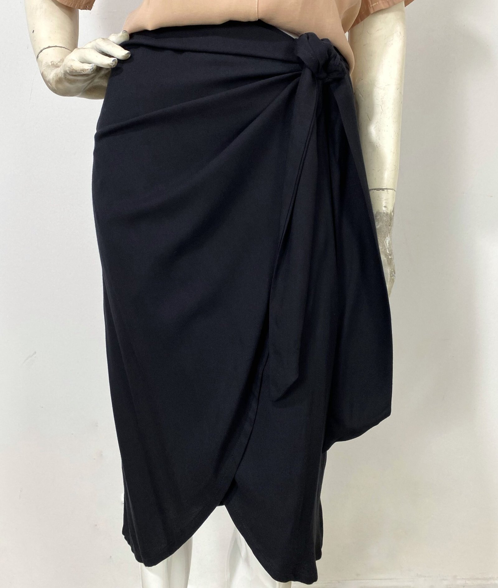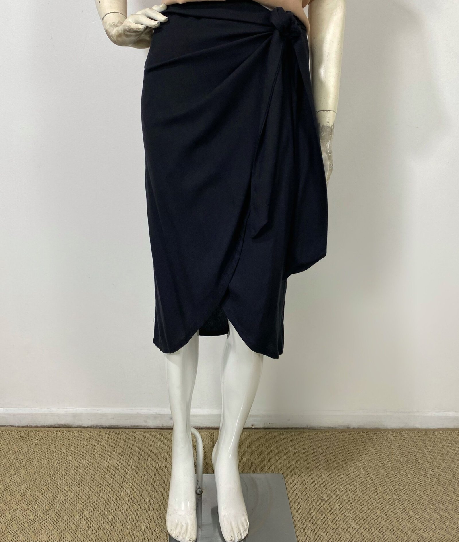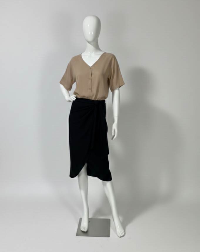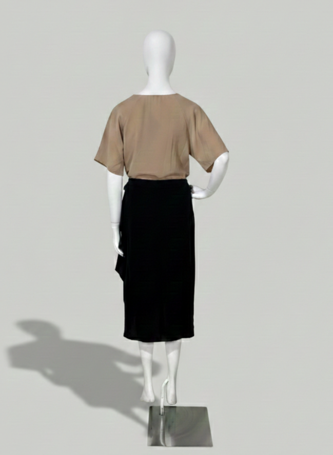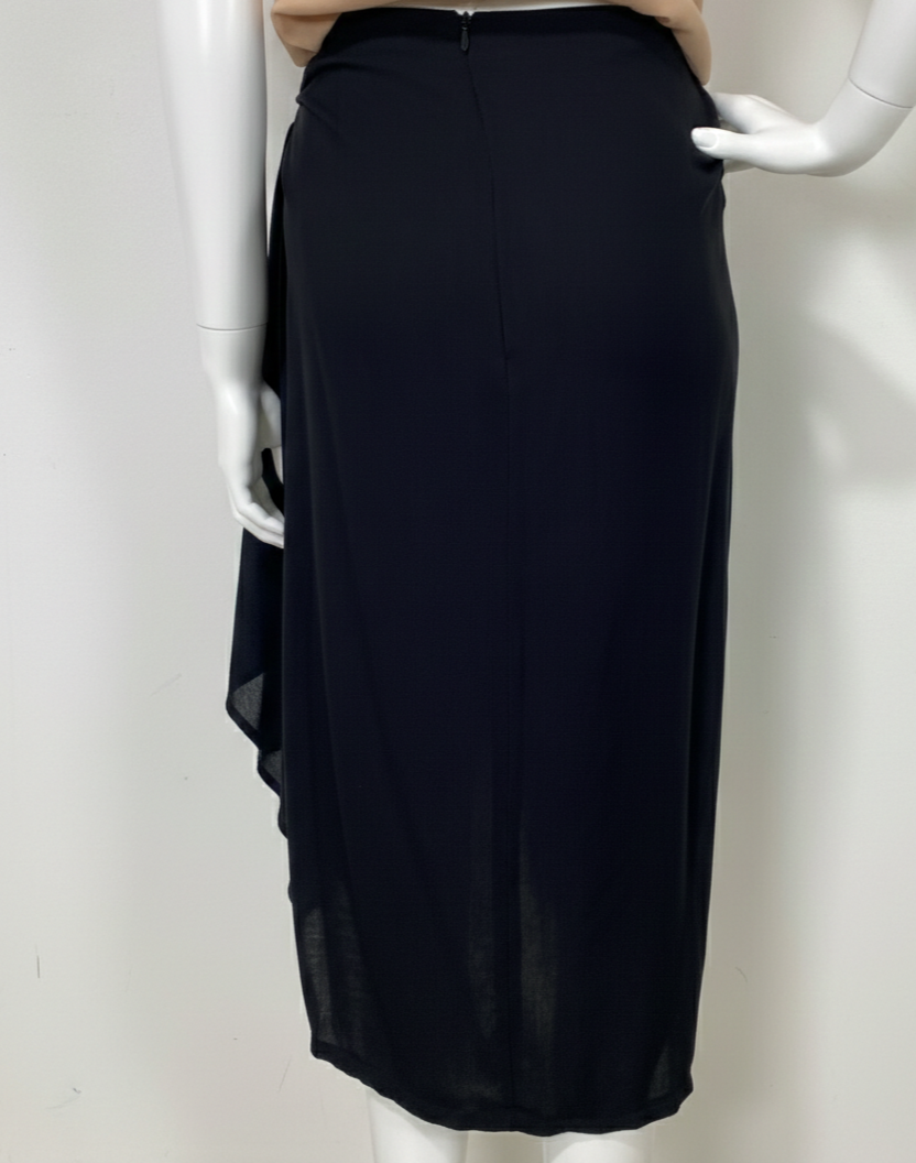 Saia midi preta confeccionada em viscose, com modelagem transpassada e amarração lateral. Não se trata de envelope total, pois possui uma parte lateral fixa. Apresenta parte frontal assimétrica e fechamento em zíper na parte posterior