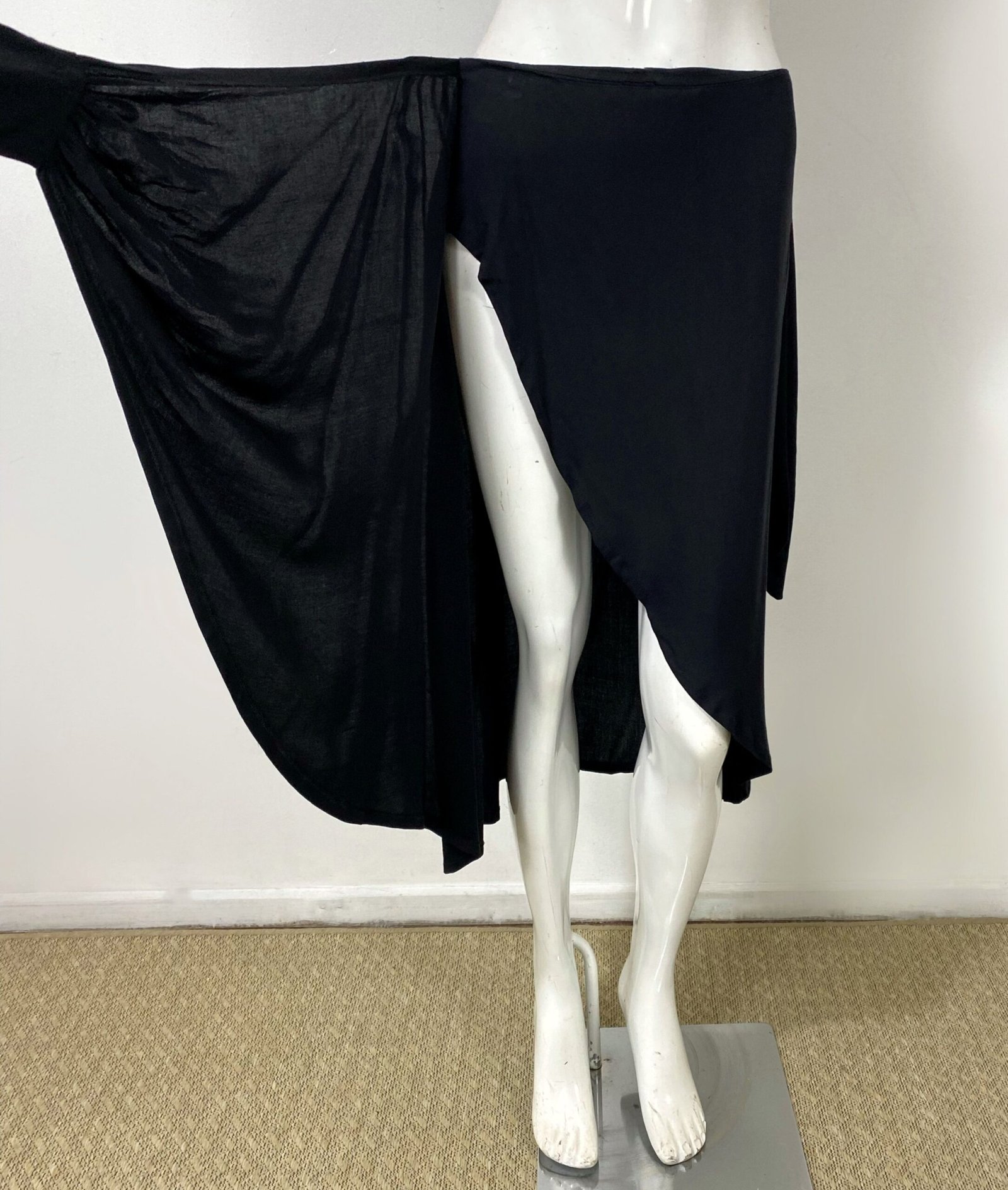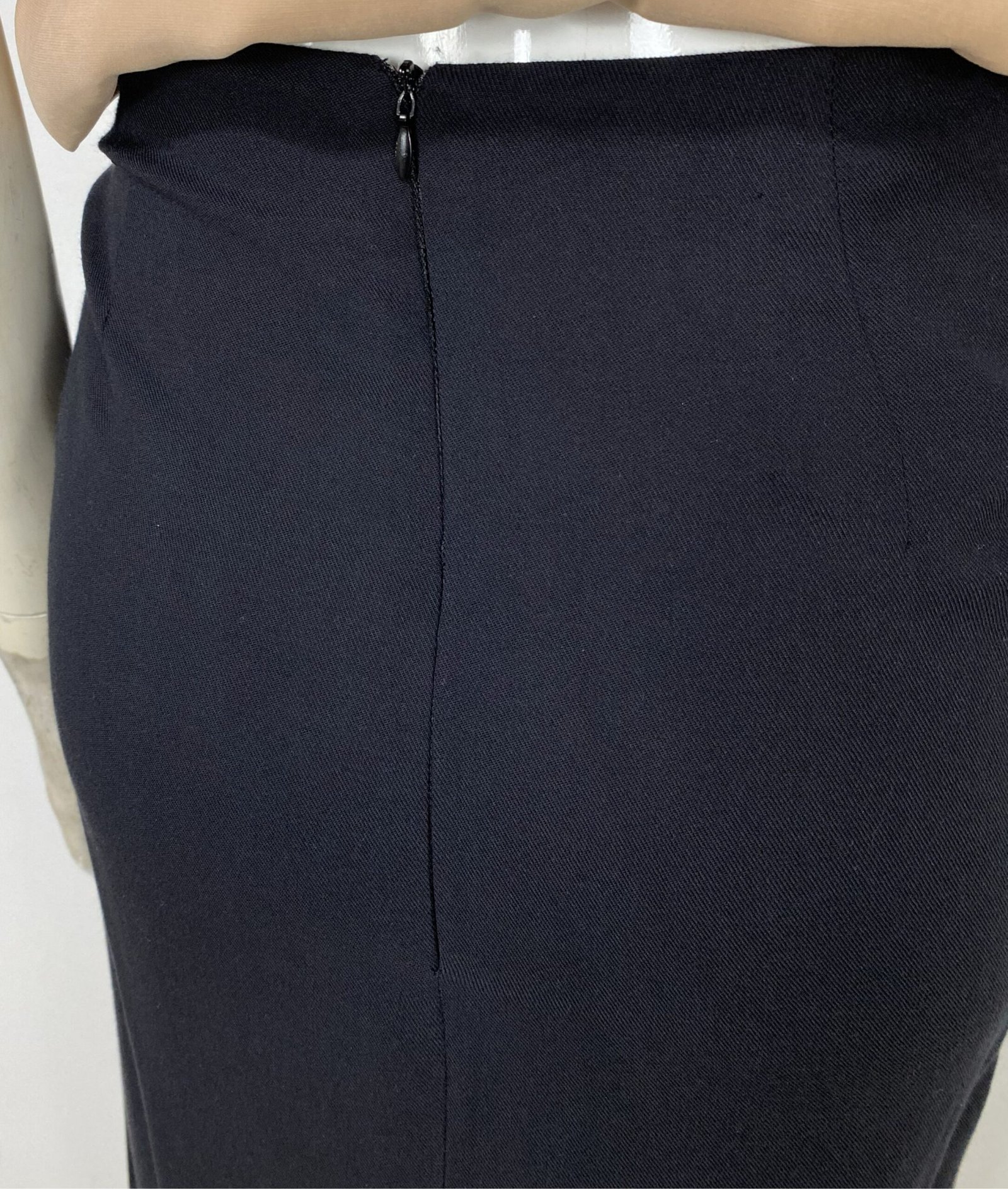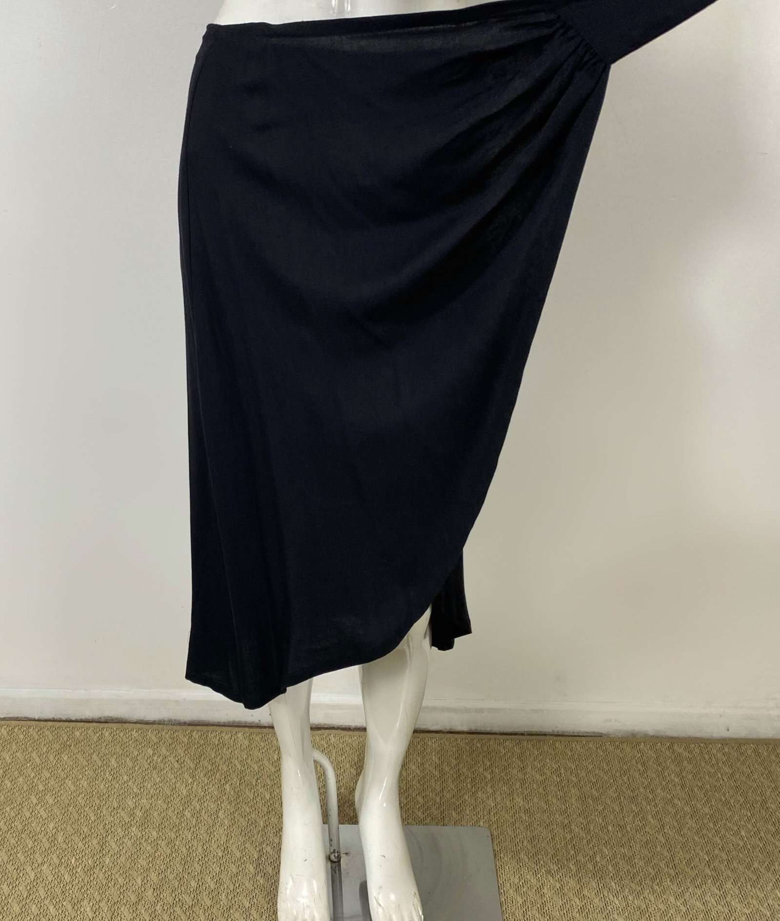 Saia midi preta confeccionada em viscose, com modelagem transpassada e amarração lateral. Não se trata de envelope total, pois possui uma parte lateral fixa. Apresenta parte frontal assimétrica e fechamento em zíper na parte posterior