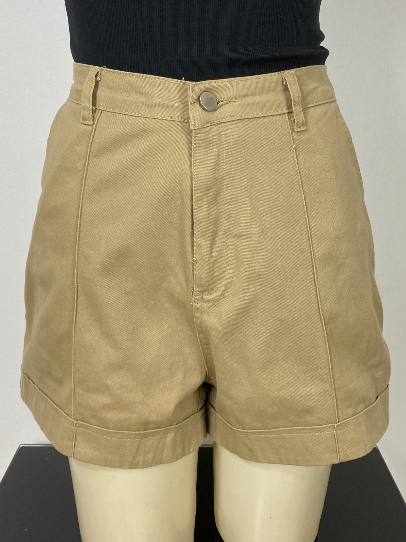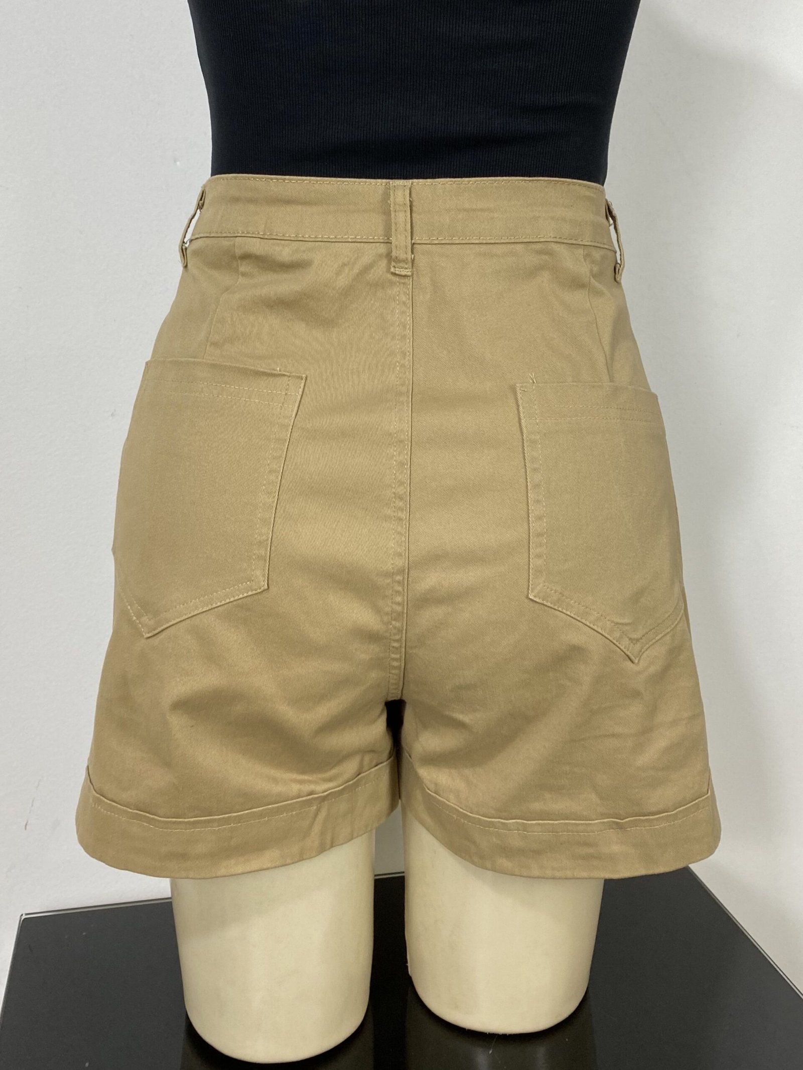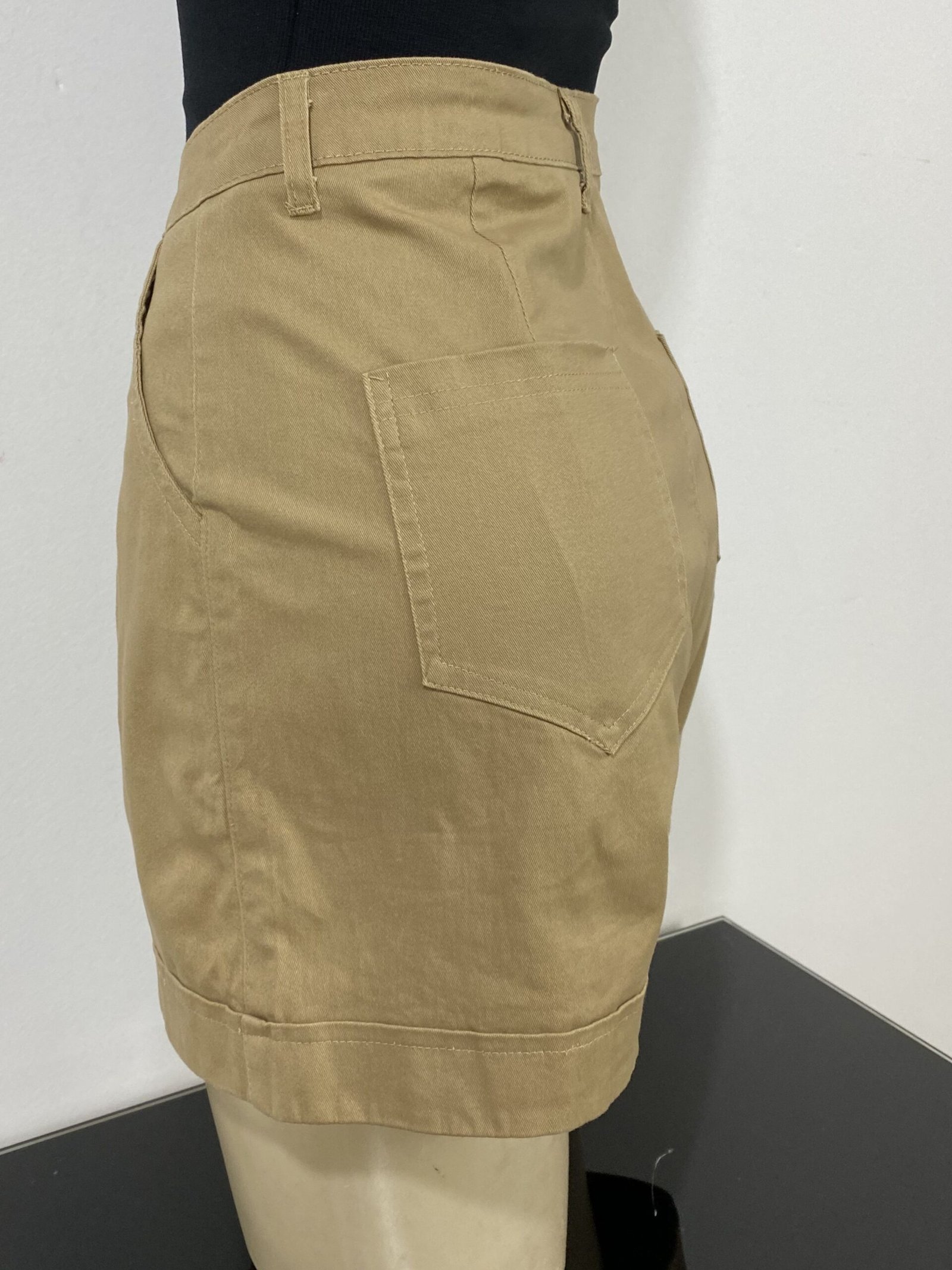 Short bege confeccionado em sarja, com cintura alta. Possui vinco frontal, bolsos frontais e traseiros, passantes para cinto ou faixas e fechamento frontal em zíper e botão.