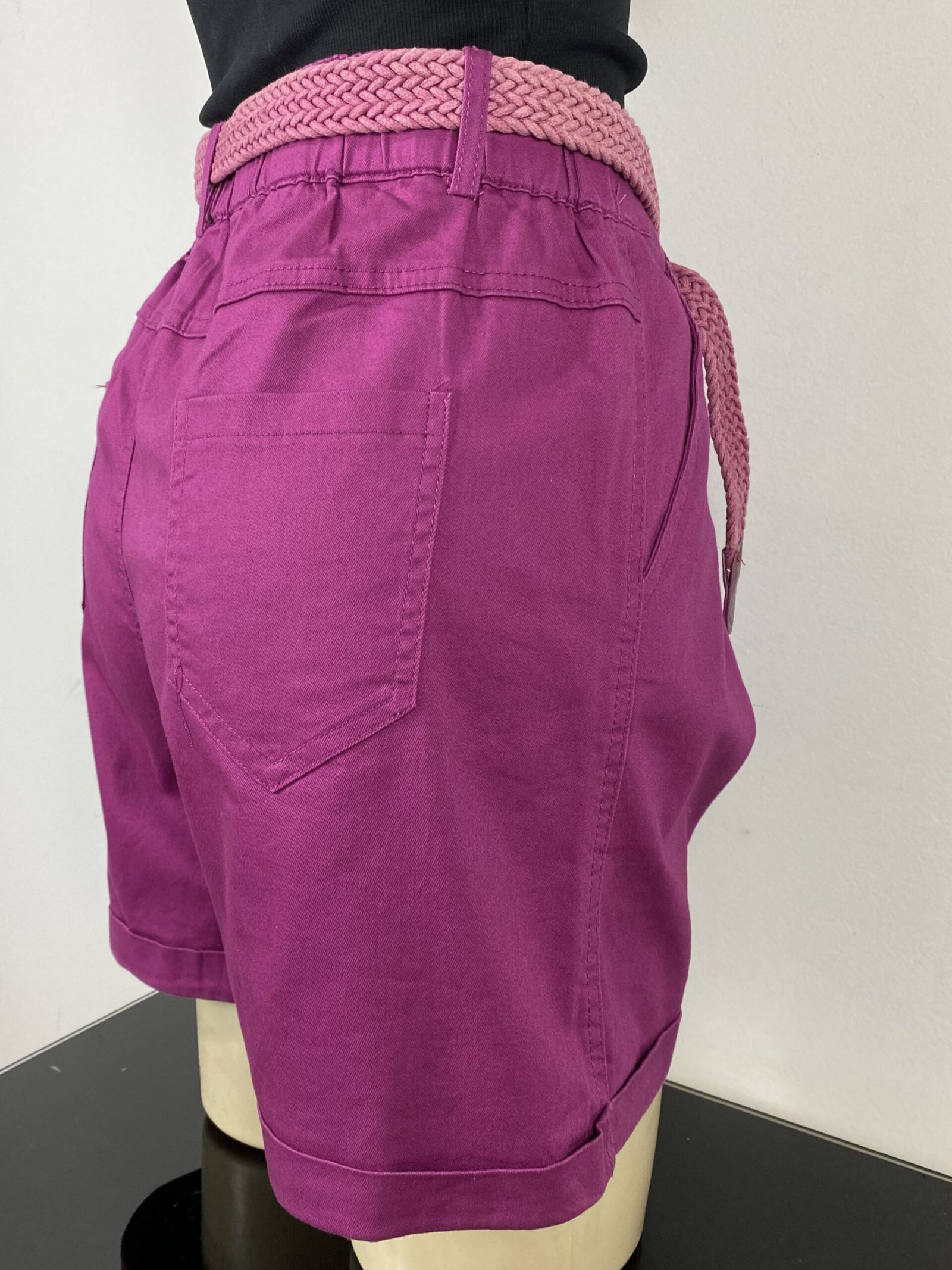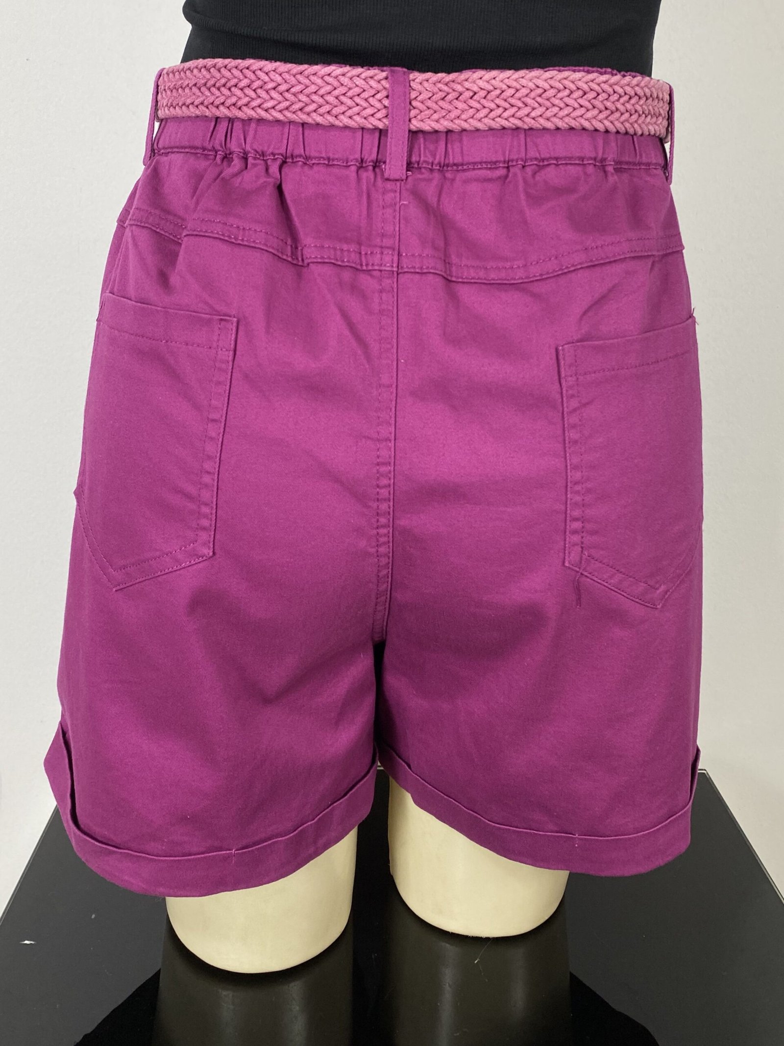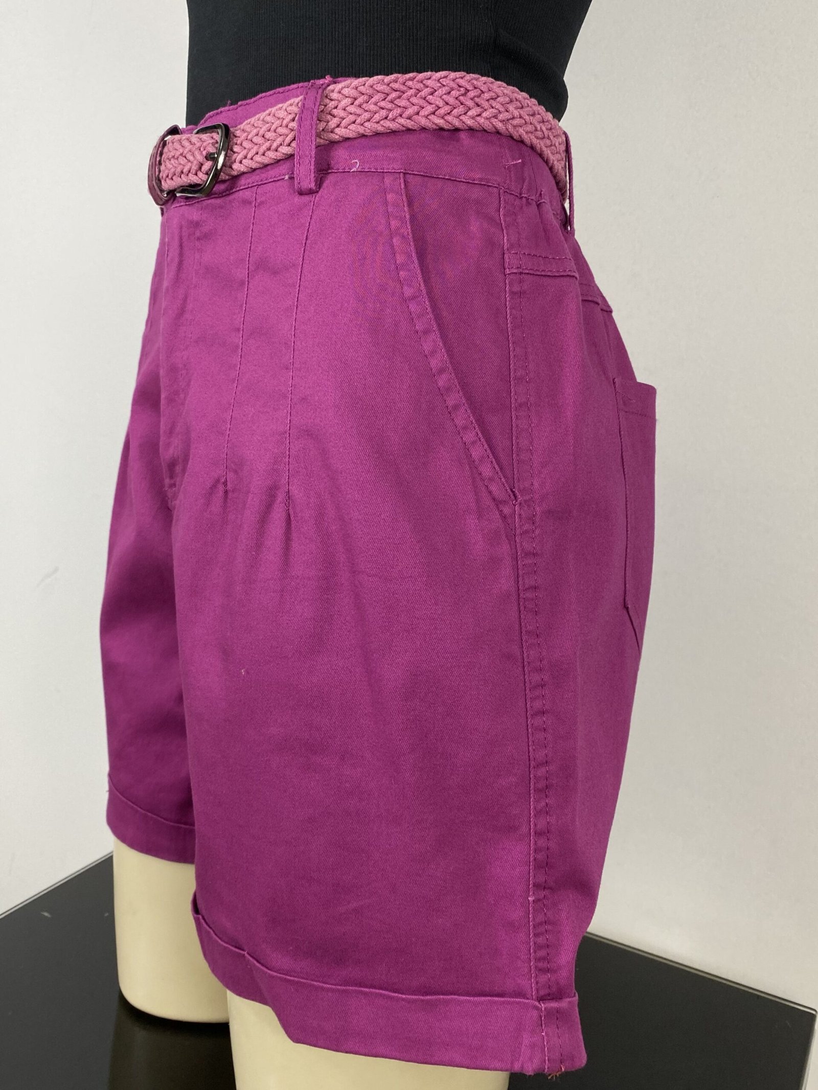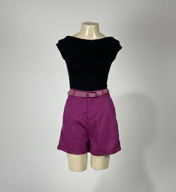 Short fúcsia com pregas frontais, com modelagem de cintura alta. Possui elástico na parte posterior da cintura, bolsos frontais e traseiros, fechamento frontal em zíper e botão, além de passantes para cinto ou faixas. Acompanha cinto trançado e conta com acabamento em barra italiana.