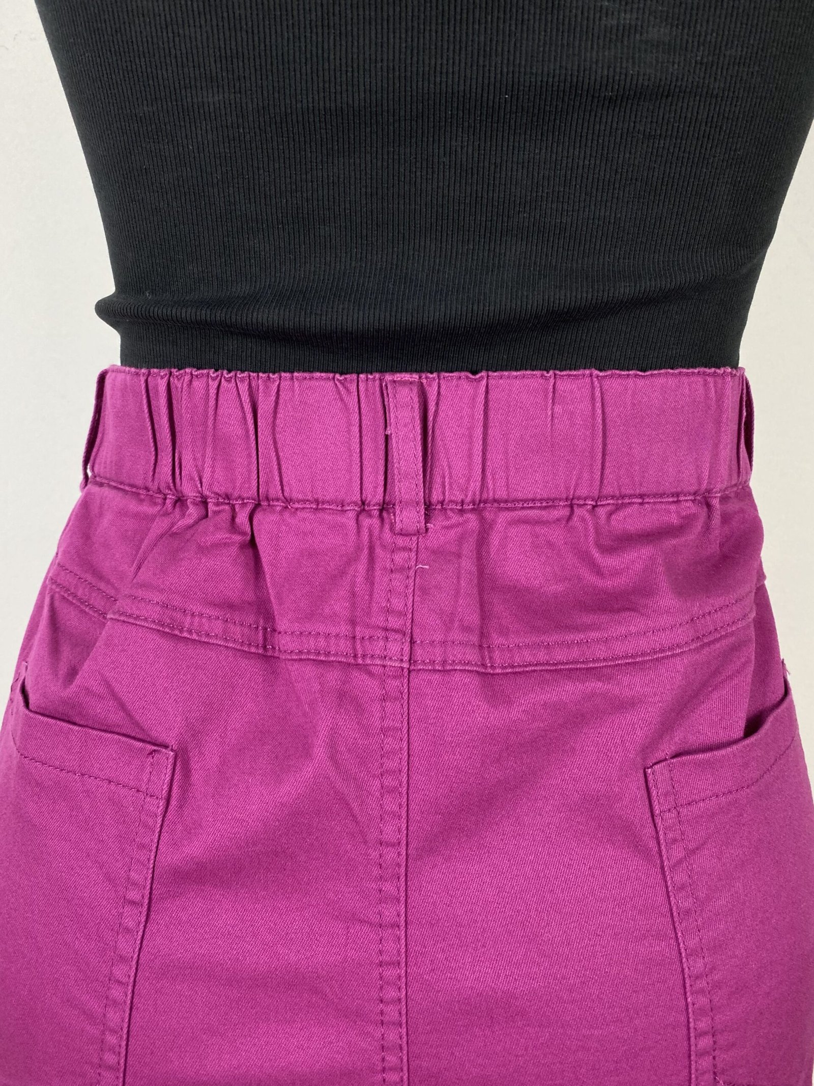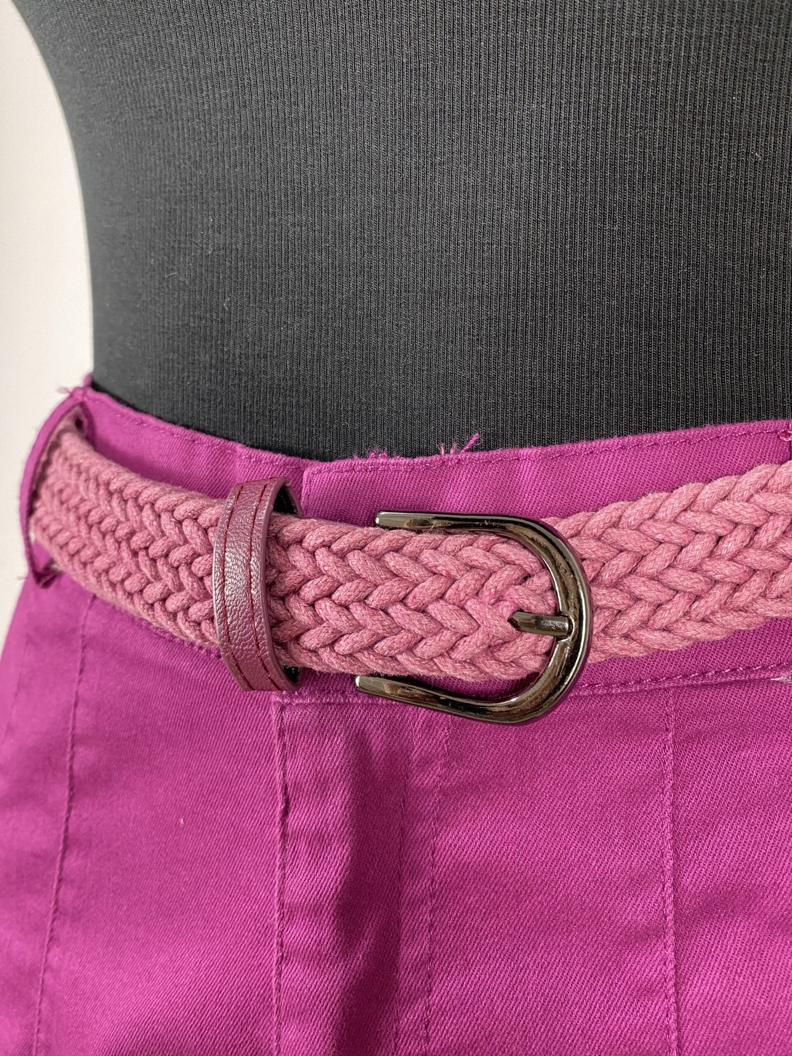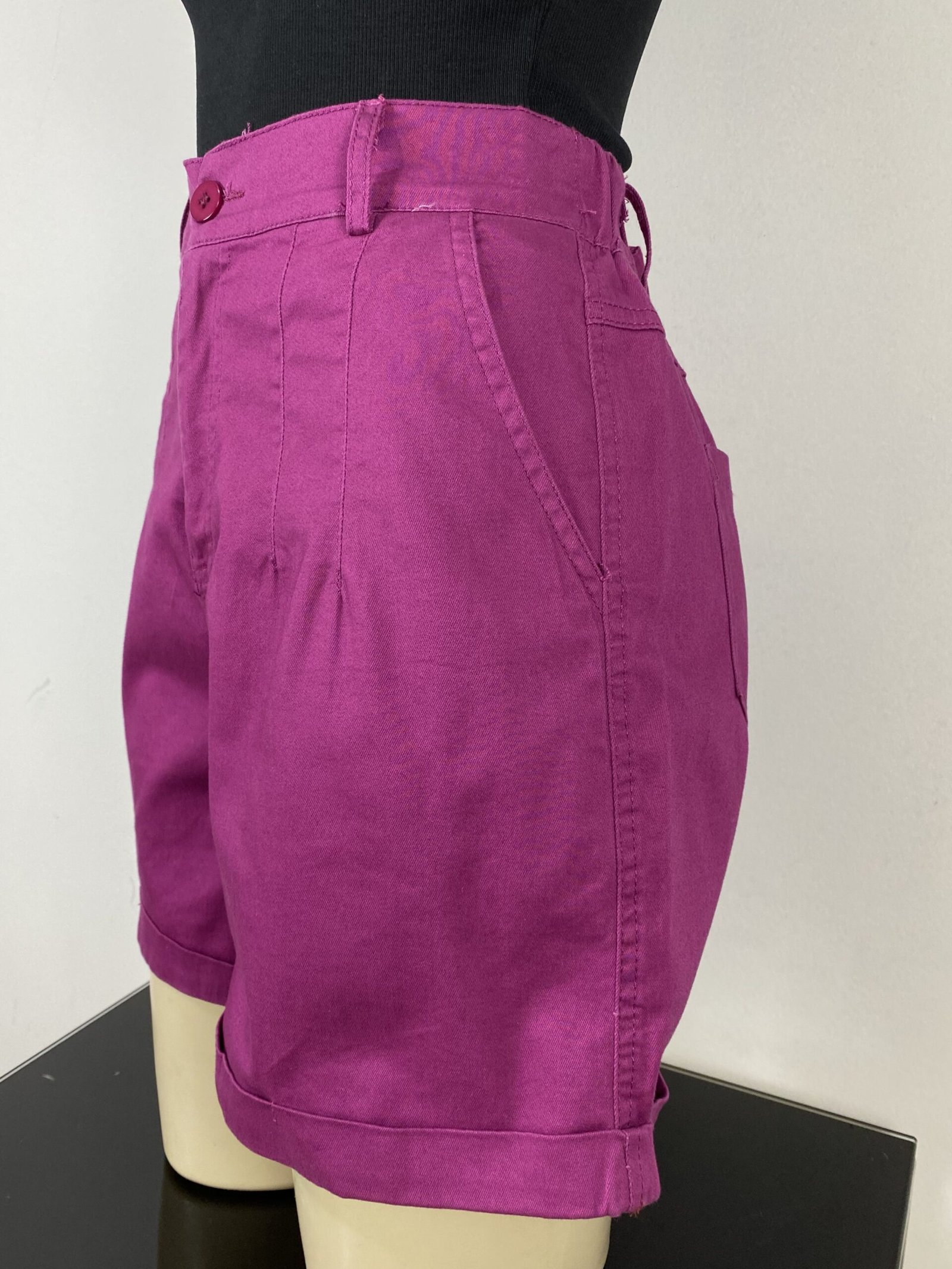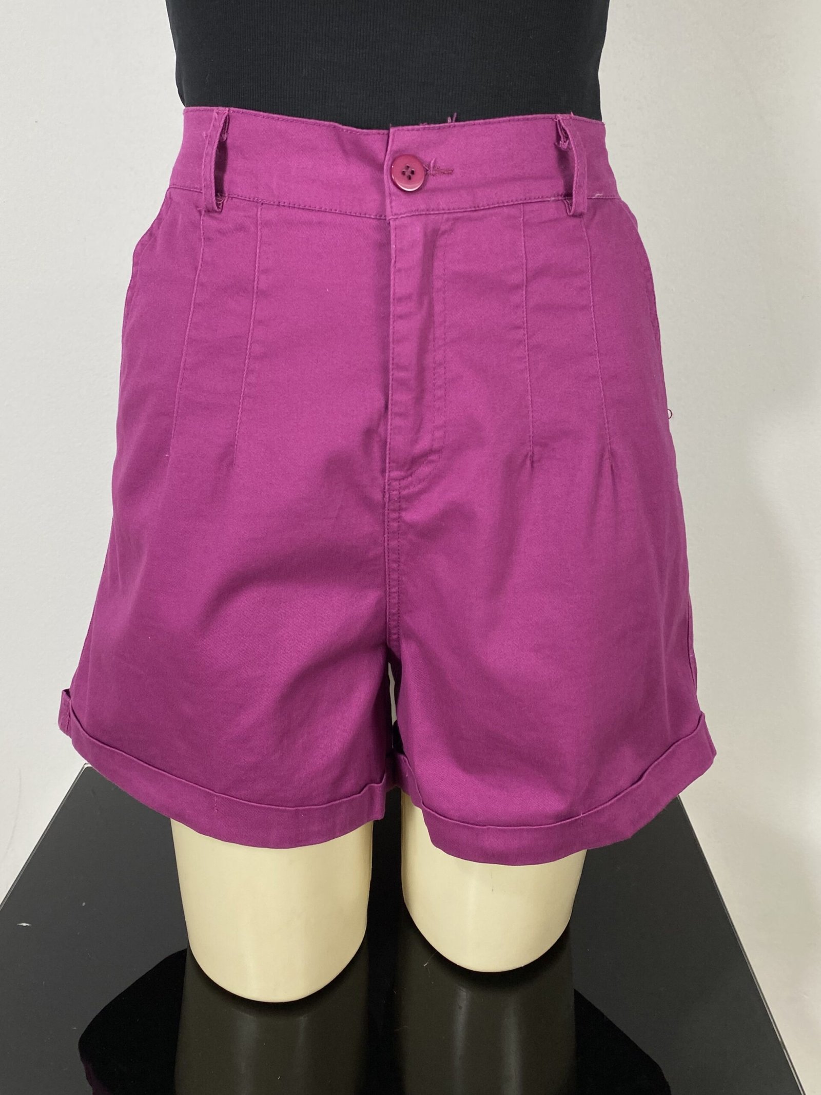 Short fúcsia com pregas frontais, com modelagem de cintura alta. Possui elástico na parte posterior da cintura, bolsos frontais e traseiros, fechamento frontal em zíper e botão, além de passantes para cinto ou faixas. Acompanha cinto trançado e conta com acabamento em barra italiana.