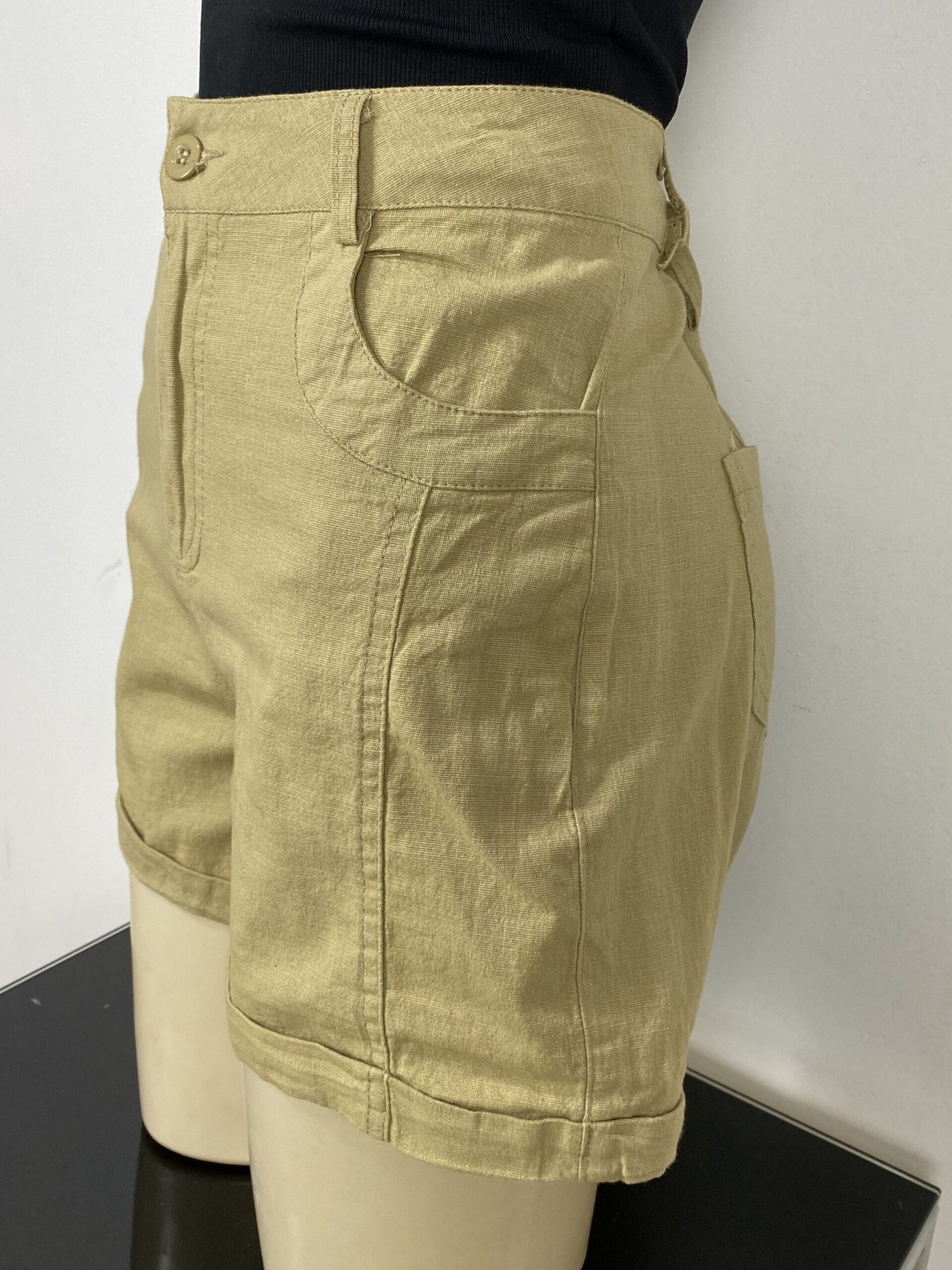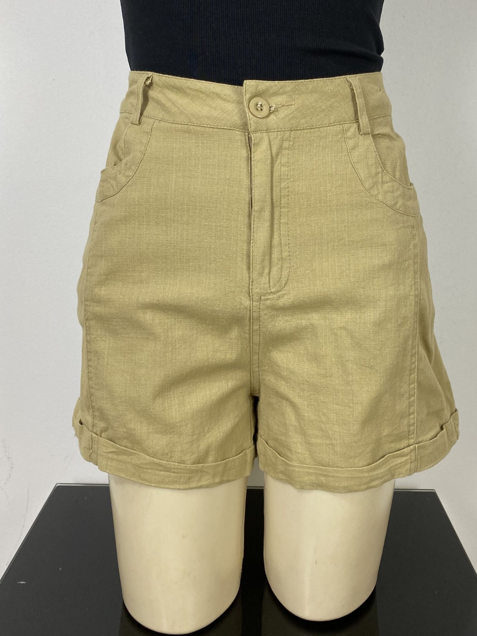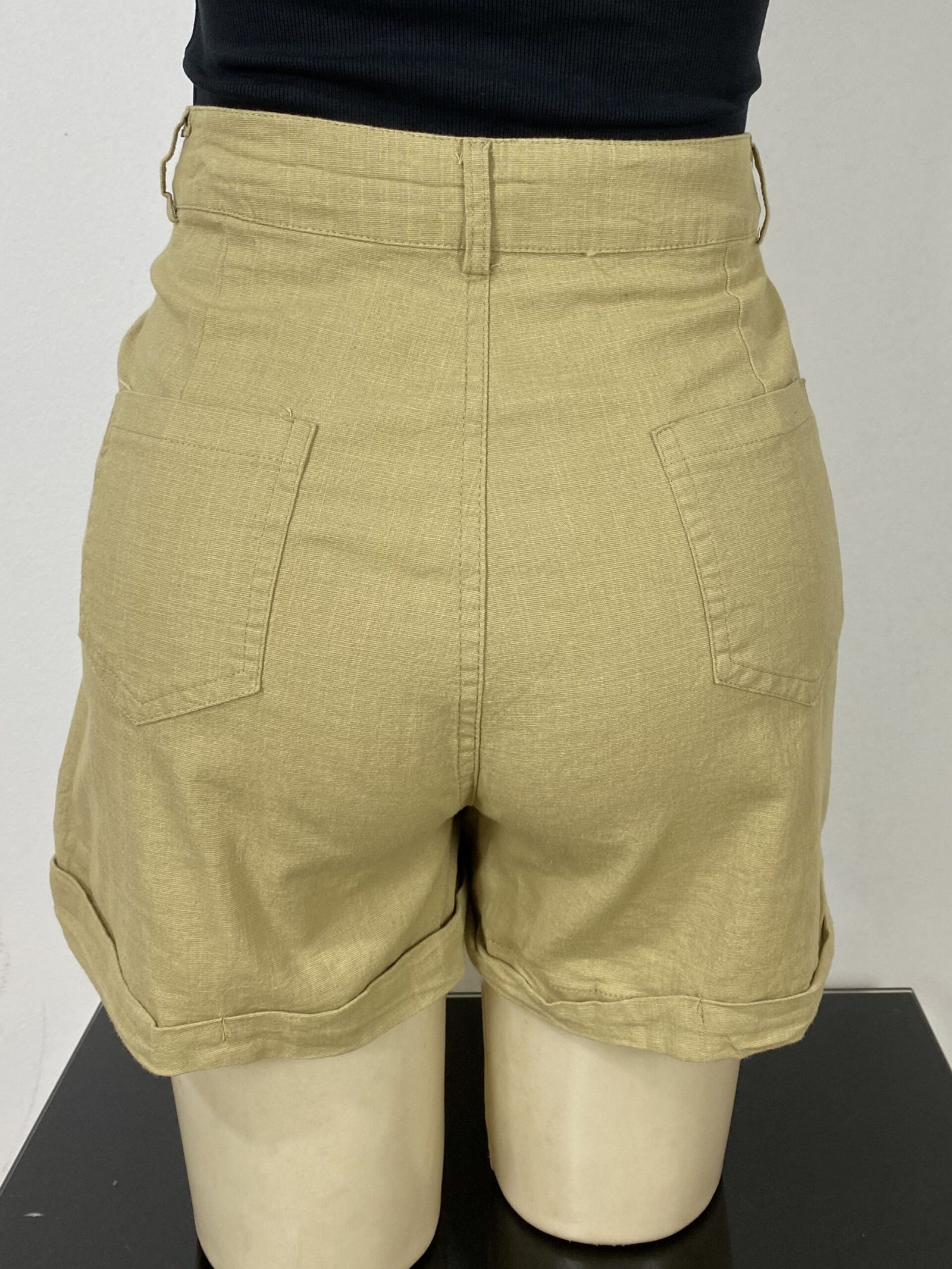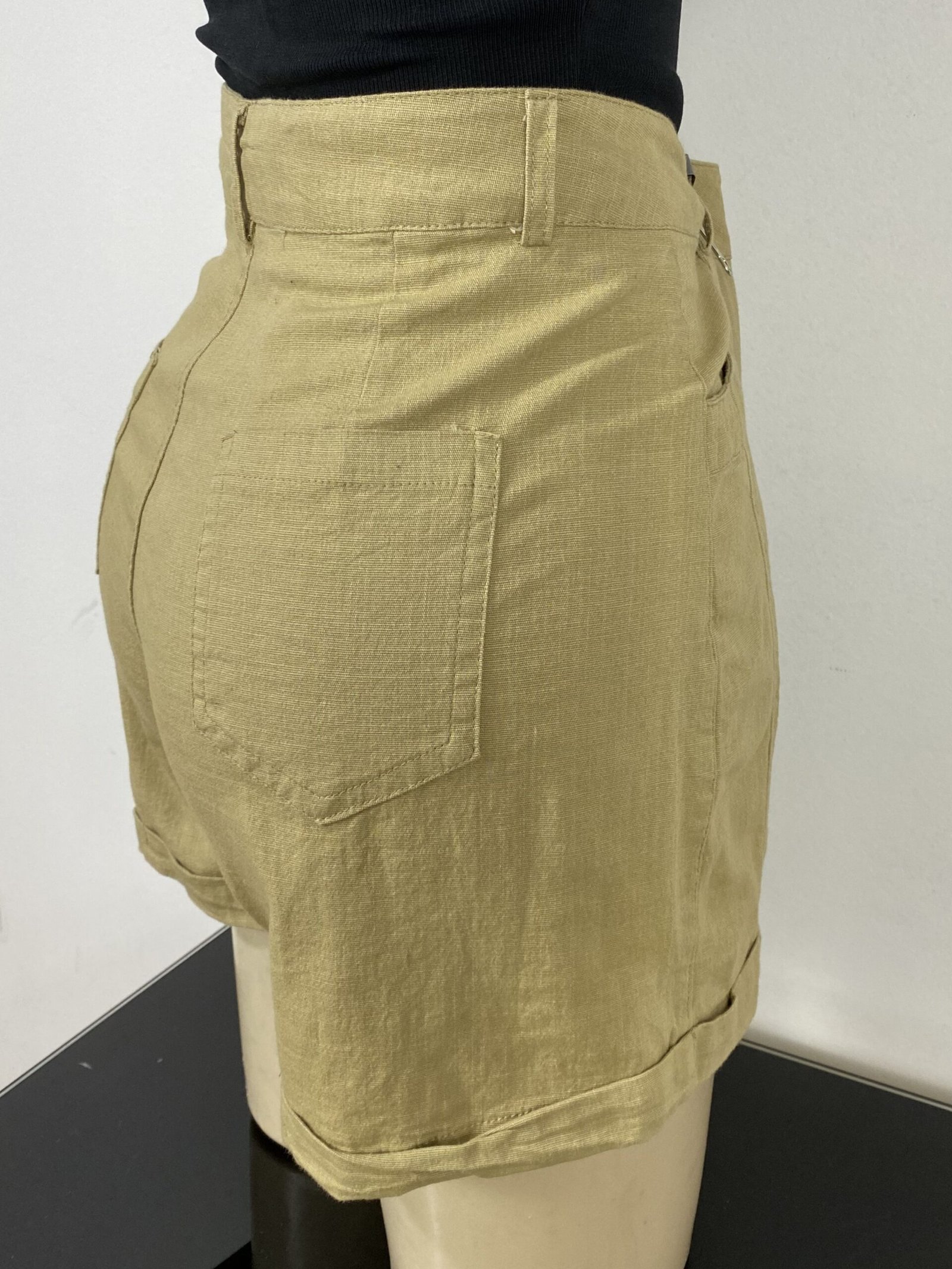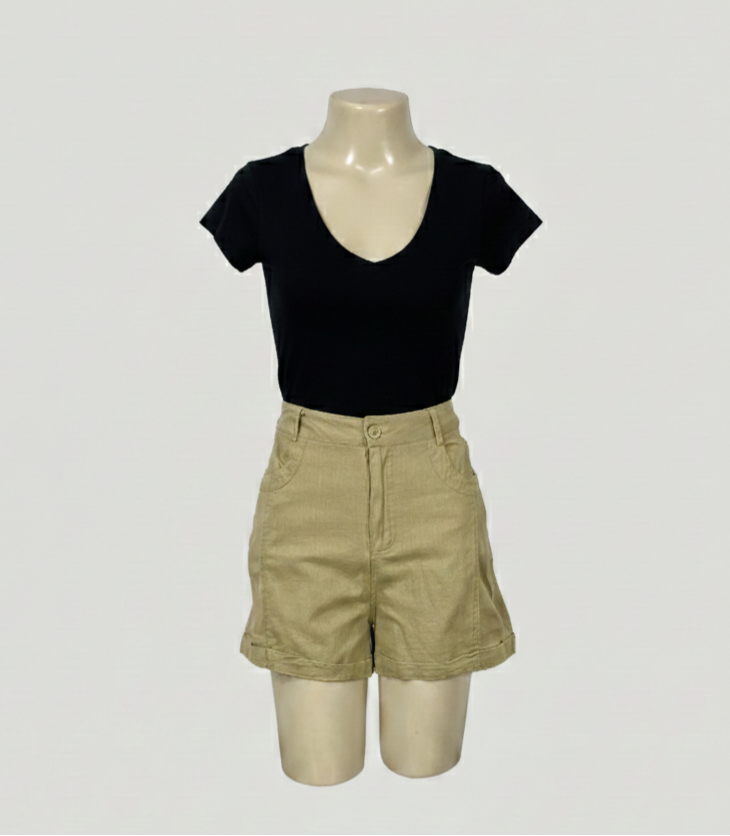 Short mostarda, confeccionado em algodão com elasticidade e pespontos frontais. Possui cintura alta, bolsos frontais e traseiros, passantes para cinto ou faixas e fechamento frontal em zíper e botão. Conta com acabamento em barra italiana.