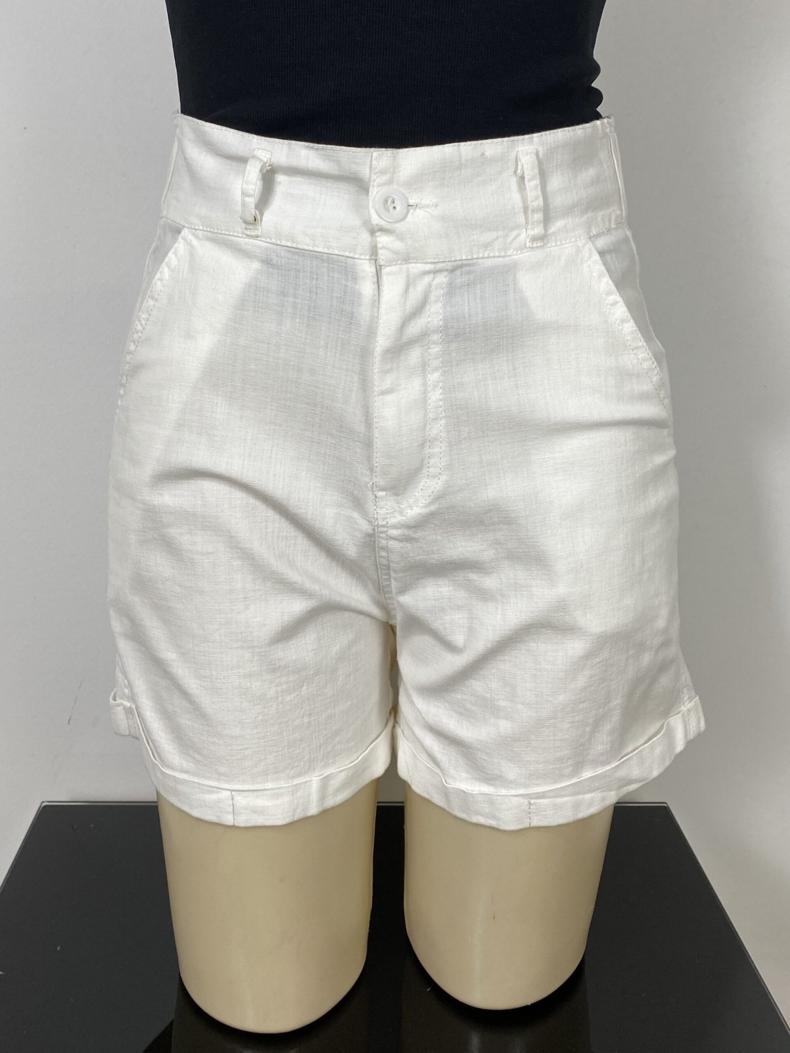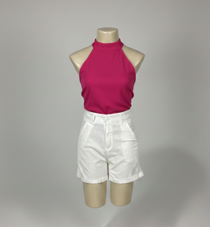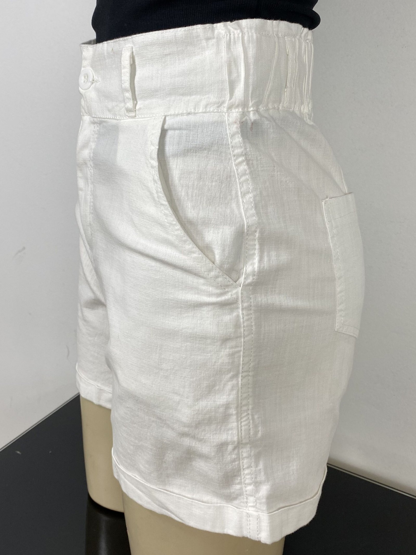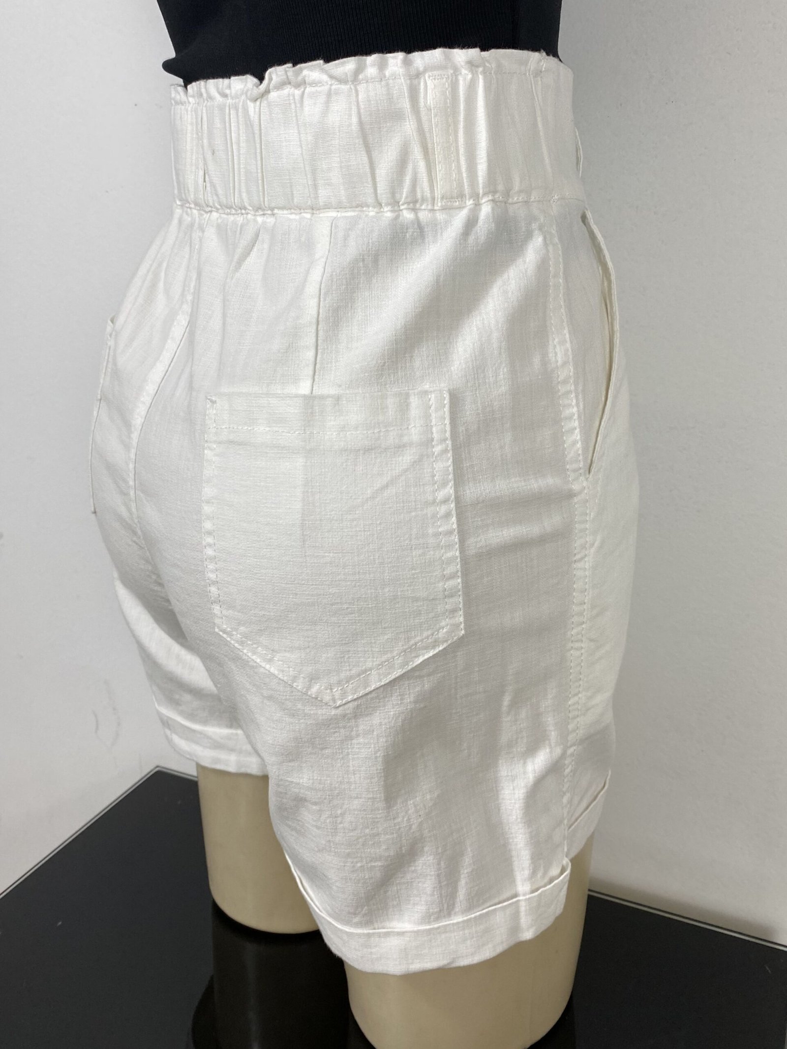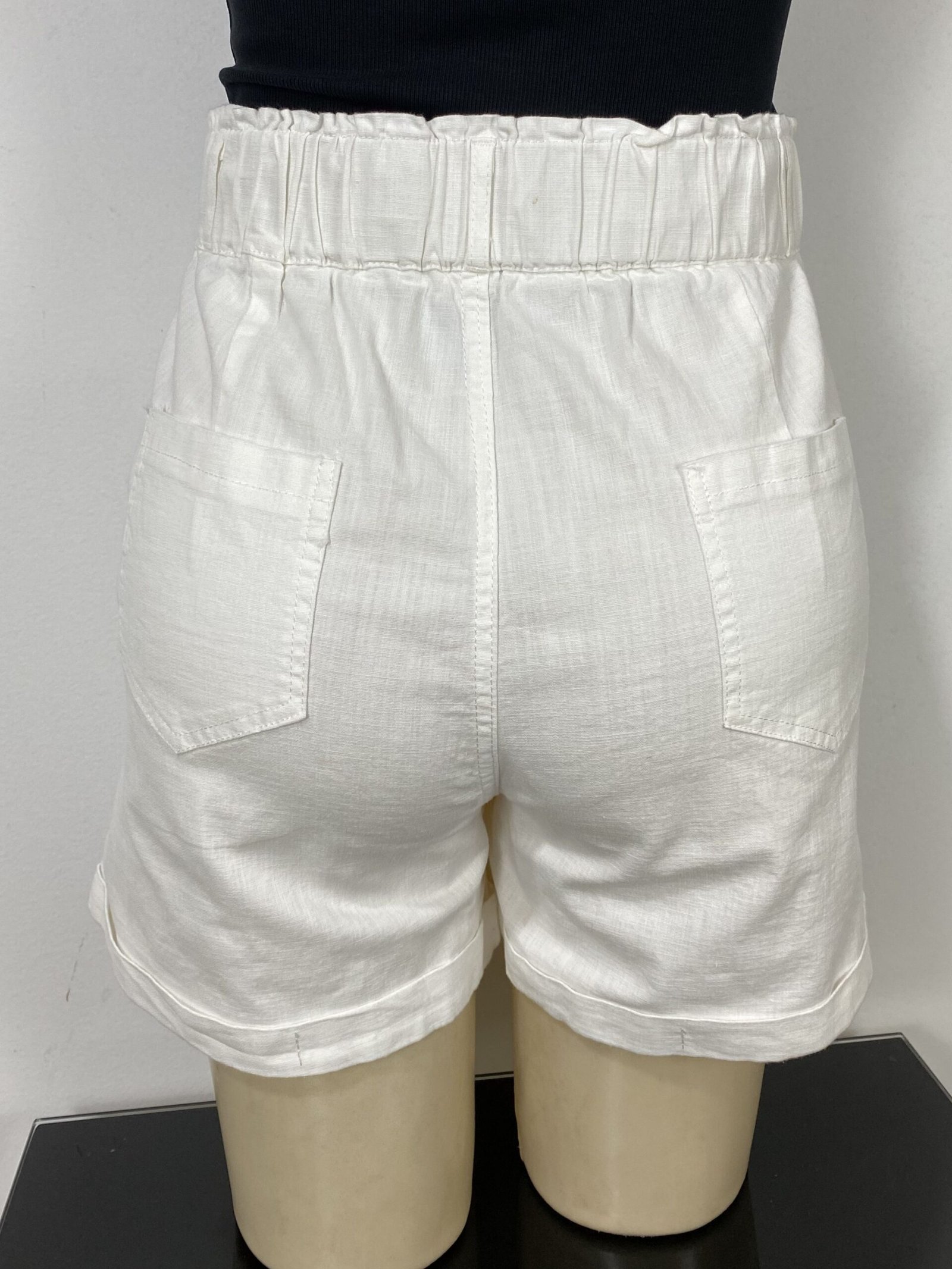 Short off-white com elástico na parte posterior da cintura, proporcionando melhor ajuste ao corpo. Possui cintura alta, fechamento frontal em zíper e botão, bolsos frontais e traseiros, além de acabamento em barra italiana.