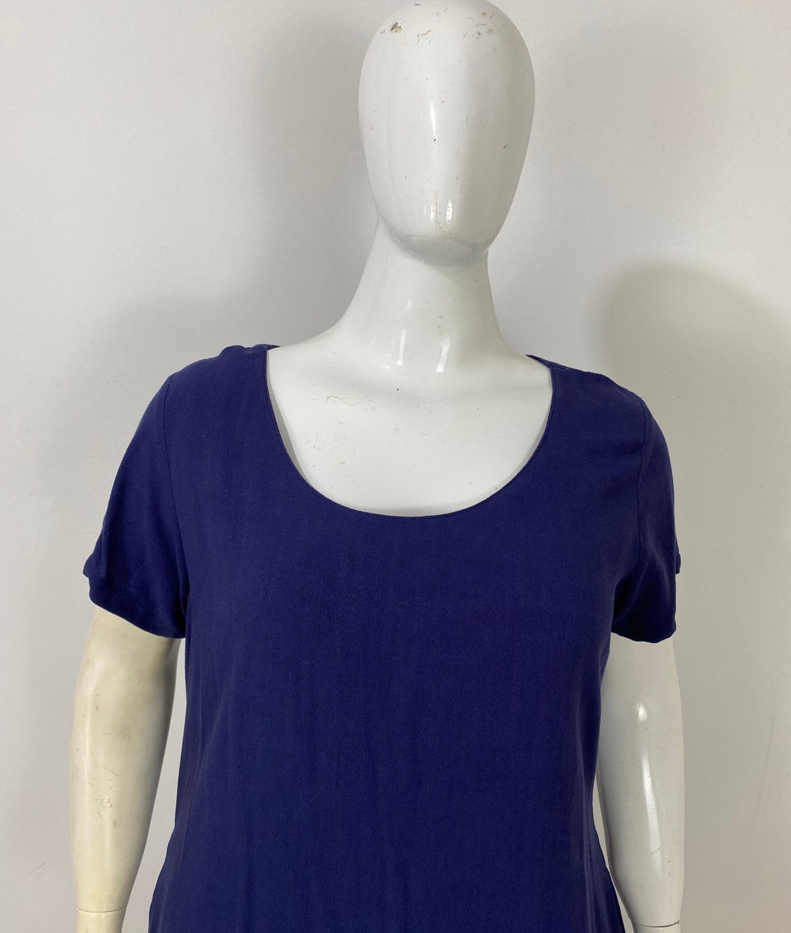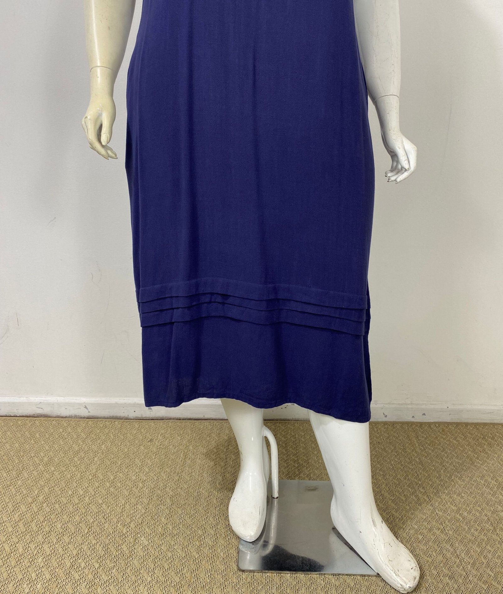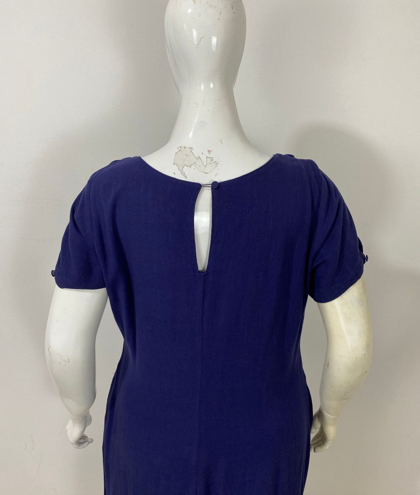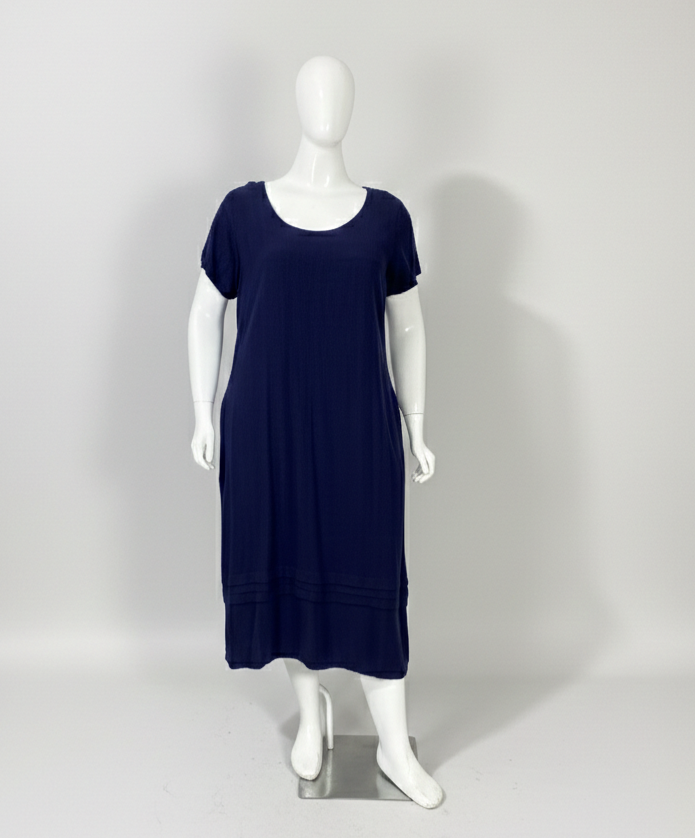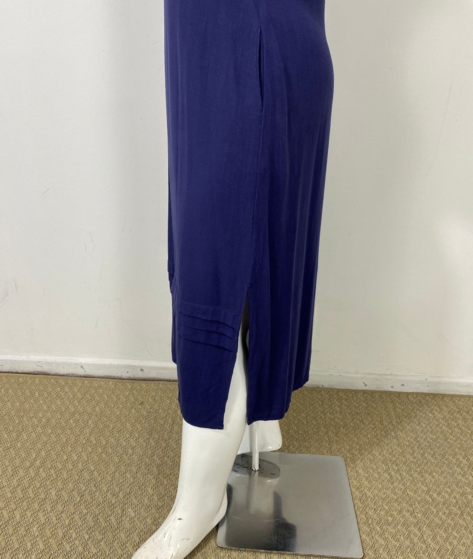 Vestido midi em viscolinho na cor azul marinho, com manga curta e decote redondo. Apresenta fendas laterais curtas ao longo das pernas e fenda em gota nas costas com fechamento por botão.