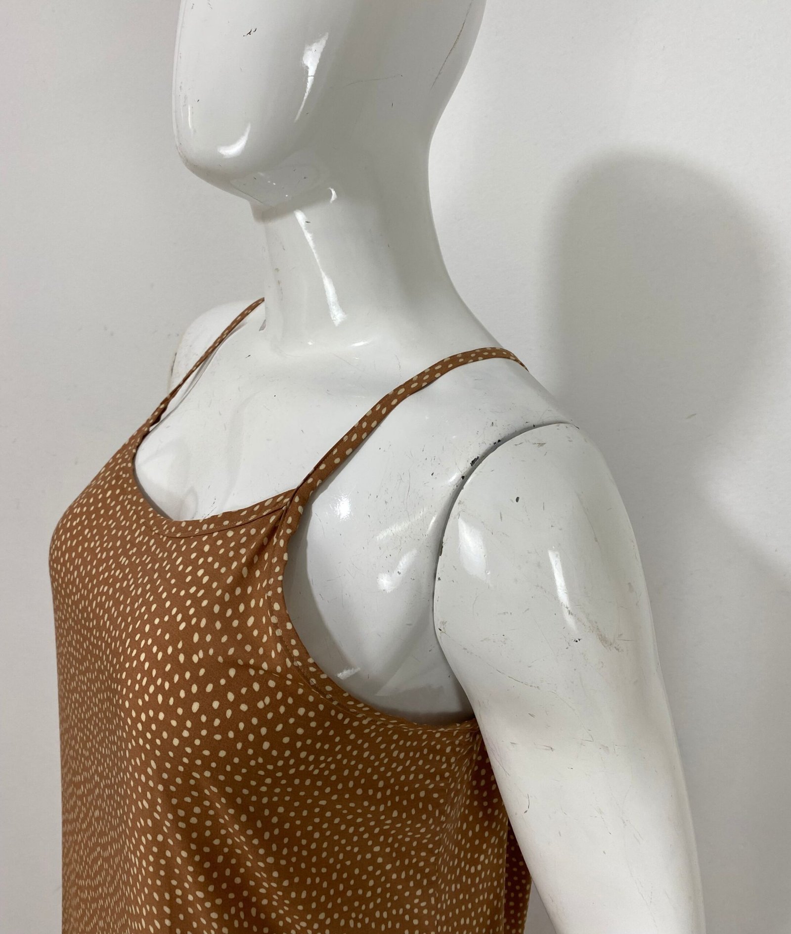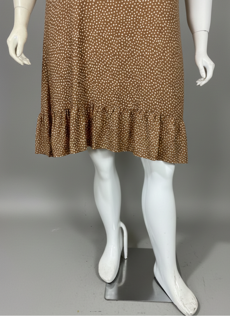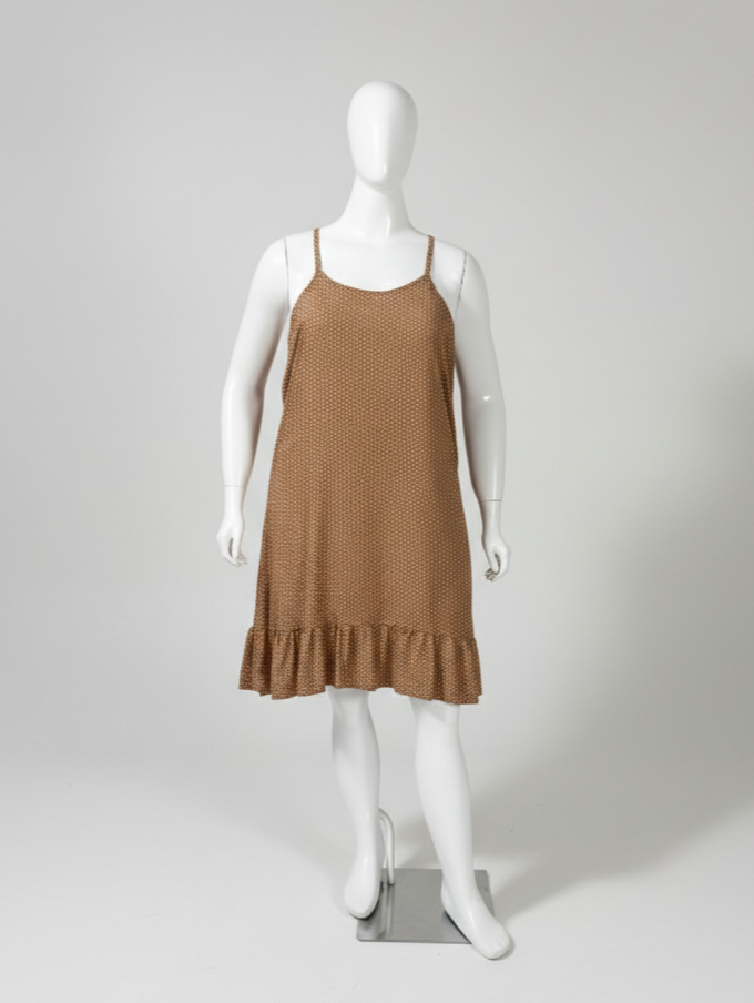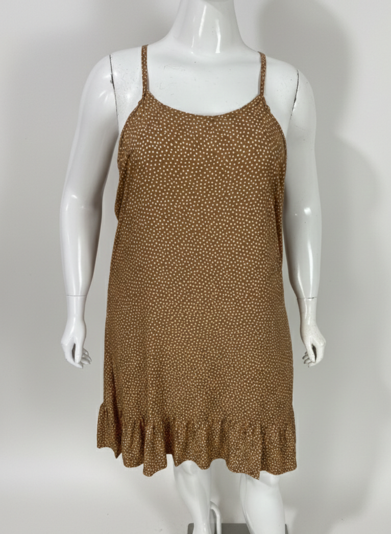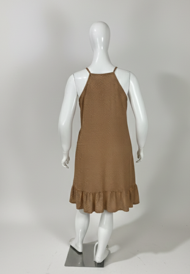Vestido bege estampado com bolinhas disformes, alças finas e reguláveis. Leve e fresco! Com babado na barra.