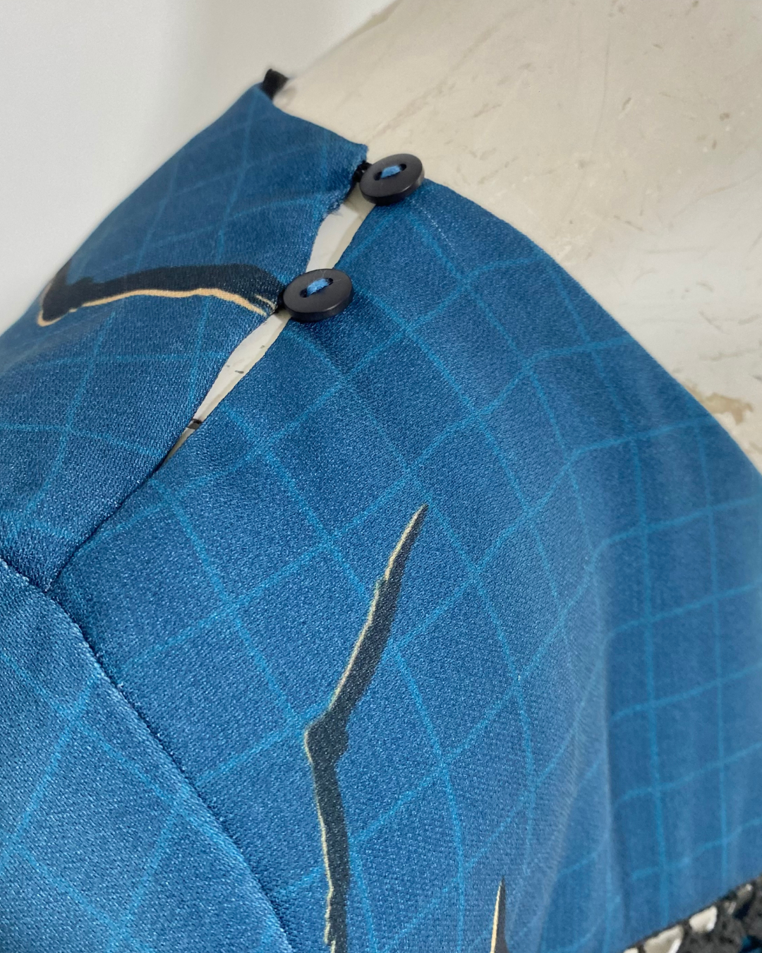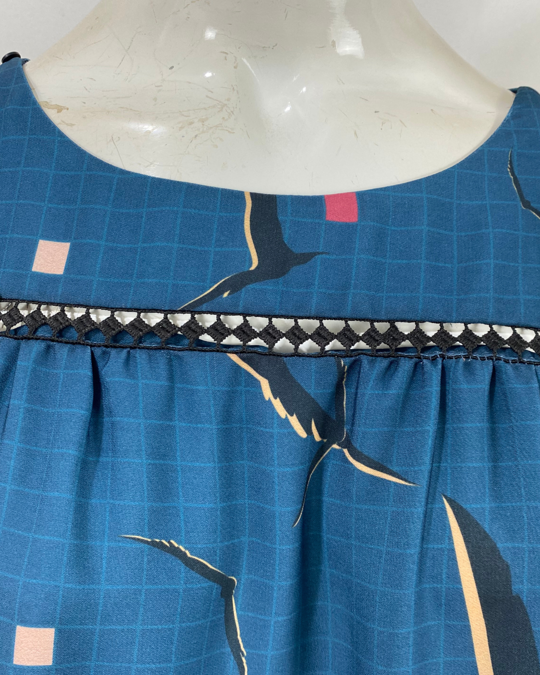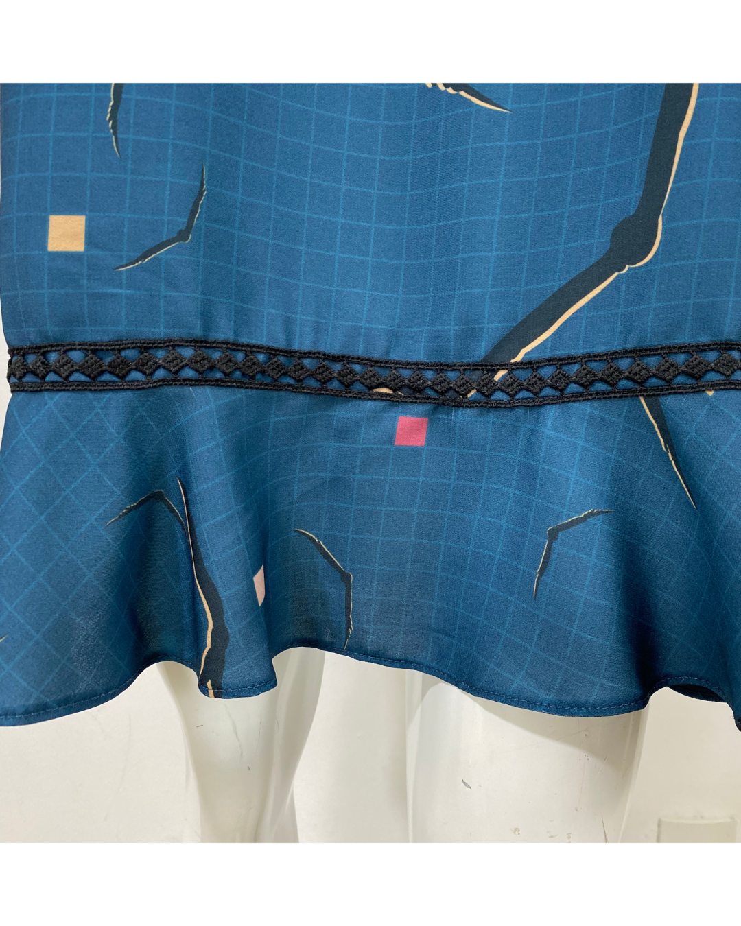 Vestido na cor azul petróleo, confeccionado em tecido leve, com mix de estampas em xadrez e pássaros. Possui modelagem reta, caimento solto ao corpo, mangas longas e acabamento com babados nos punhos e na barra. Não possui forro, porém o tecido não apresenta transparência. O fechamento é realizado por botões em um dos ombros.