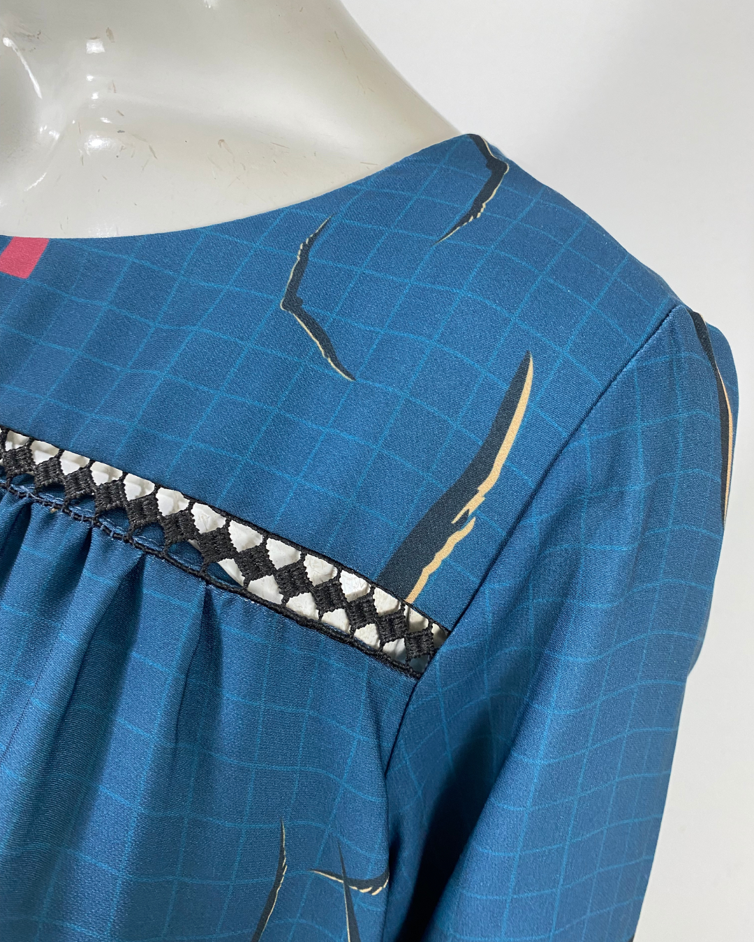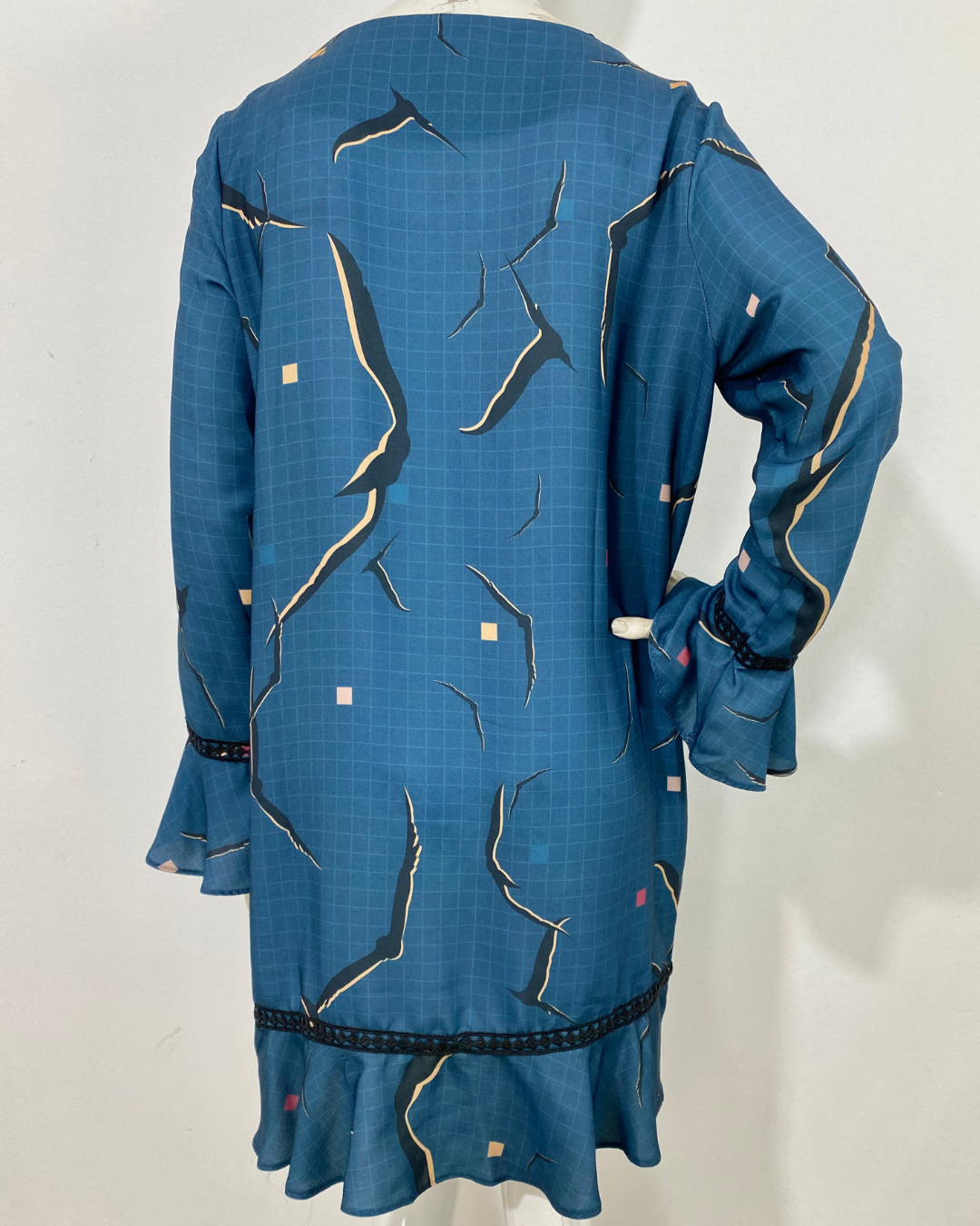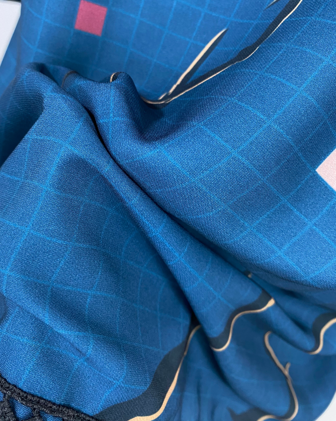 Vestido na cor azul petróleo, confeccionado em tecido leve, com mix de estampas em xadrez e pássaros. Possui modelagem reta, caimento solto ao corpo, mangas longas e acabamento com babados nos punhos e na barra. Não possui forro, porém o tecido não apresenta transparência. O fechamento é realizado por botões em um dos ombros.