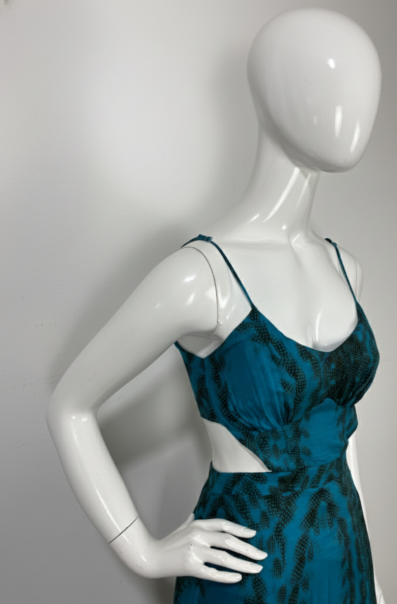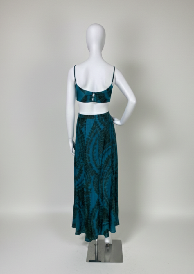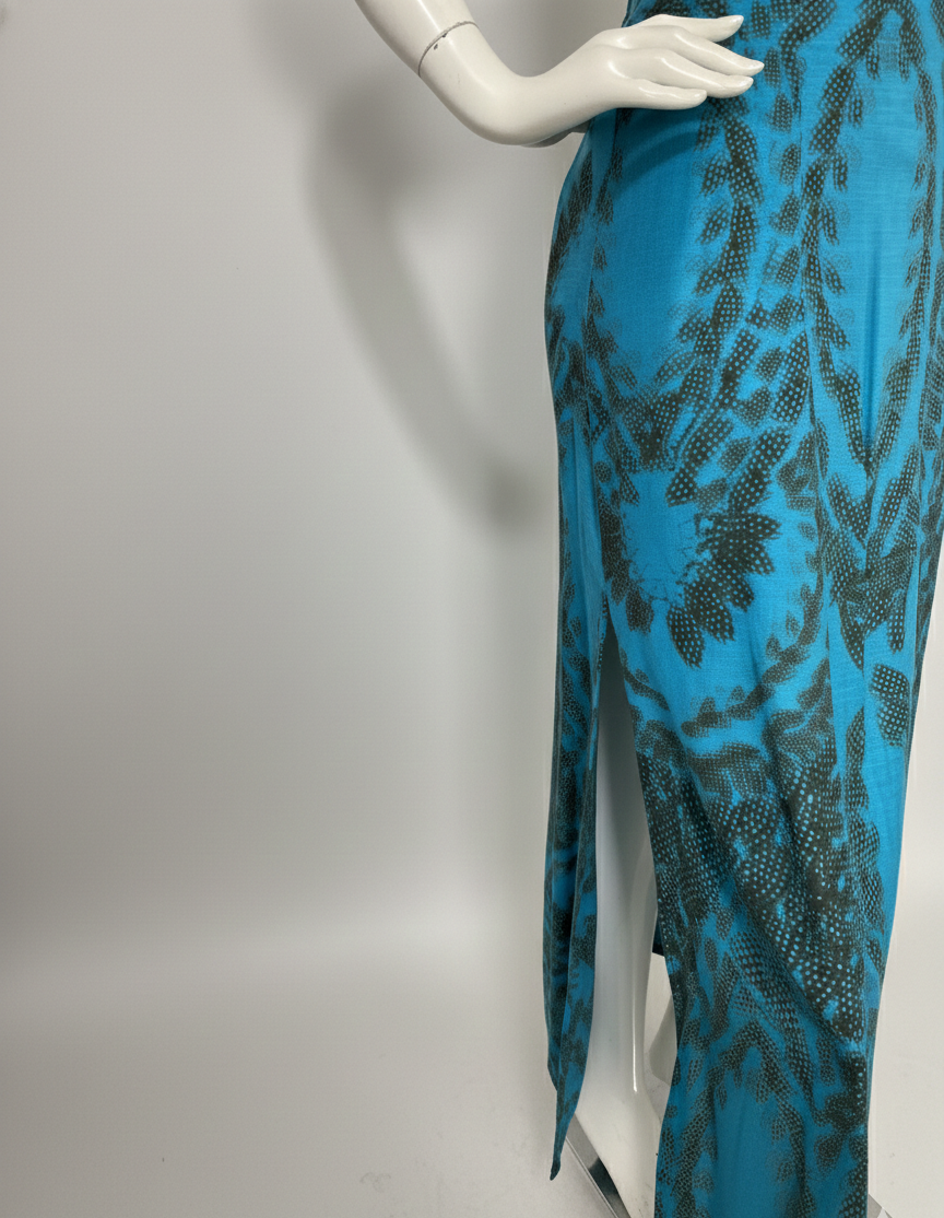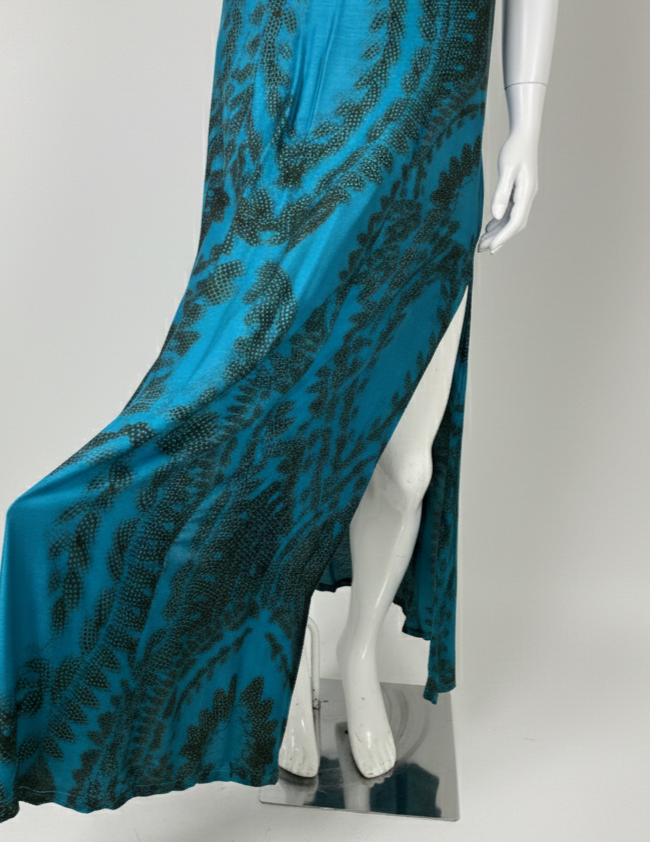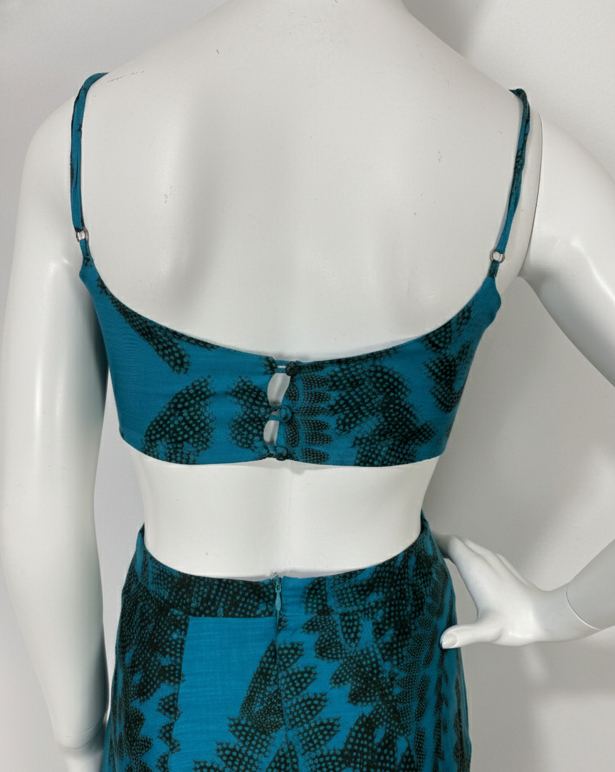 Vestido longo em viscose e seda, com estampa exclusiva. Apresenta fendas na cintura e nas laterais da saia, alças finas reguláveis e forro no busto e parte da saia. Fechamento posterior com zíper e botões para ajuste seguro.