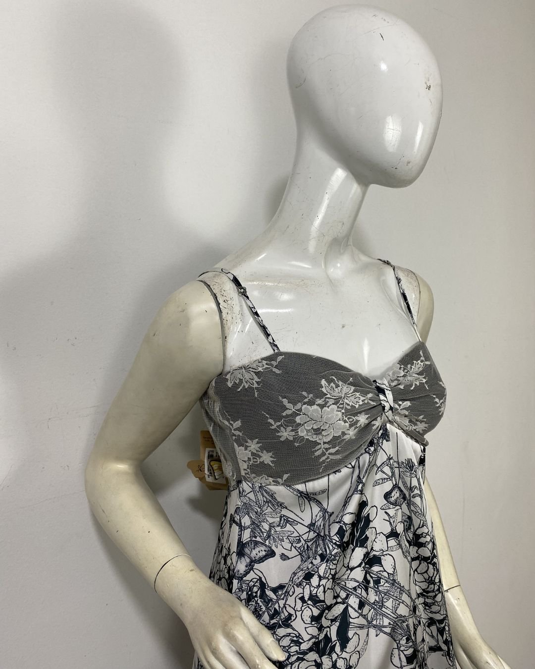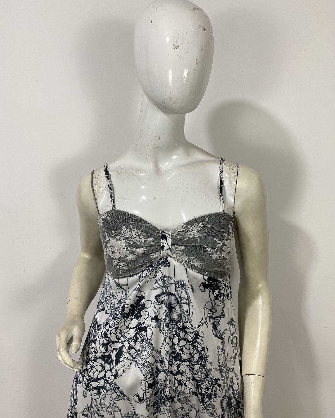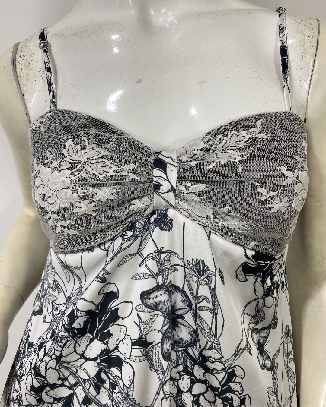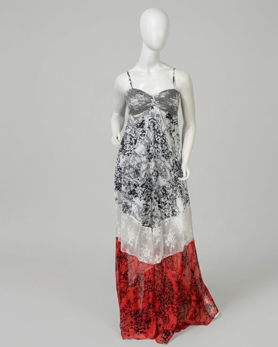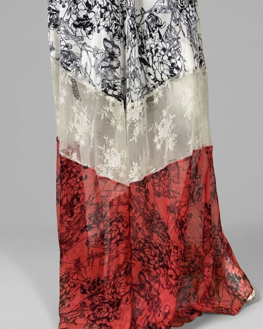 Vestido longo com mix de tecidos (cetim, chiffon e renda) e cores. O modelo e sedoso e fluído com uma peça de seda. Possui elástico em todo o decote, garantindo que fique firme e sustente o busto. Fechamento atrás em zíper. Alças finas reguláveis. Possui forro. Essa peça custa R$360,00 na loja da marca.