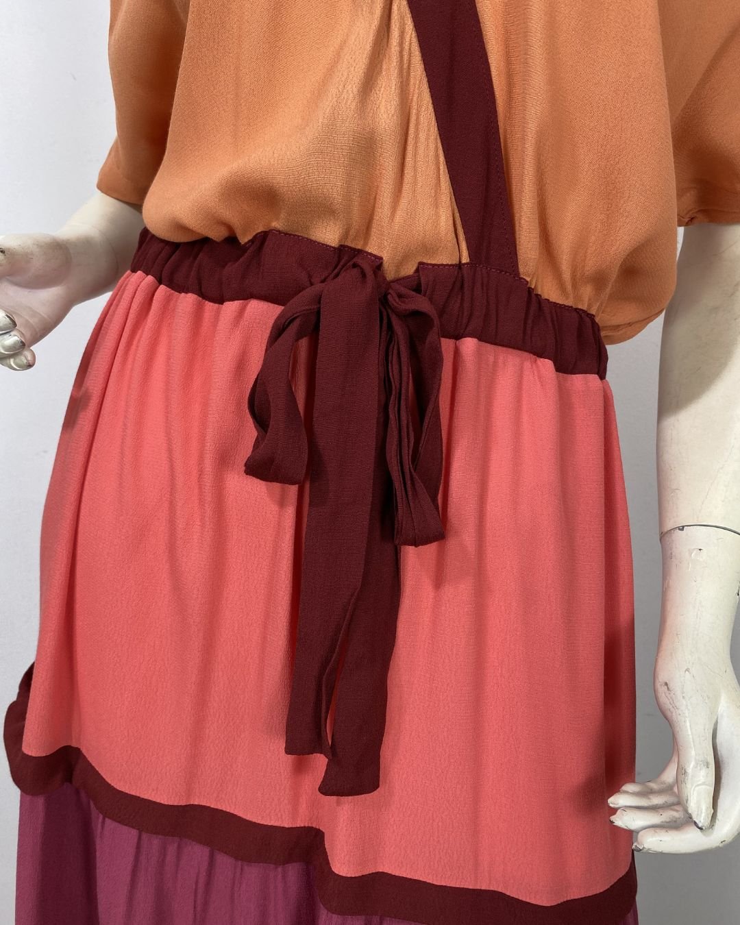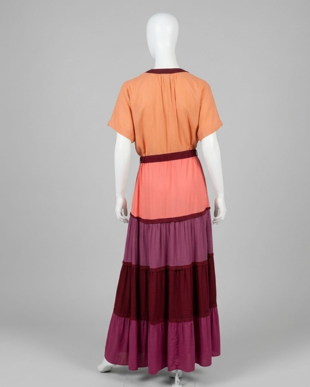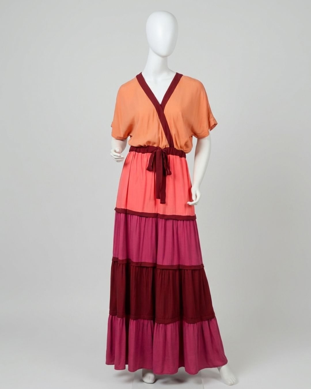 Vestido longo em crepe, com mix de cores. Possui manga curta e decote em V. A cintura é ajustável. Não possui forro.