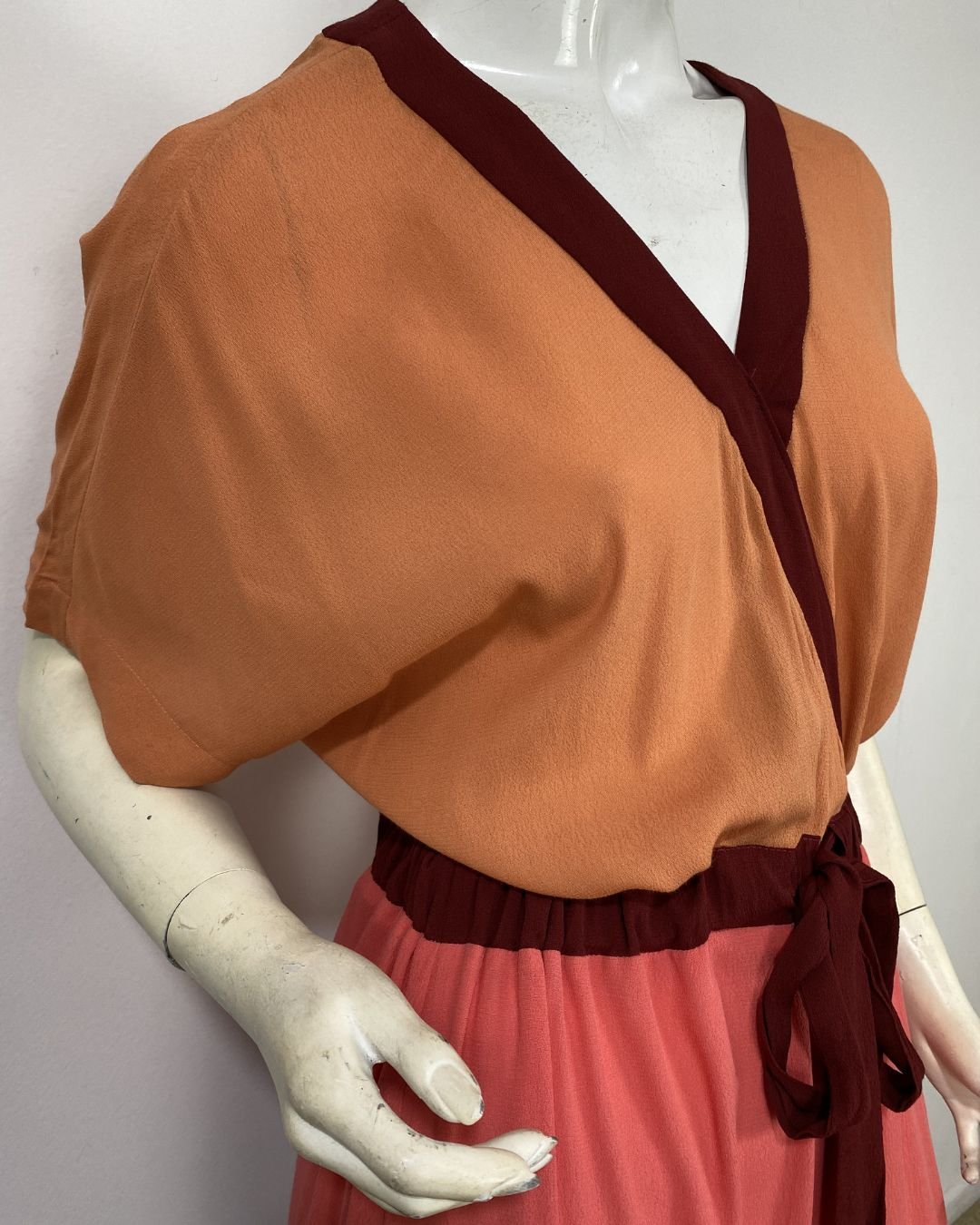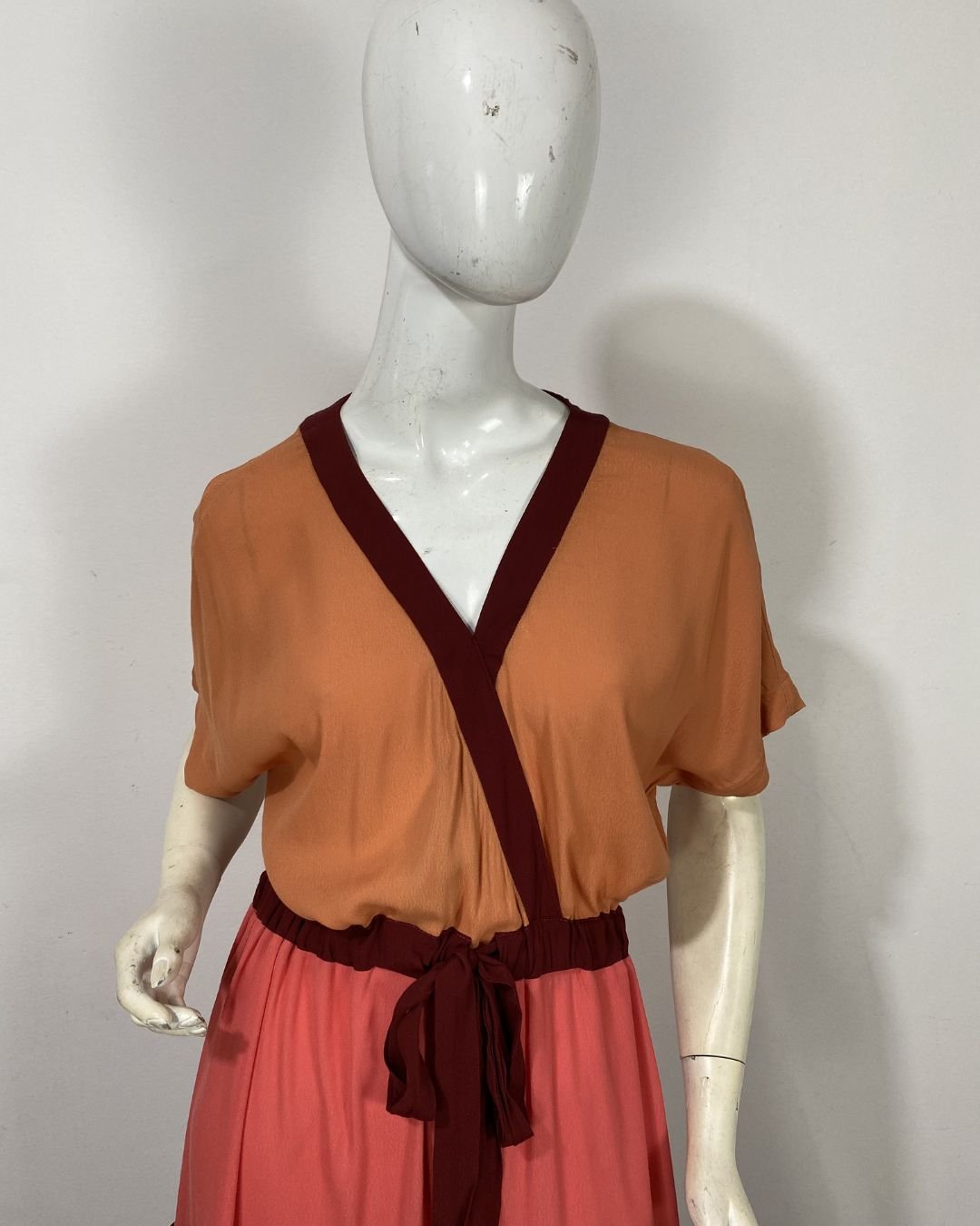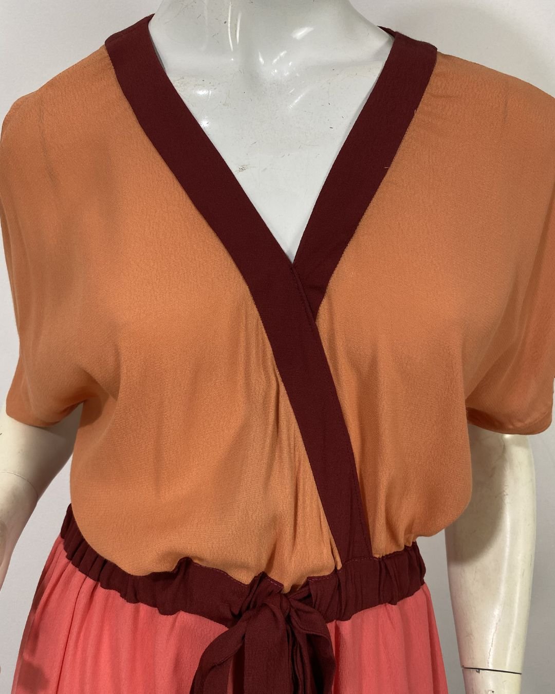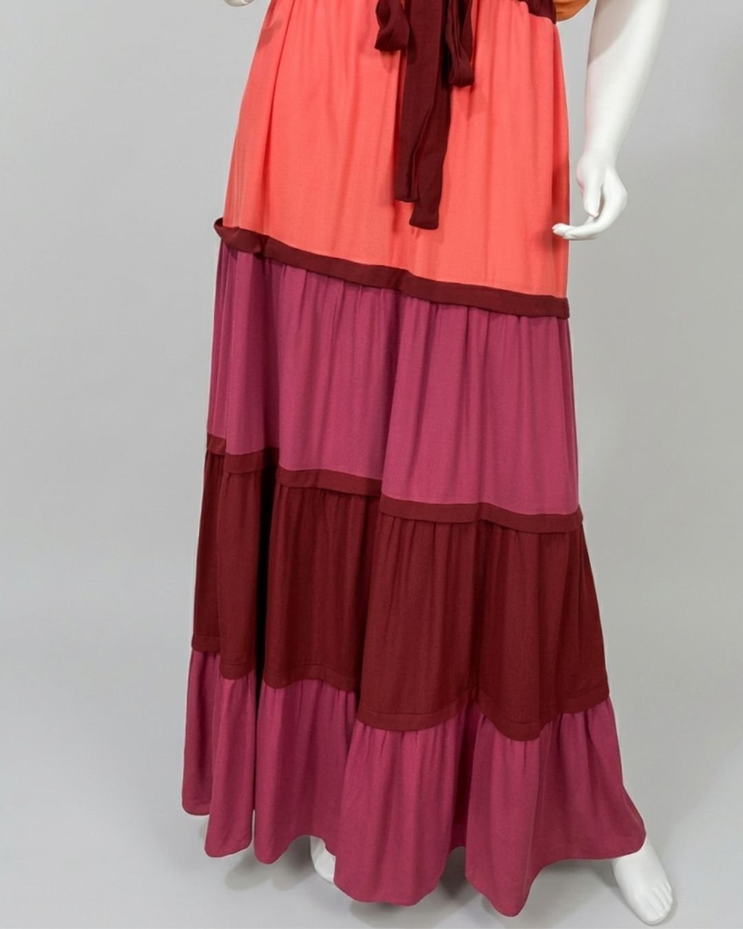 Vestido longo em crepe, com mix de cores. Possui manga curta e decote em V. A cintura é ajustável. Não possui forro.