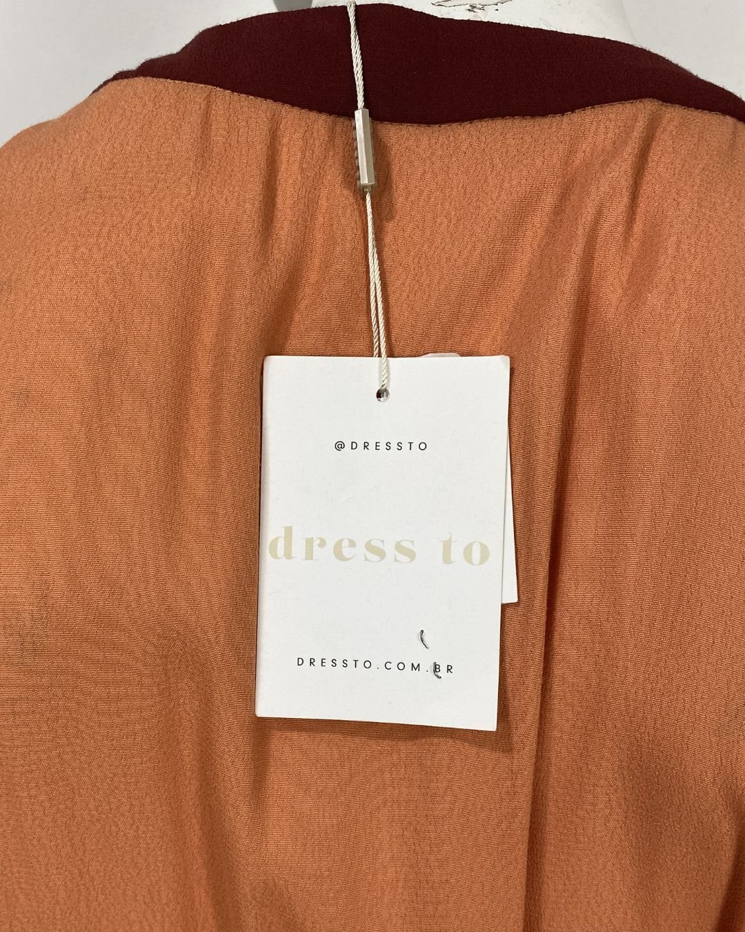A etiqueta da marca mantém-se fixada e o valor desse vestido na marca varia entre R$530,00 a R$750,00.