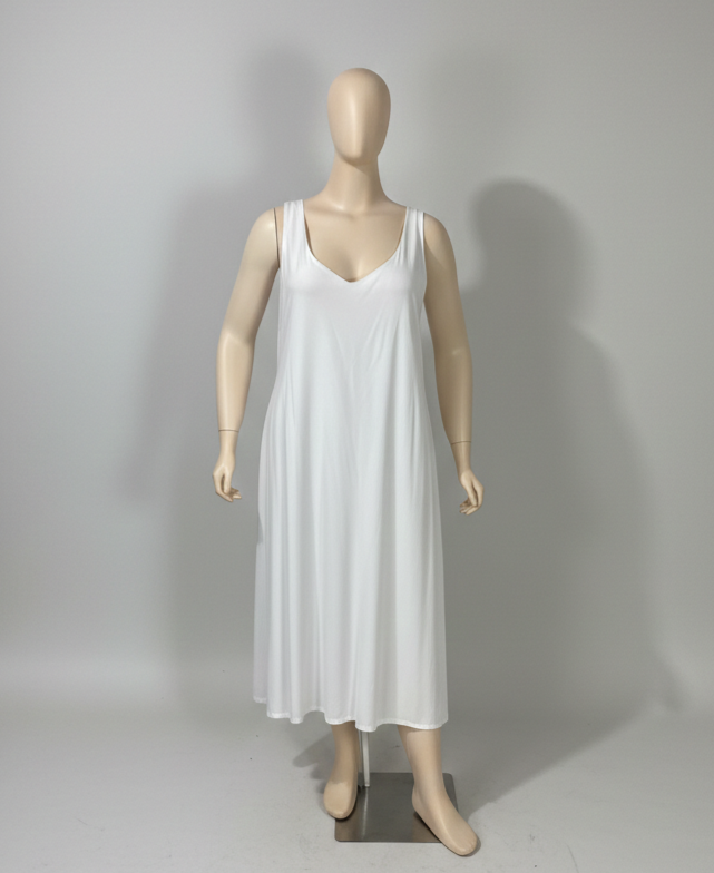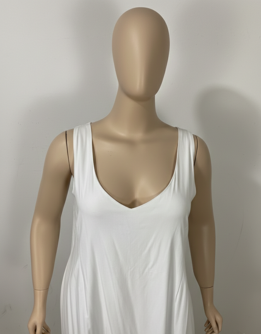 Vestido branco com comprimento midi, totalmente forrado. Possui decote em V na parte frontal e posterior, modelagem reta e fendas laterais que proporcionam leveza e movimento.