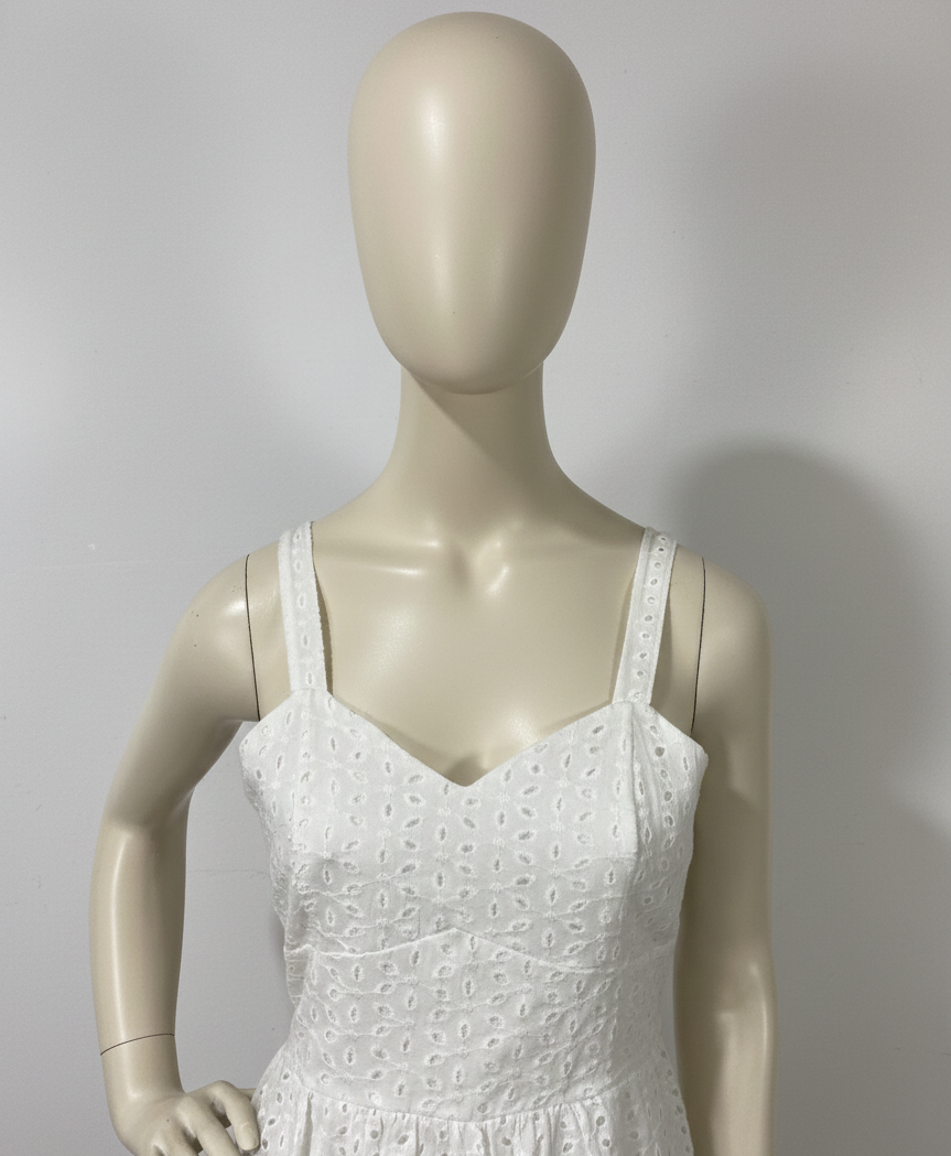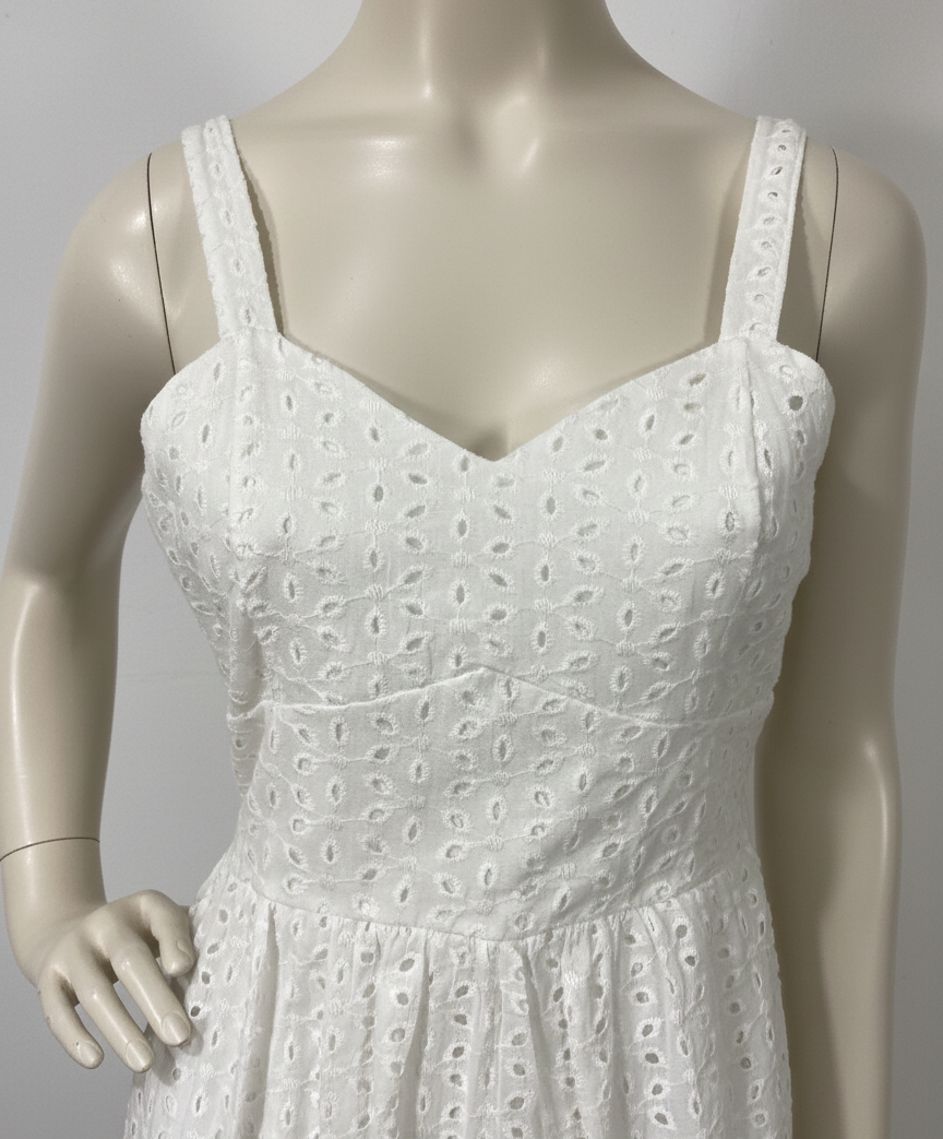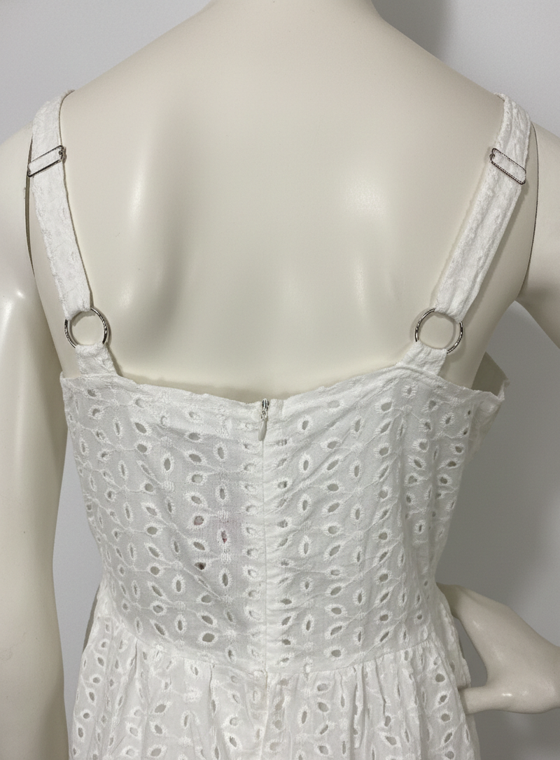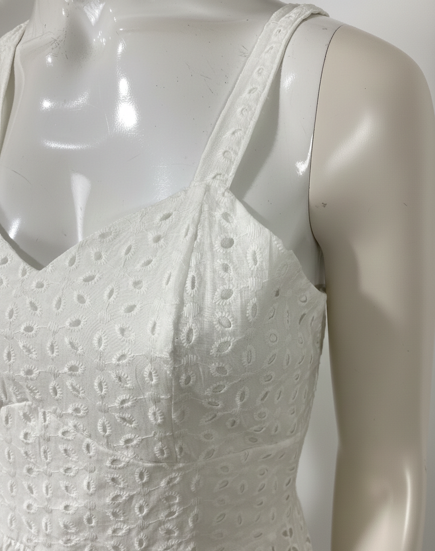 Vestido curto em laise, na cor off-white, com alças reguláveis e forro interno. Modelo leve e delicado, ideal para composições frescas e delicadas.
