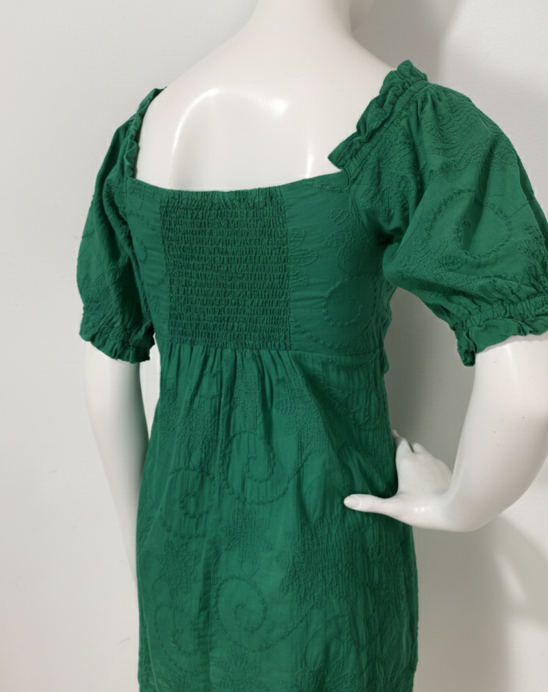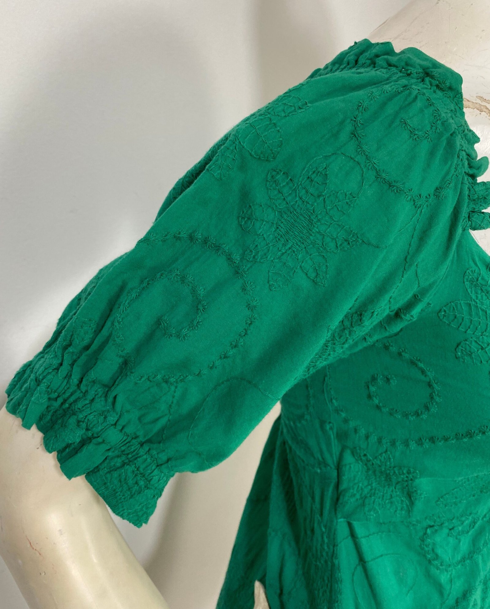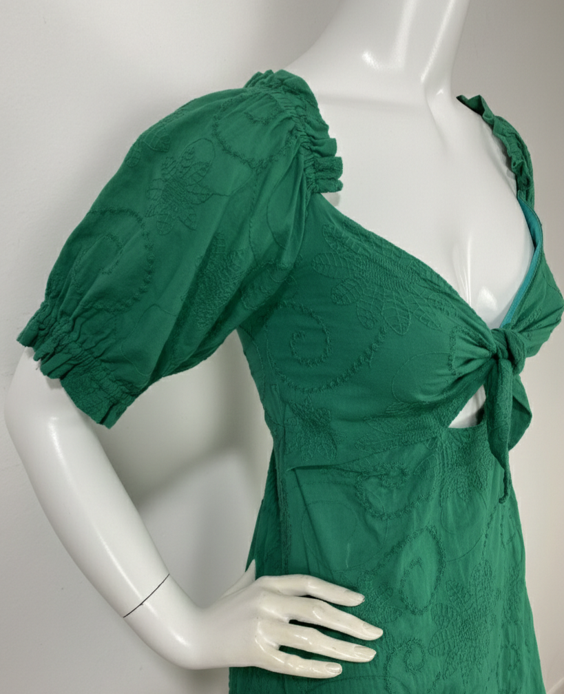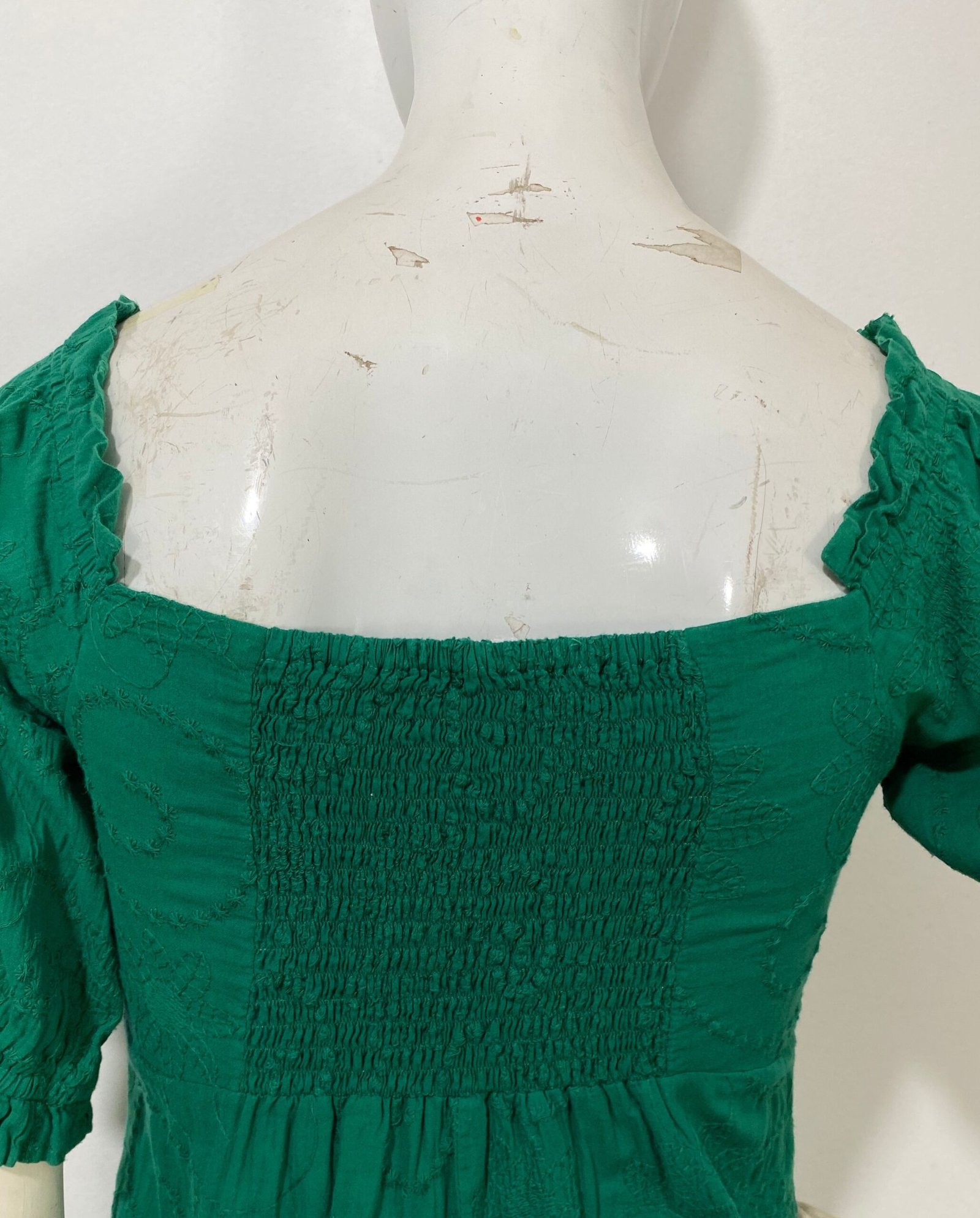 Vestido curto confeccionado em algodão com bordado à máquina. Possui elástico nos ombros e na barra das mangas, amarração com fenda frontal e acabamento em lastex nas costas, garantindo melhor ajuste ao corpo. Conta com forro na região do busto.