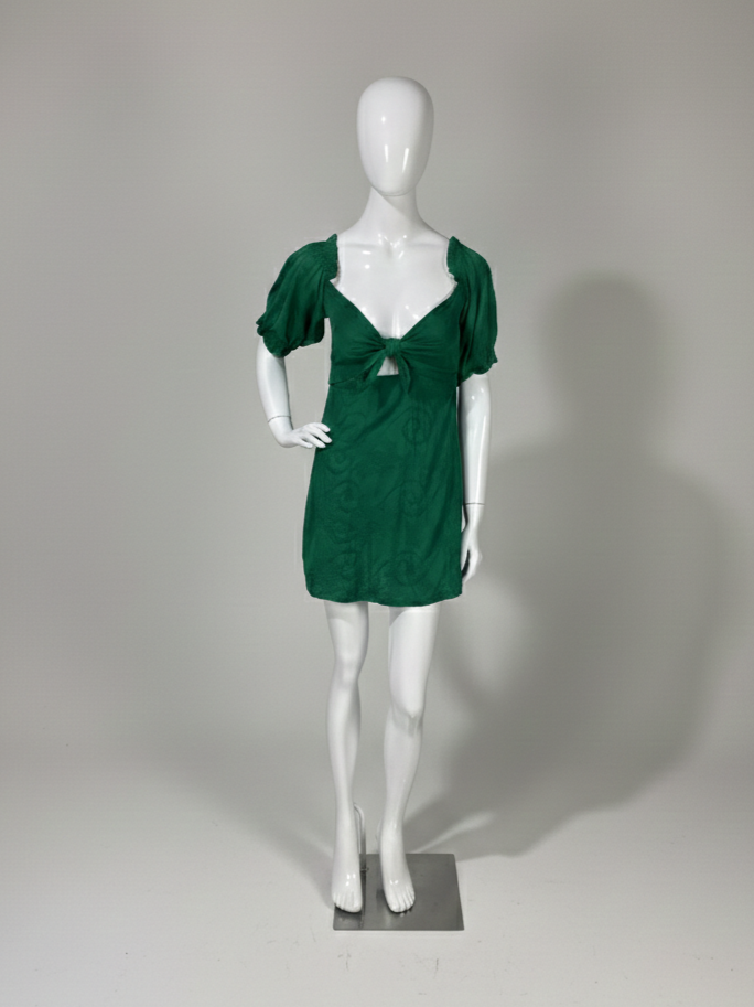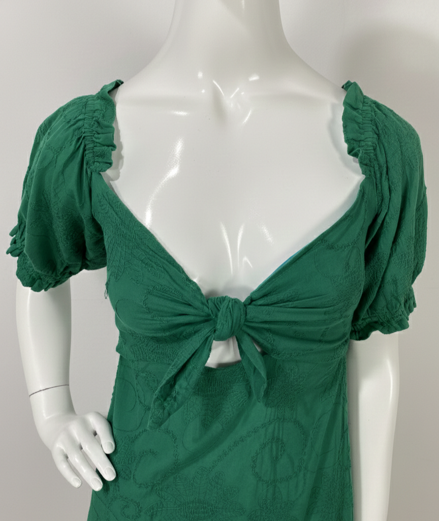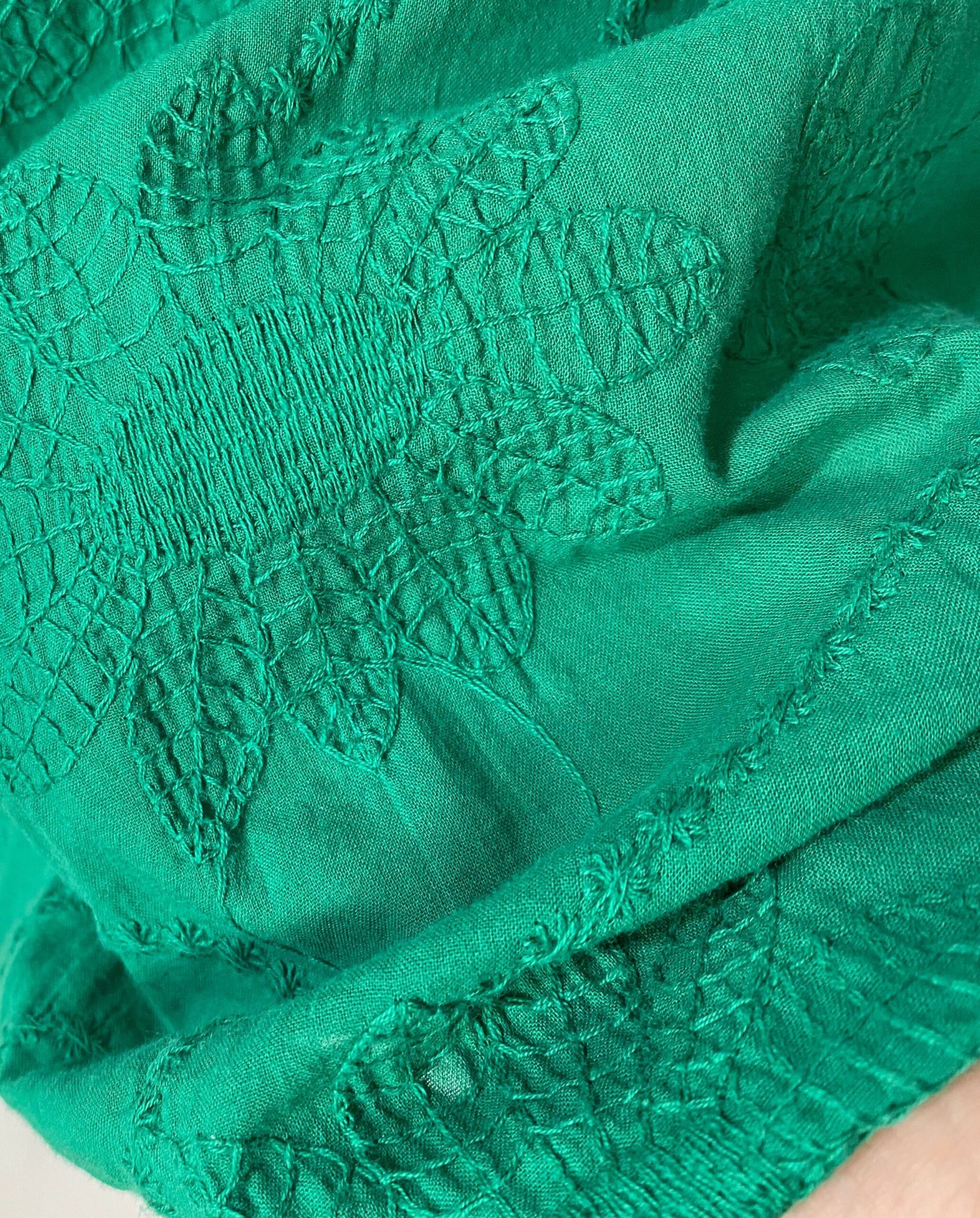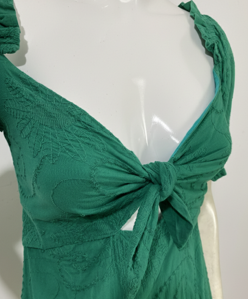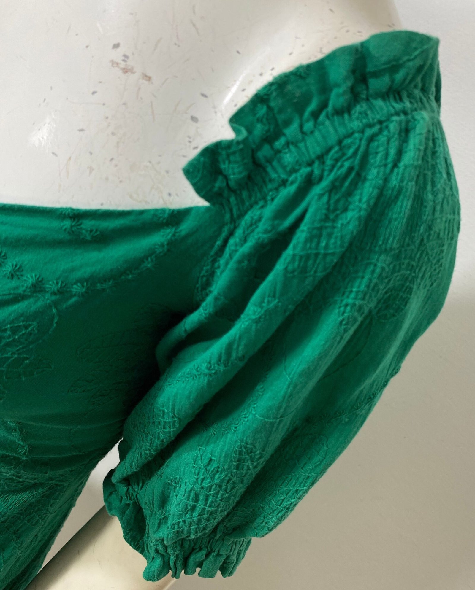 Vestido curto confeccionado em algodão com bordado à máquina. Possui elástico nos ombros e na barra das mangas, amarração com fenda frontal e acabamento em lastex nas costas, garantindo melhor ajuste ao corpo. Conta com forro na região do busto.