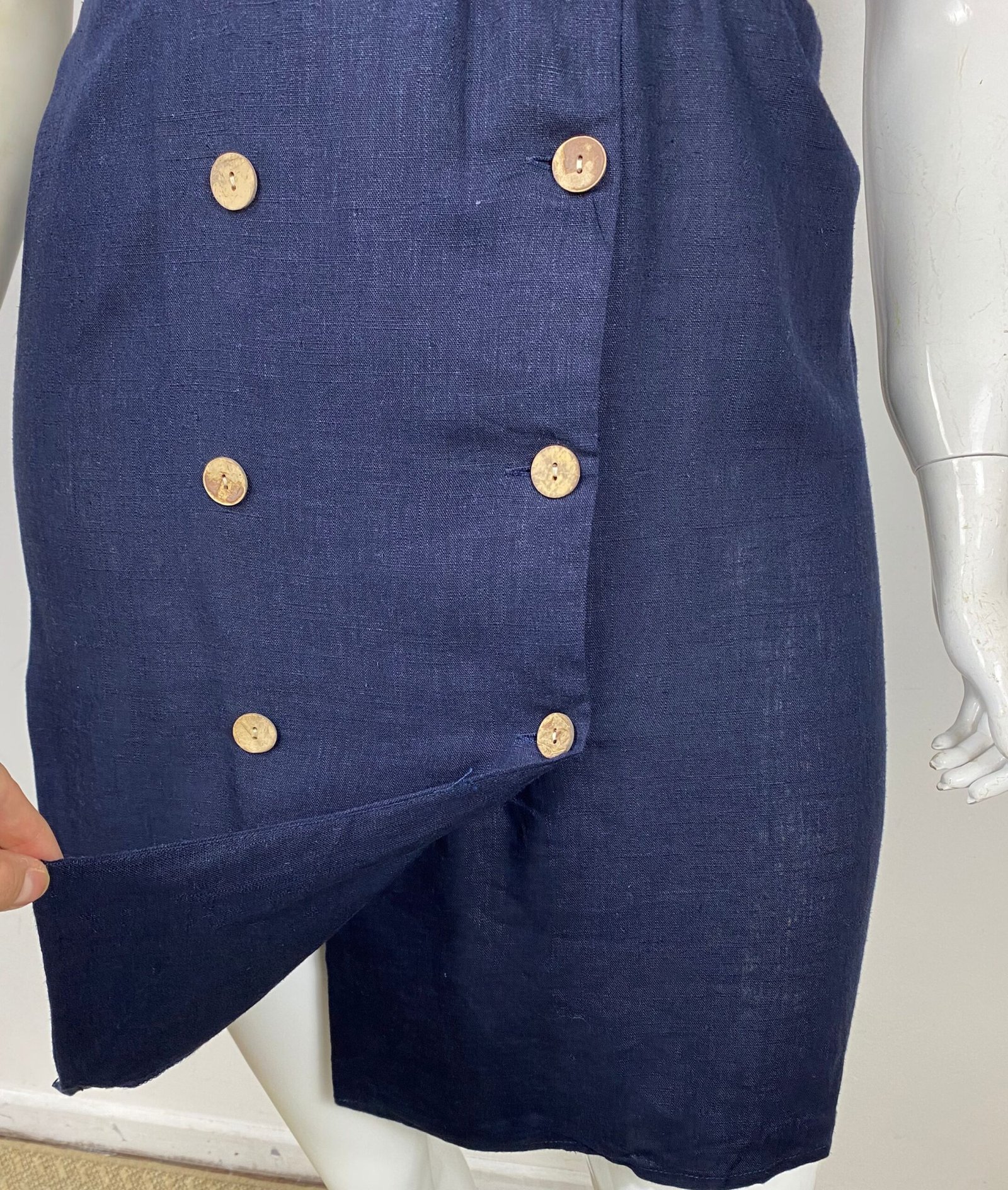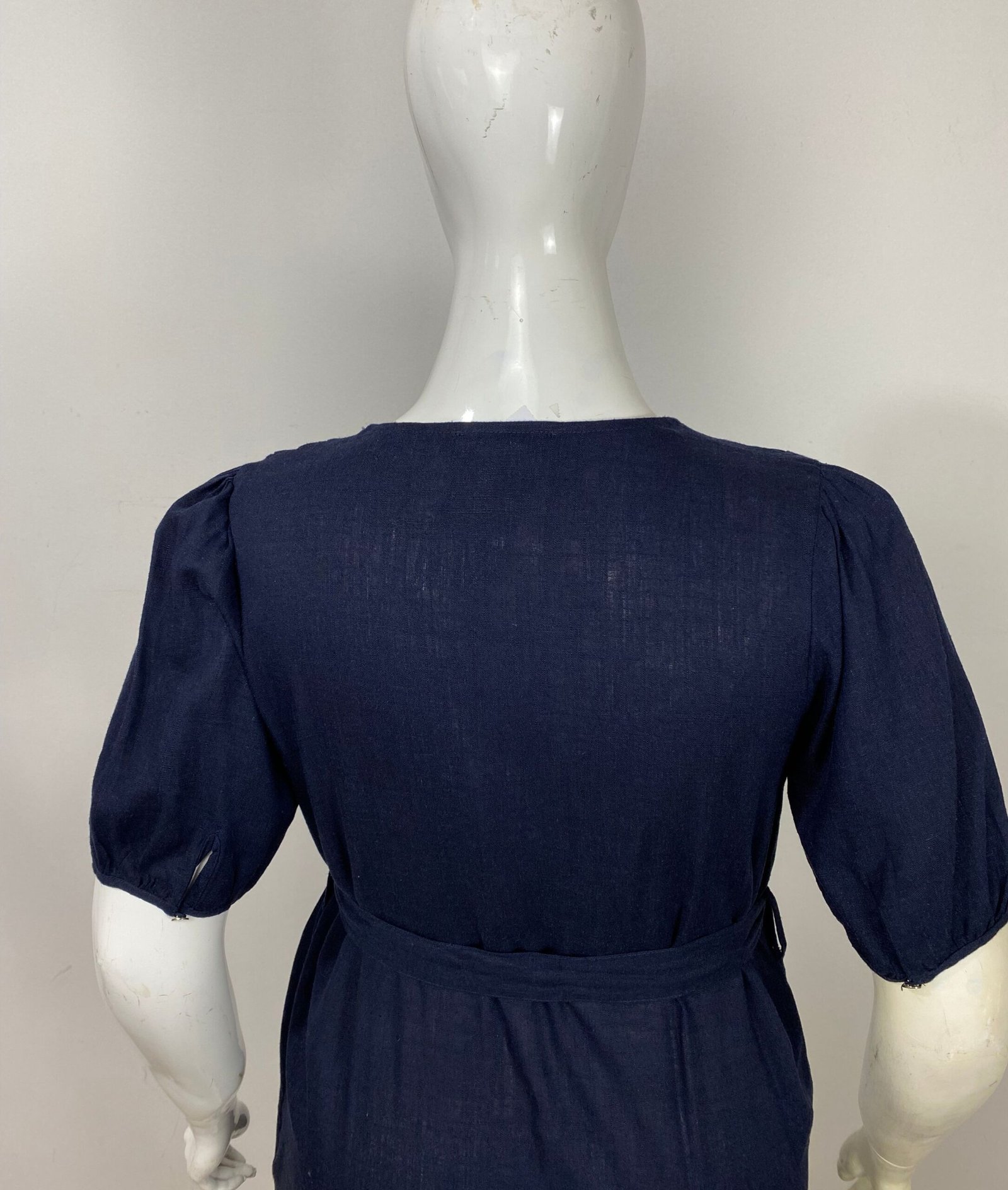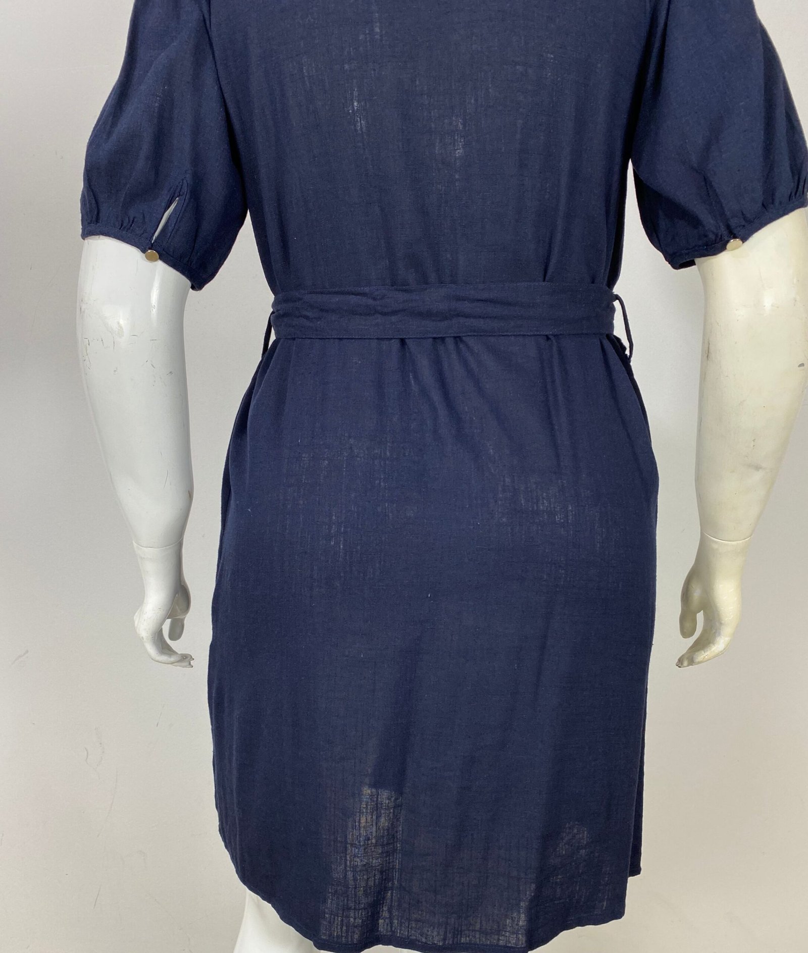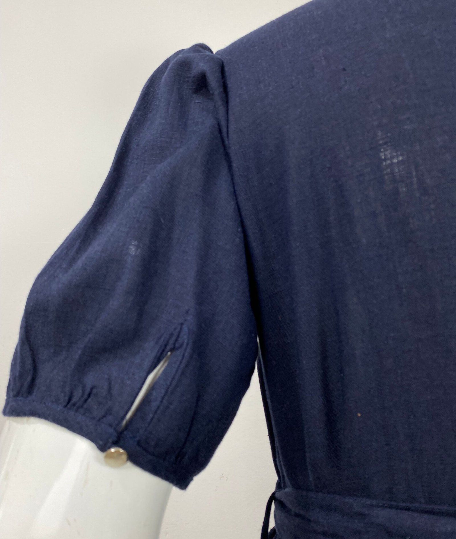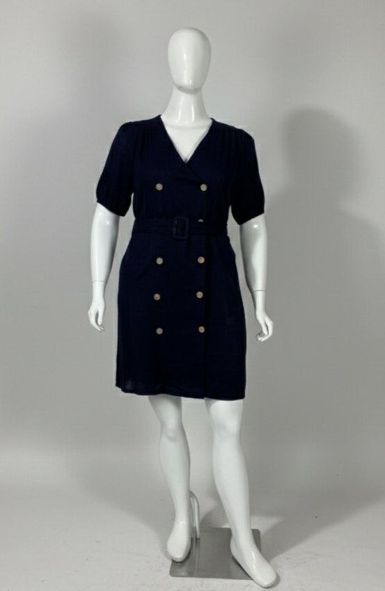 Vestido confeccionado em viscolinho na cor azul-marinho. Possui fechamento frontal duplo com botões, mangas levemente franzidas nos ombros e punhos com botão metalizado. Acompanha cinto removível do mesmo tecido, permitindo ajuste da silhueta.